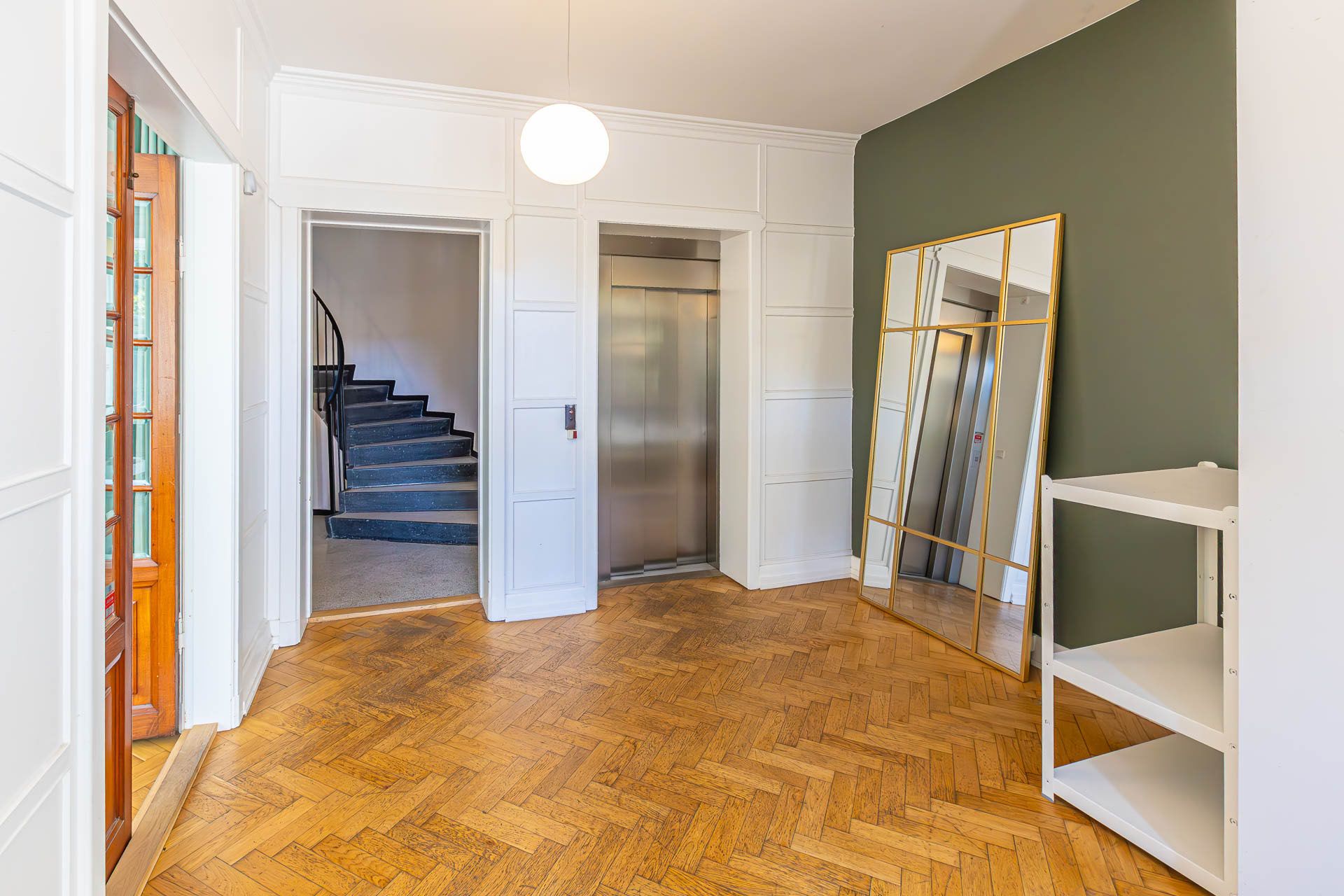 Sjældent udbudt lejemål på toppen af Frederiksberg. Fra ejendommens flotte og præsentable indgangsparti tilgås lejemålet enten via elevator eller en smuk rustik spindeltrappe.