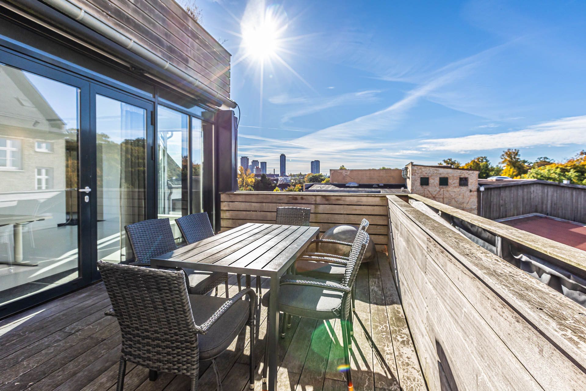 Fra elevatoren er der desuden adgang til ejendommens fælles tagterrasse, som har en fantastisk udsigt over Frederiksberg og København.