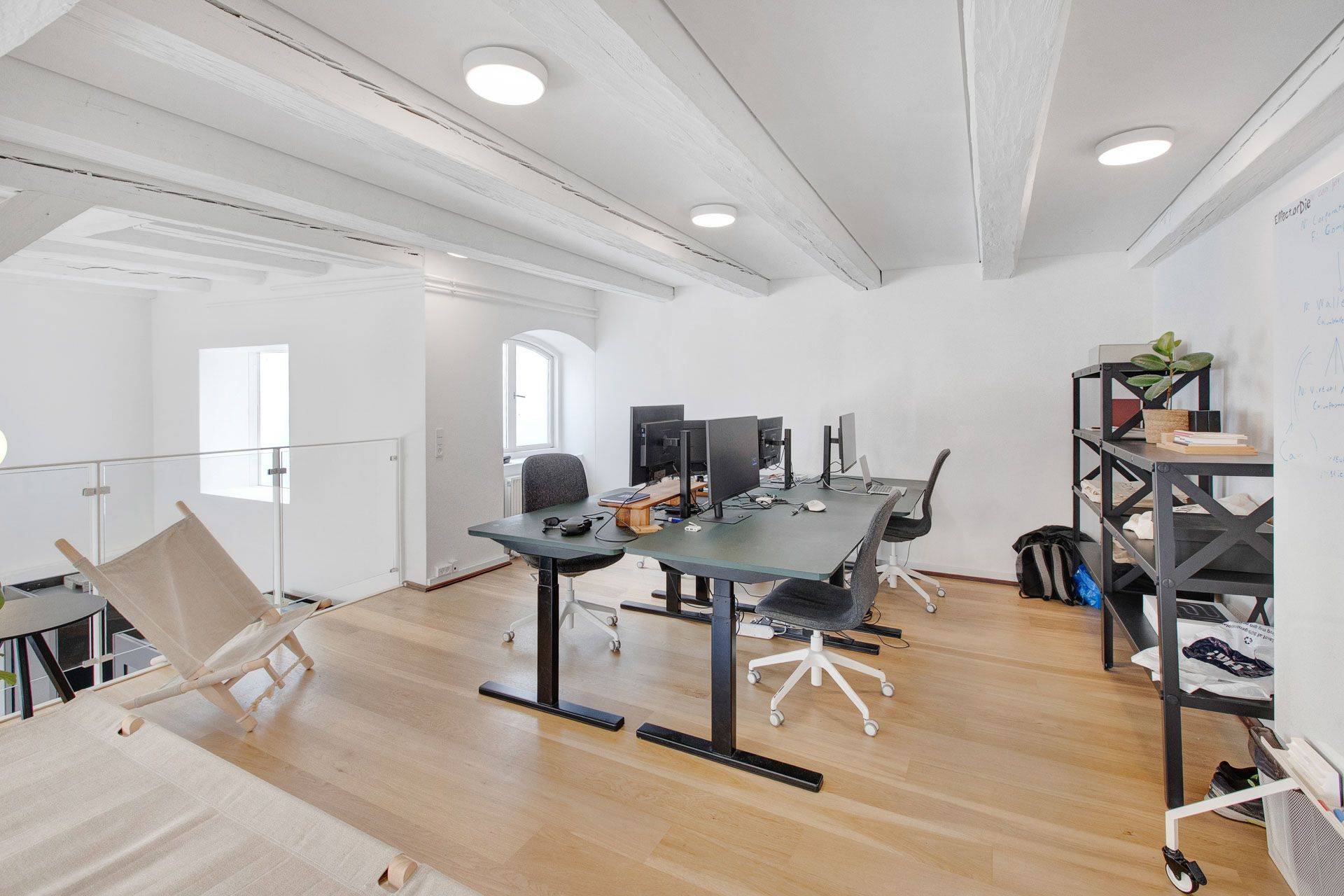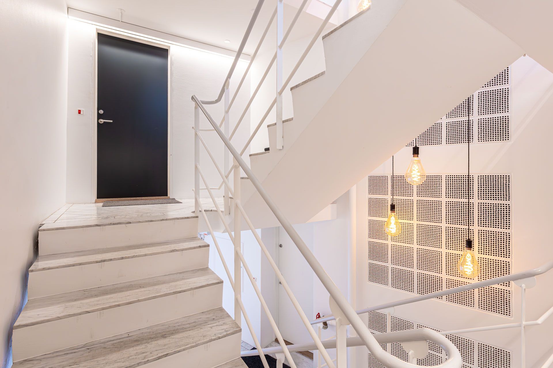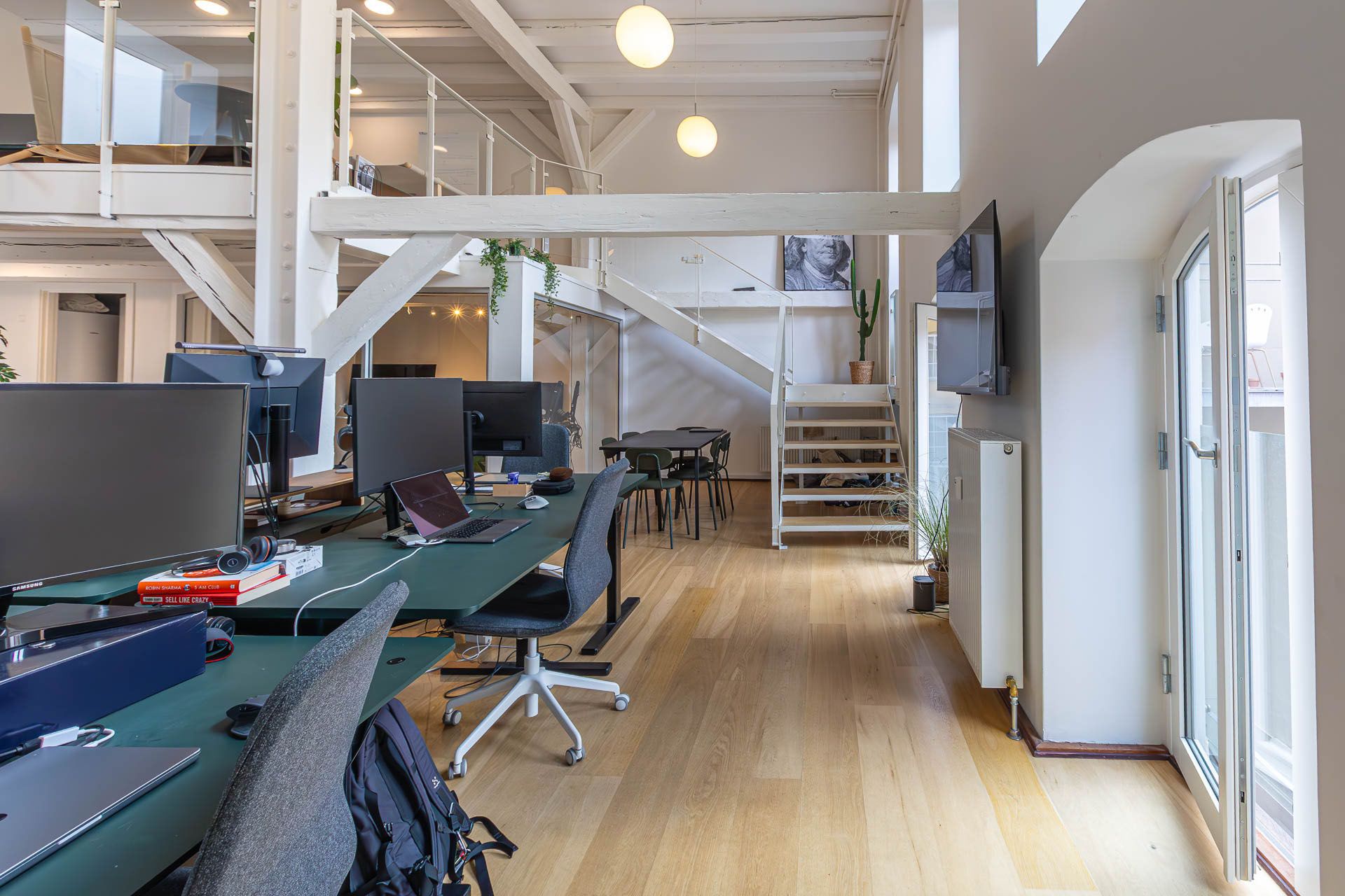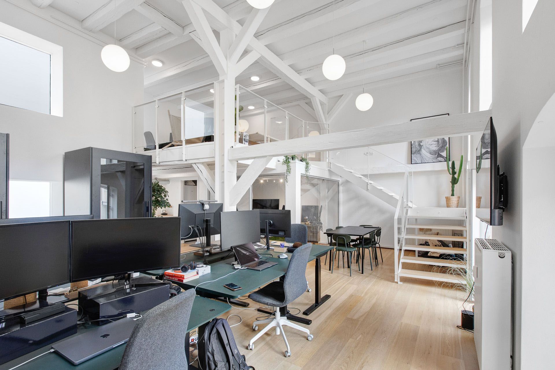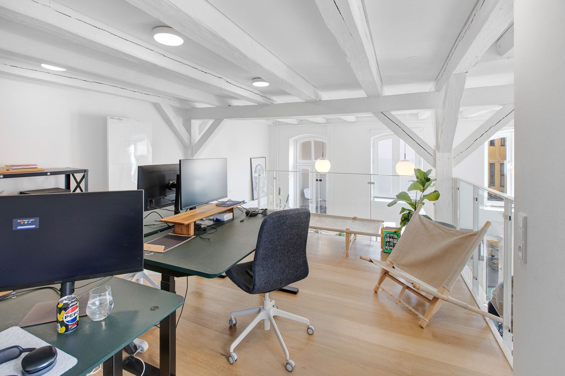Flot og indbydende kontor på 128 m². Lejemålet er beliggende på 2. sal og har en stor og højloftet hems med masser af dagslys med plads til flere arbejdspladser.