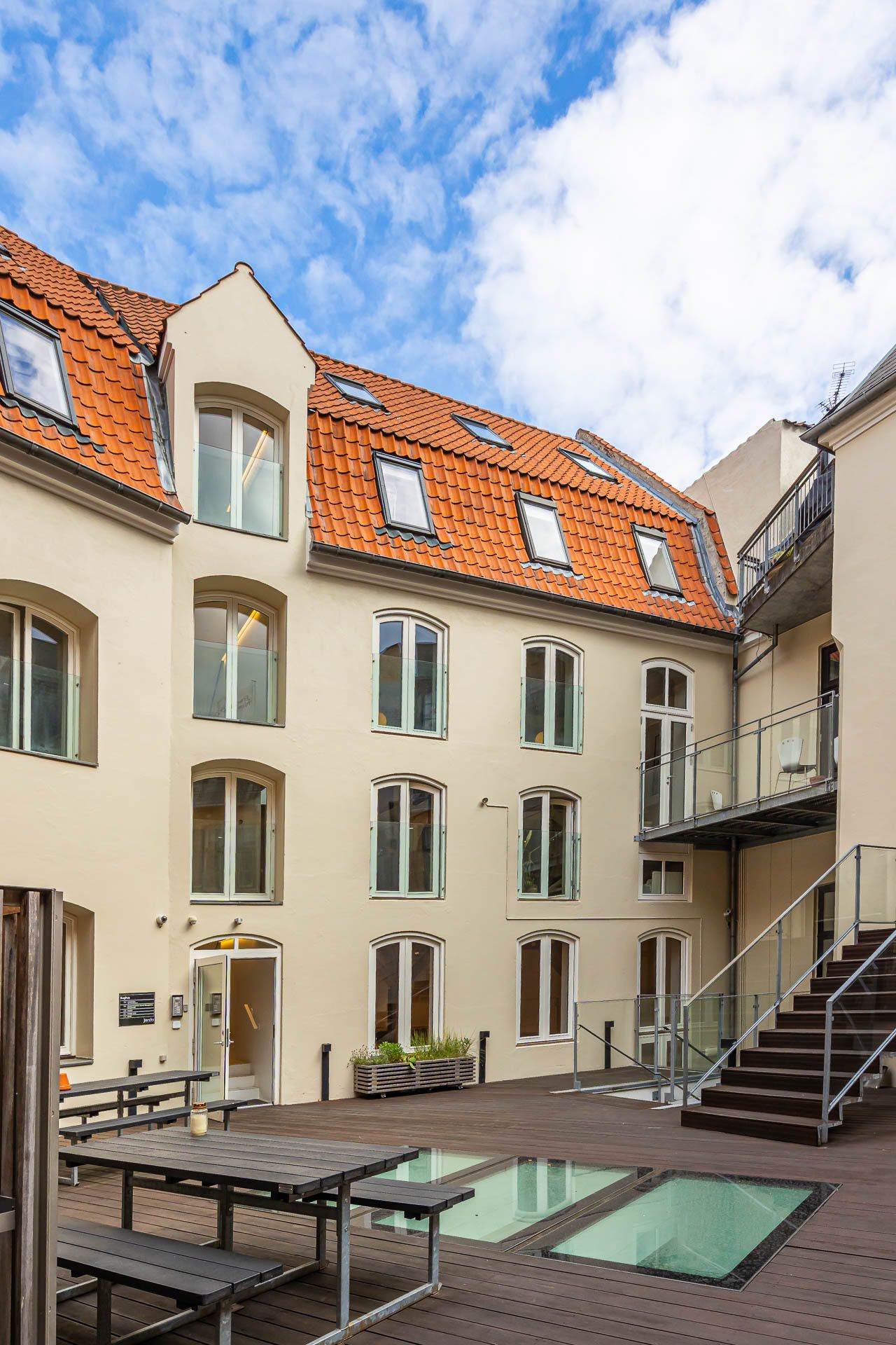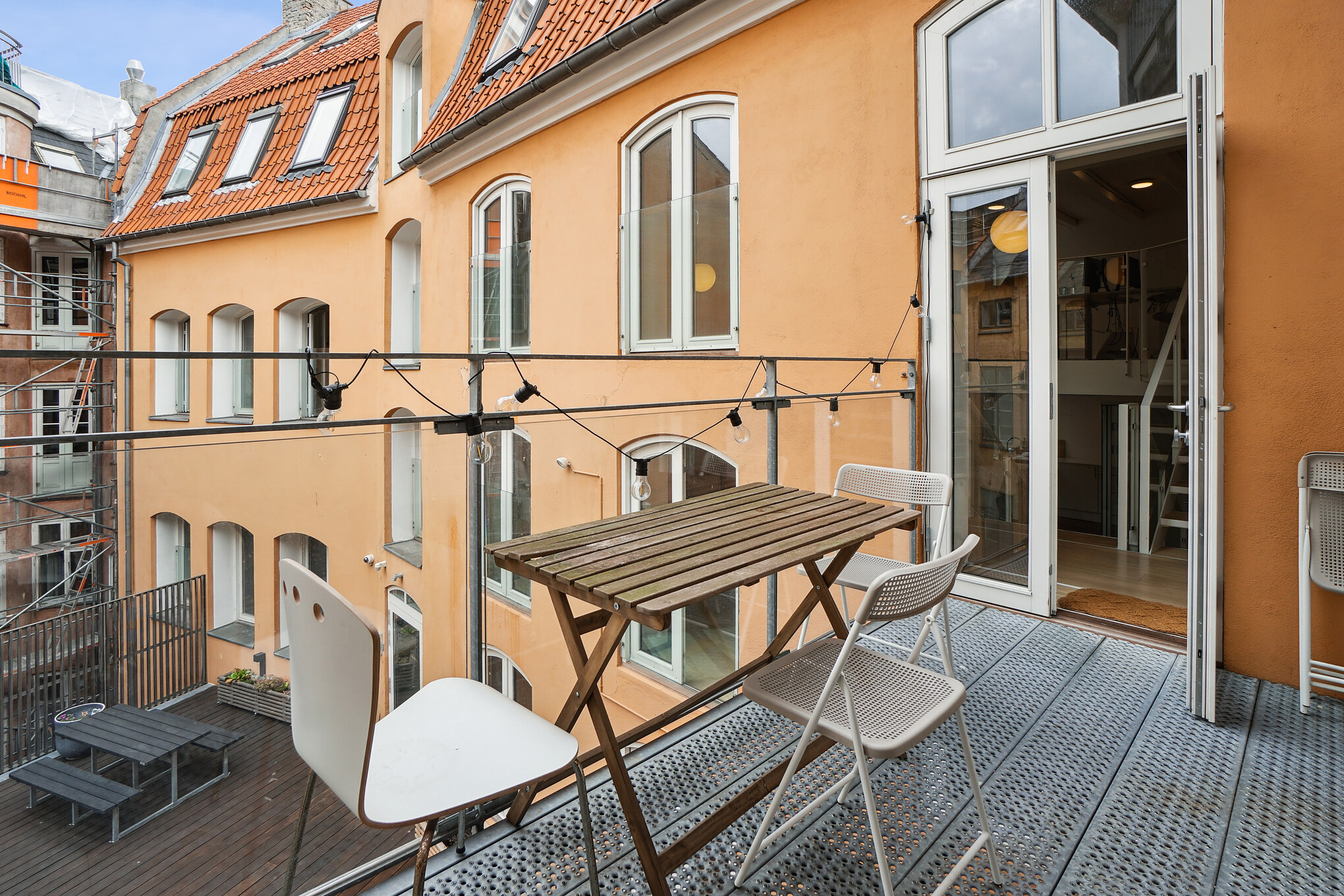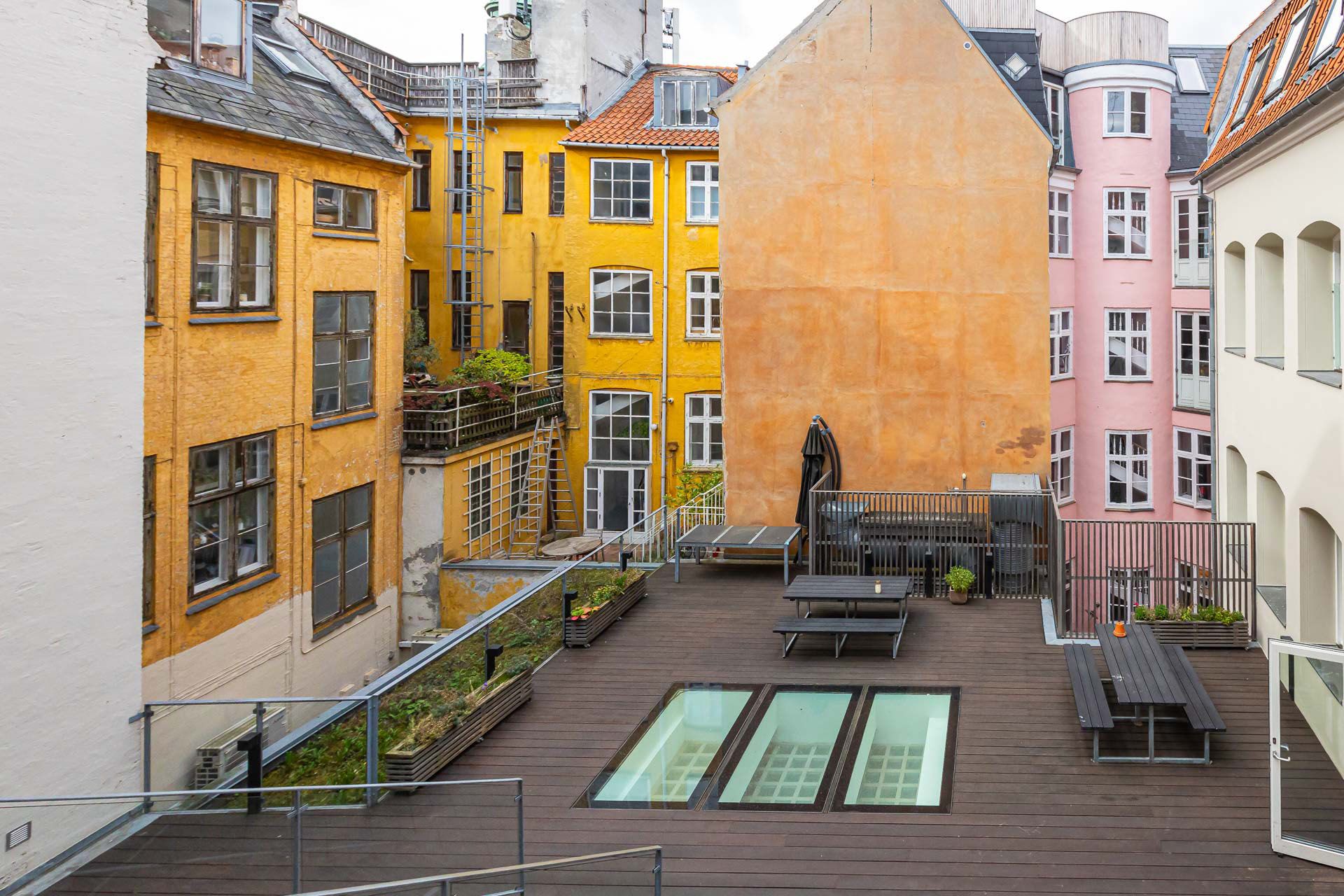 Som lejer har man adgang til større fælles tagterrasse. Lejemålet ligger roligt i en gård, men har bylivet som nærmeste nabo.