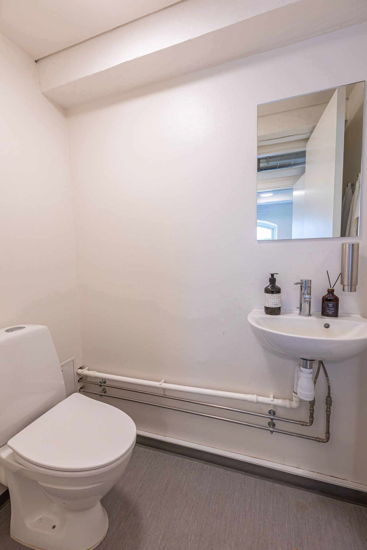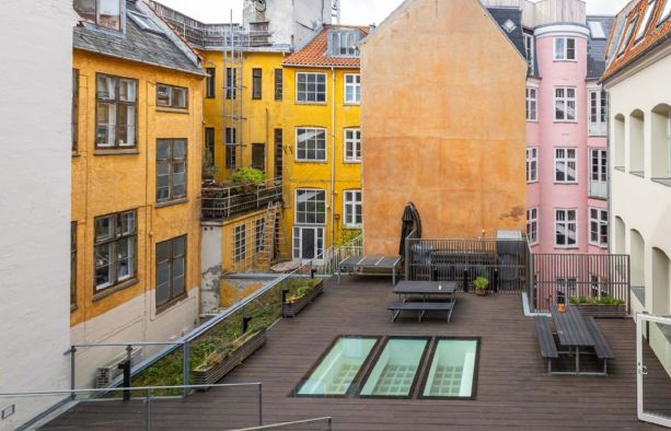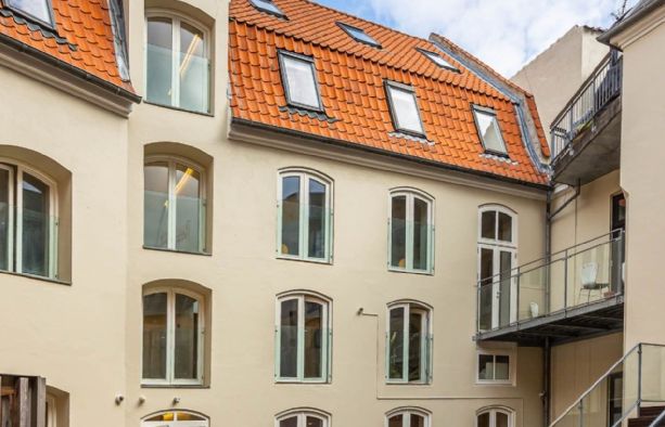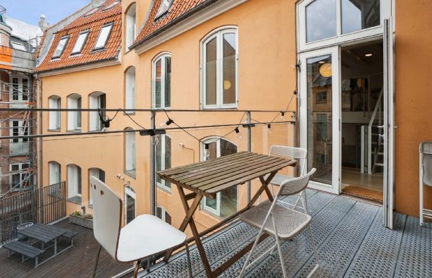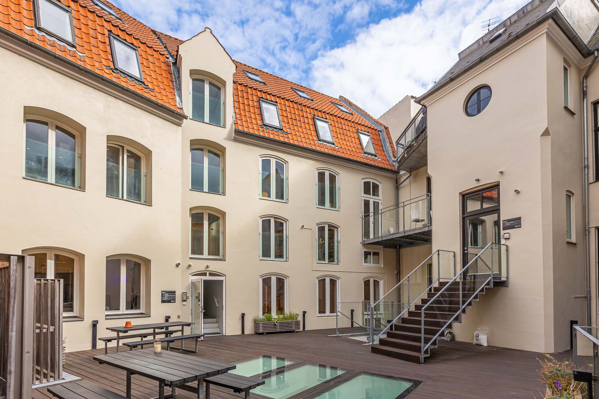 Som lejer har man adgang til større fælles tagterrasse. Lejemålet ligger roligt i en gård, men har bylivet som nærmeste nabo.