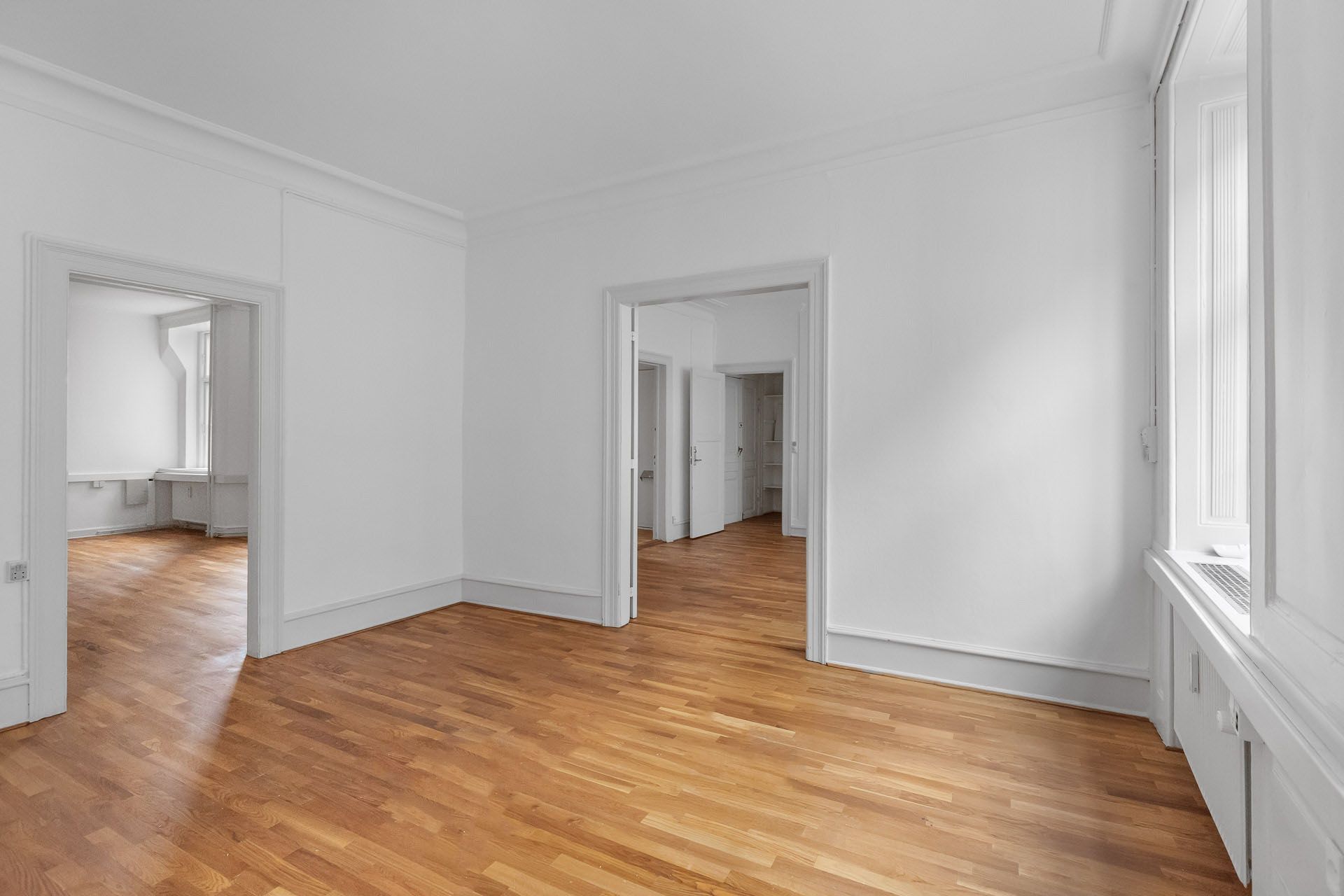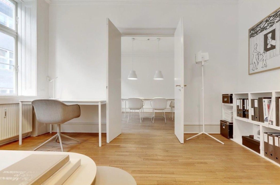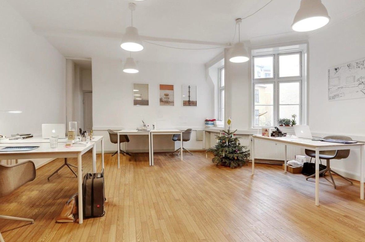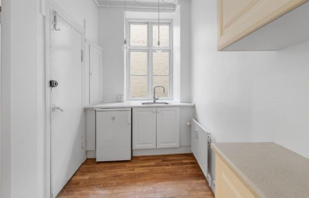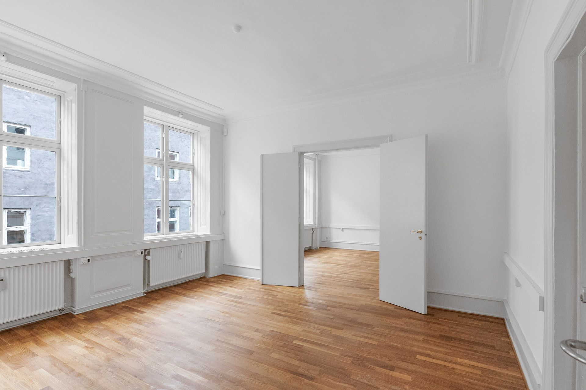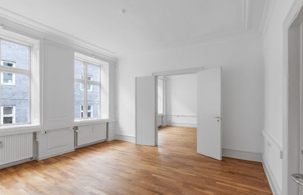 Lyst og indbydende lejemål, der indeholder møblérbar entré 3 kontorer/ mødelokaler i varierende størrelser, hvoraf de to er adskilt af dobbelte fløjdøre, storrumskontor mod gården, køkken samt toilet og bad.