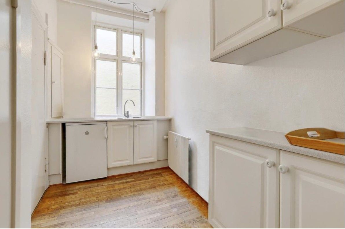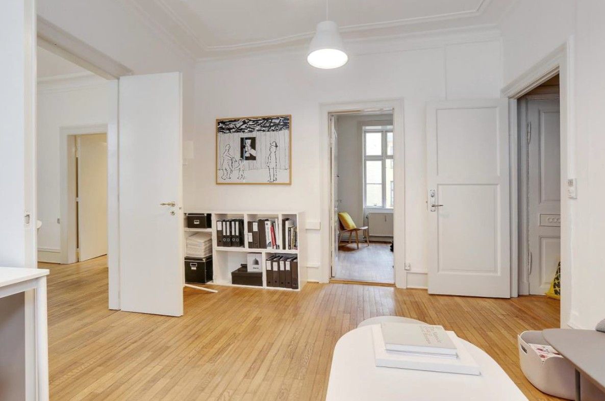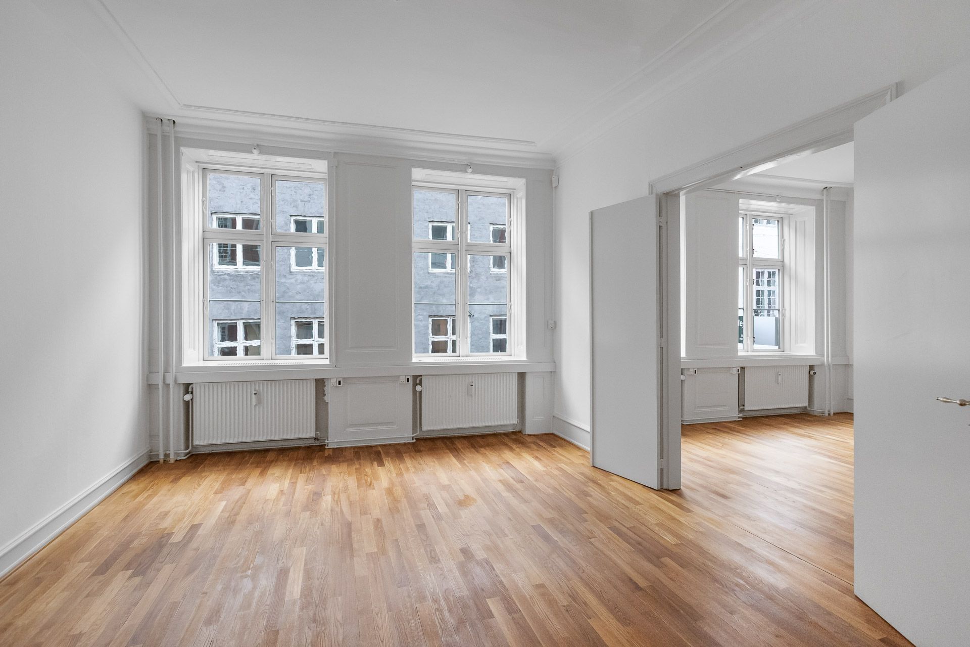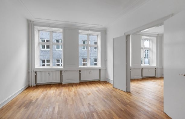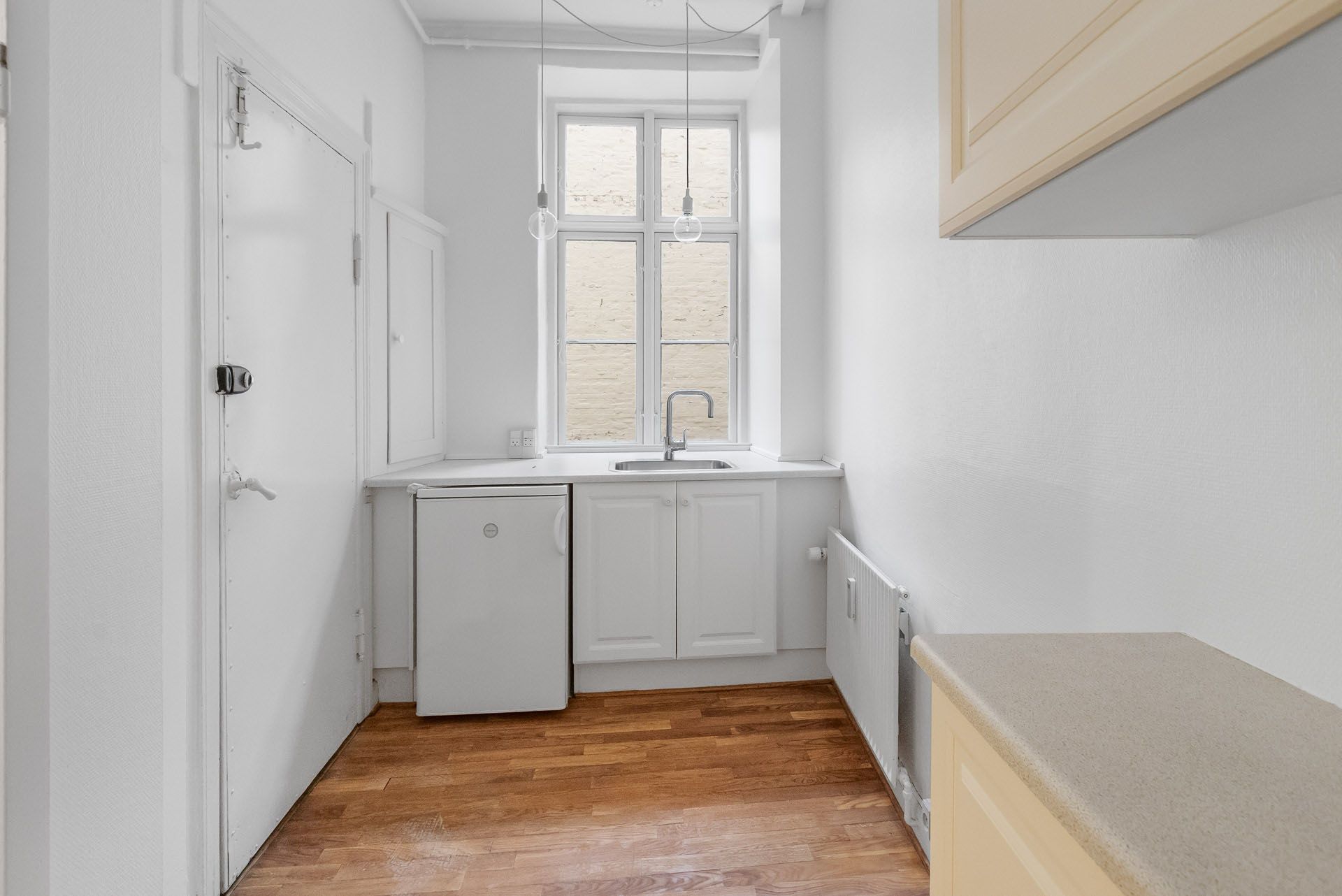 Lyst og indbydende lejemål, der indeholder møblérbar entré 3 kontorer/ mødelokaler i varierende størrelser, hvoraf de to er adskilt af dobbelte fløjdøre, storrumskontor mod gården, køkken samt toilet og bad.