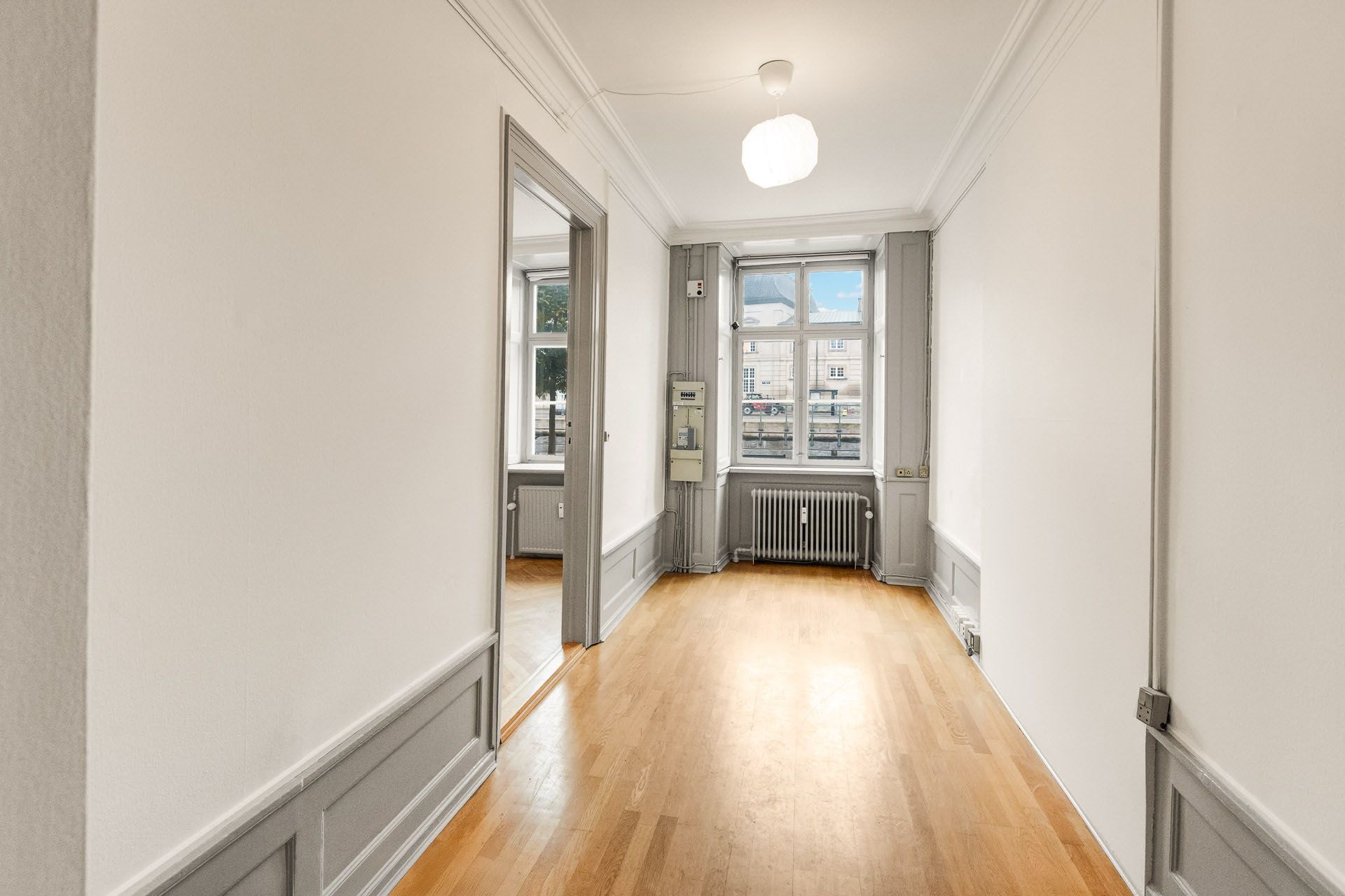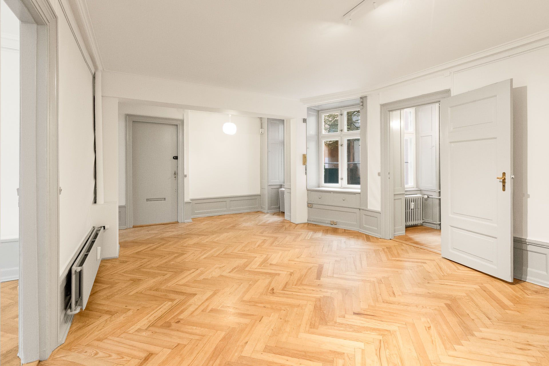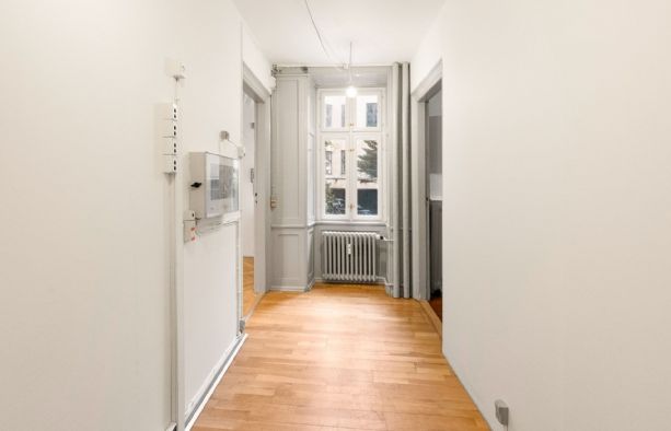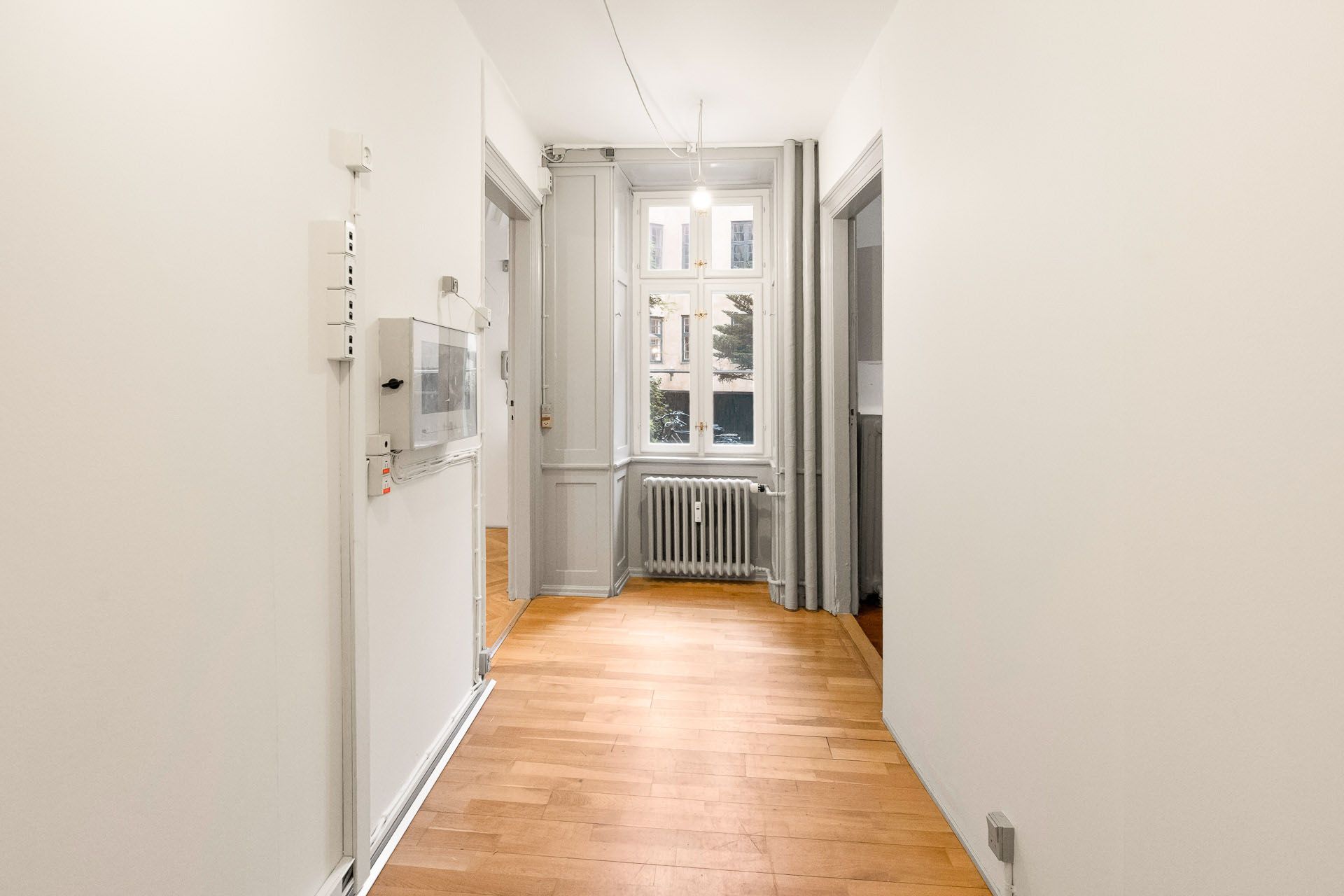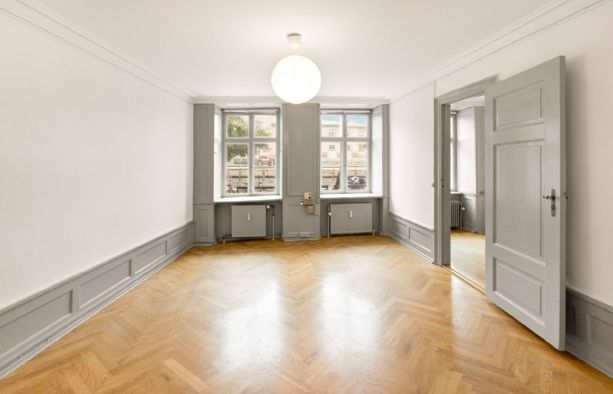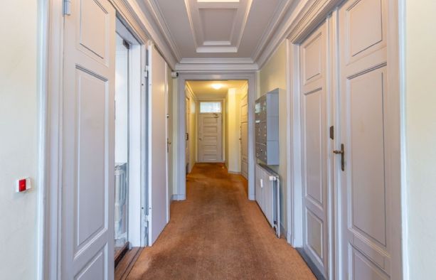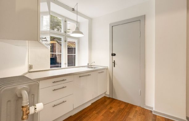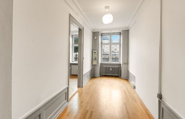 Repræsentativt indgangsparti til indbydende lejemål, som fremstår med pæne sildebensparketgulve og smukke paneler. Lejemålet er indrettet med 2 kontorer ud mod gaden og et større storrumskontor beliggende med vindue ud mod gården. Ydermere har lejemålet et mindre opbevarings-/printerlokale, samt køkken og toilet.