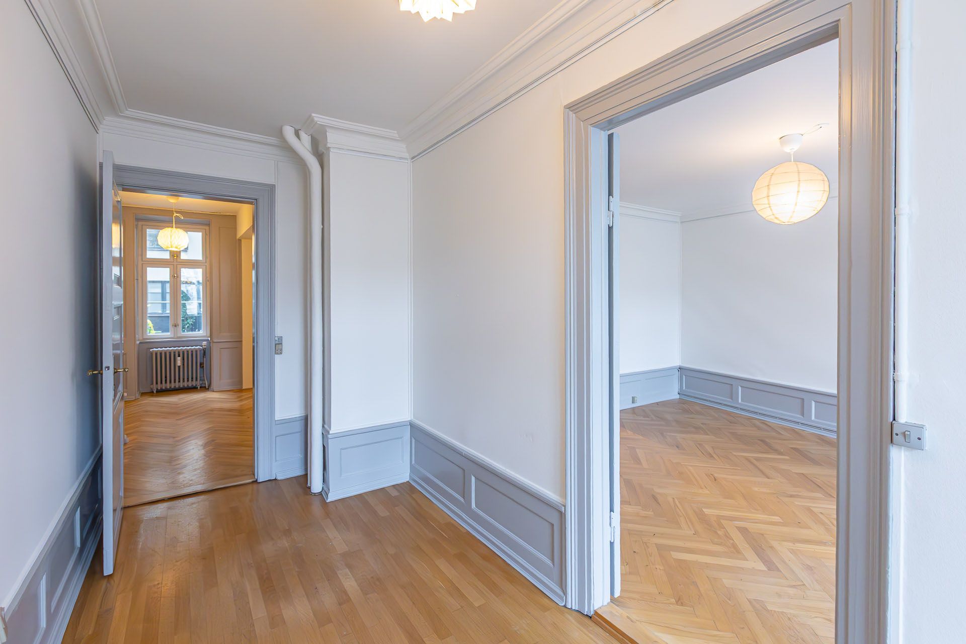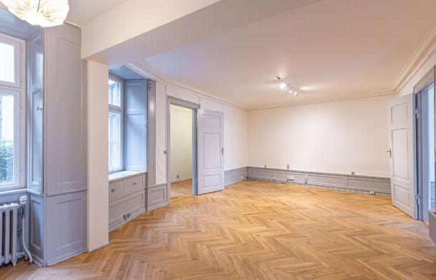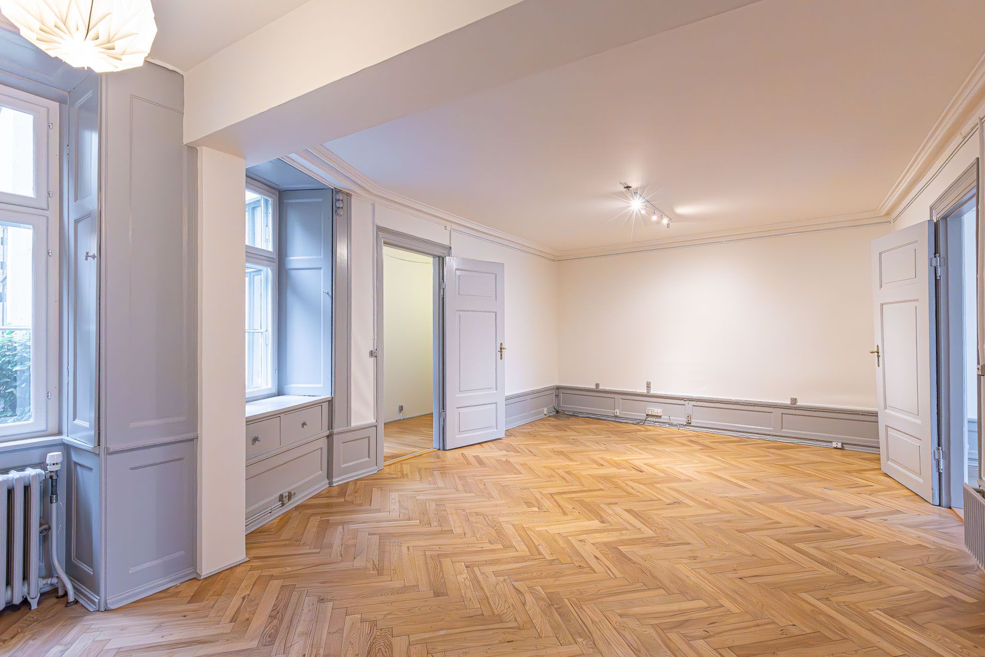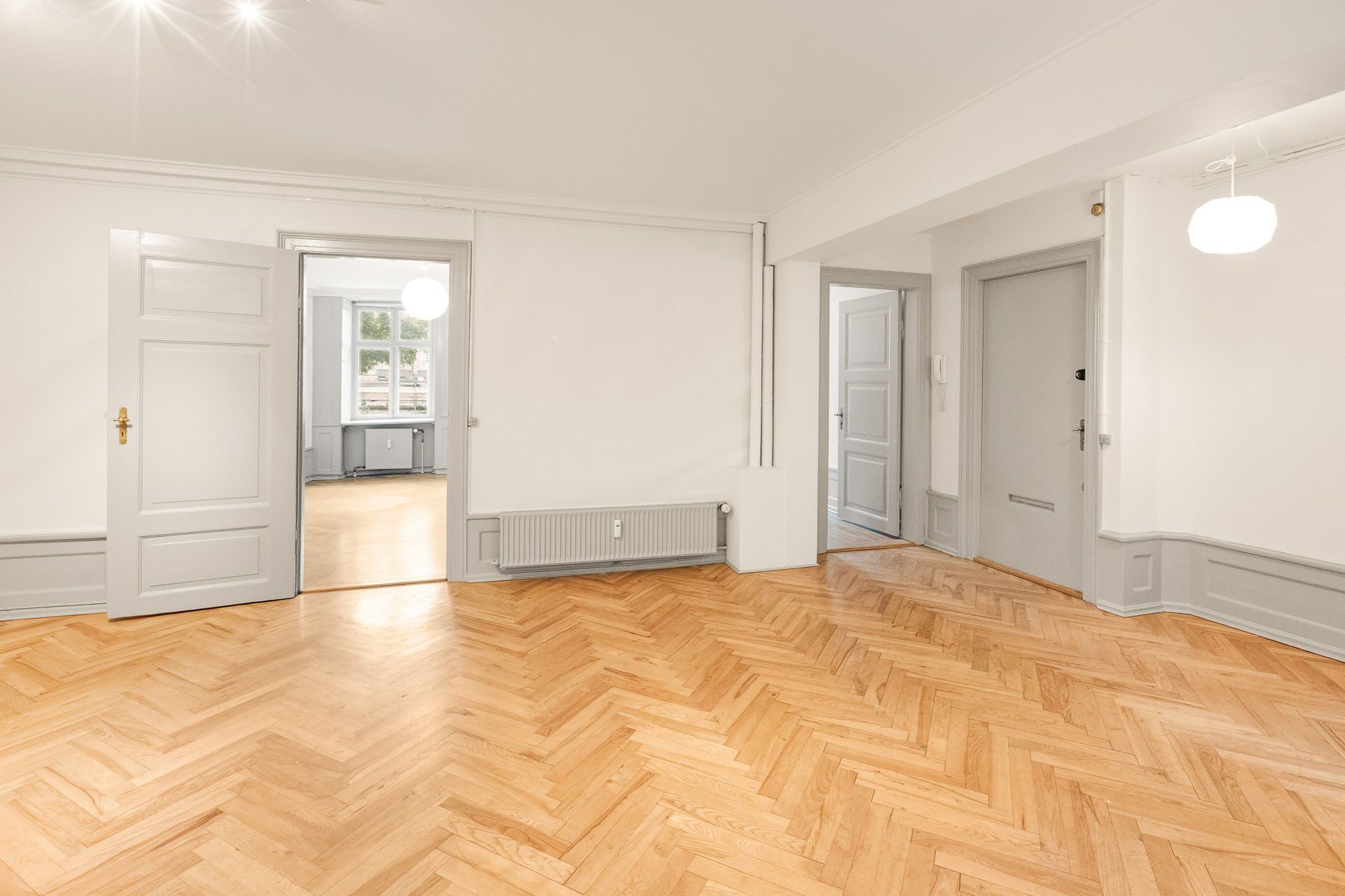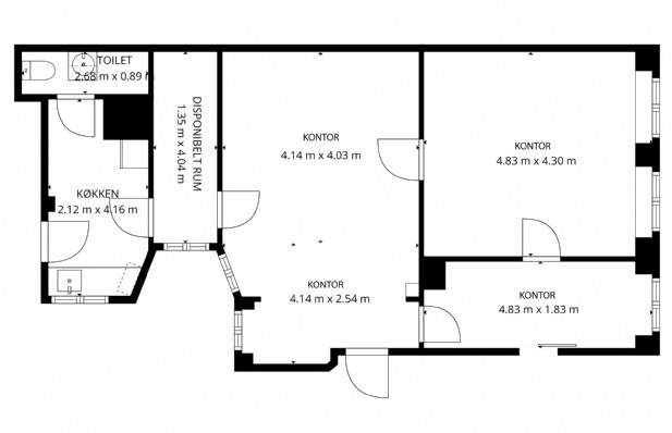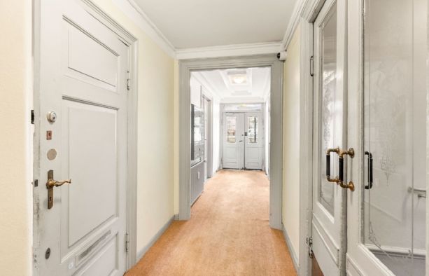 Repræsentativt indgangsparti til indbydende lejemål, som fremstår med pæne sildebensparketgulve og smukke paneler. Lejemålet er indrettet med 2 kontorer ud mod gaden og et større storrumskontor beliggende med vindue ud mod gården. Ydermere har lejemålet et mindre opbevarings-/printerlokale, samt køkken og toilet.