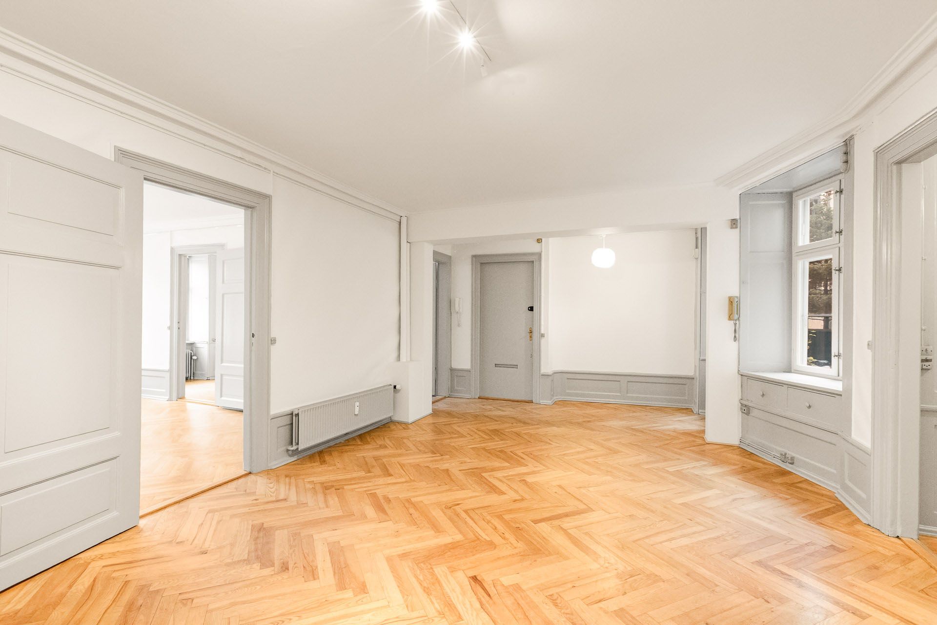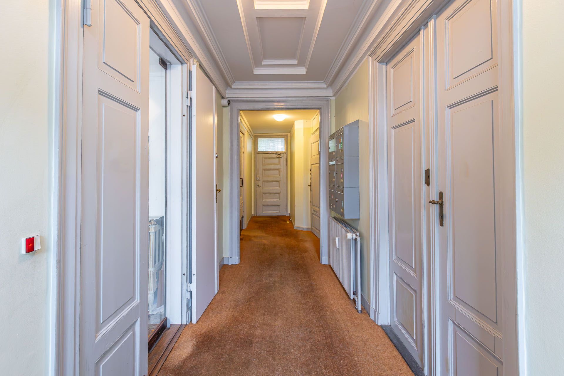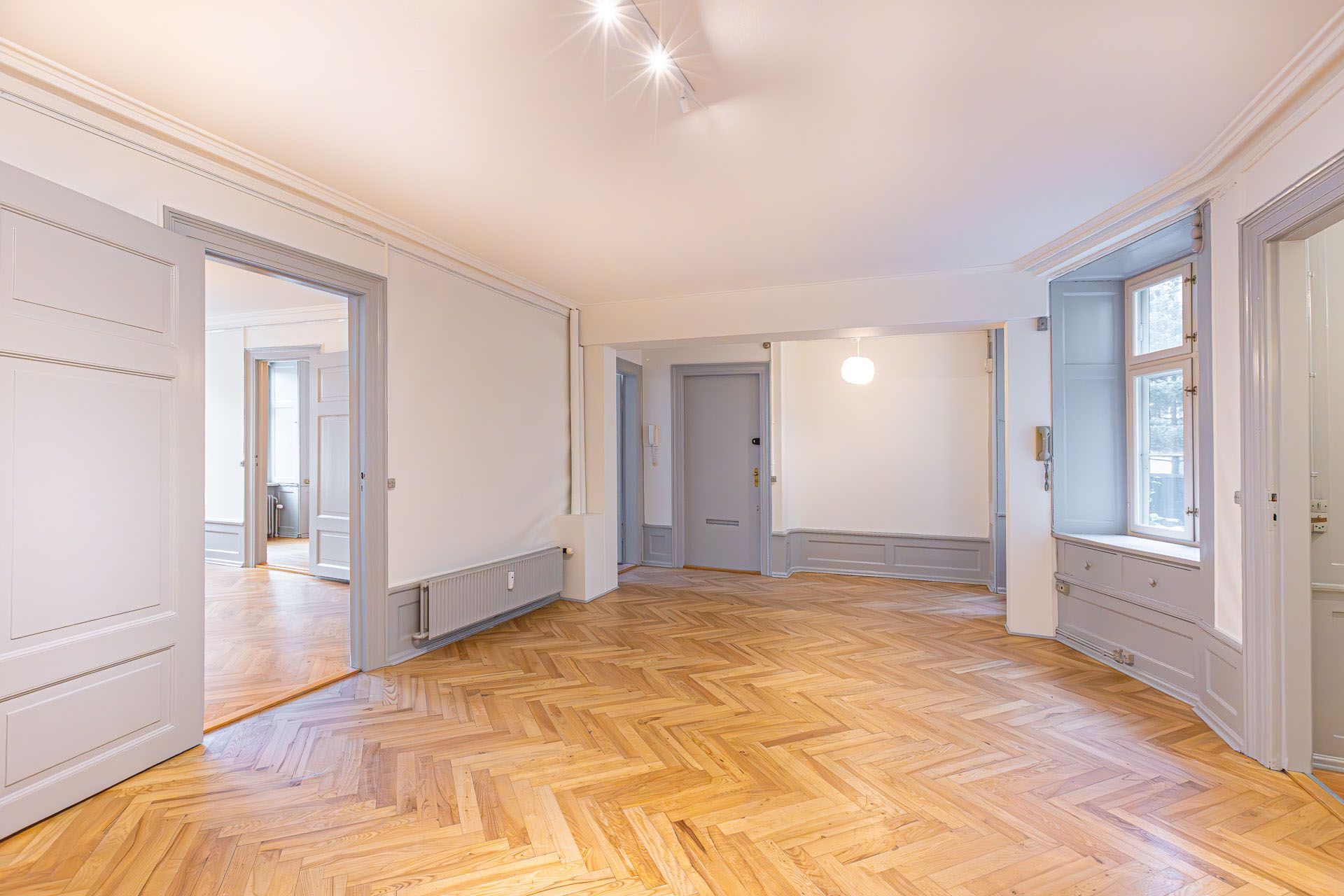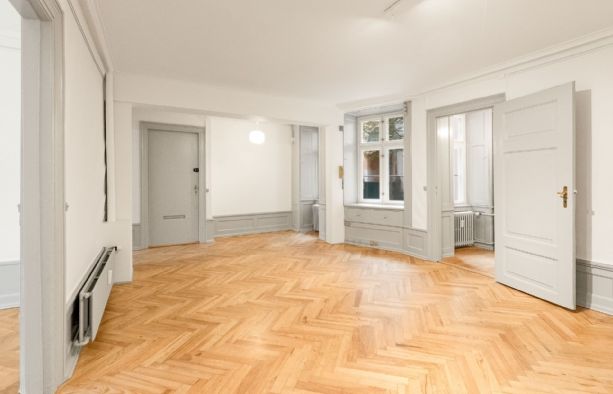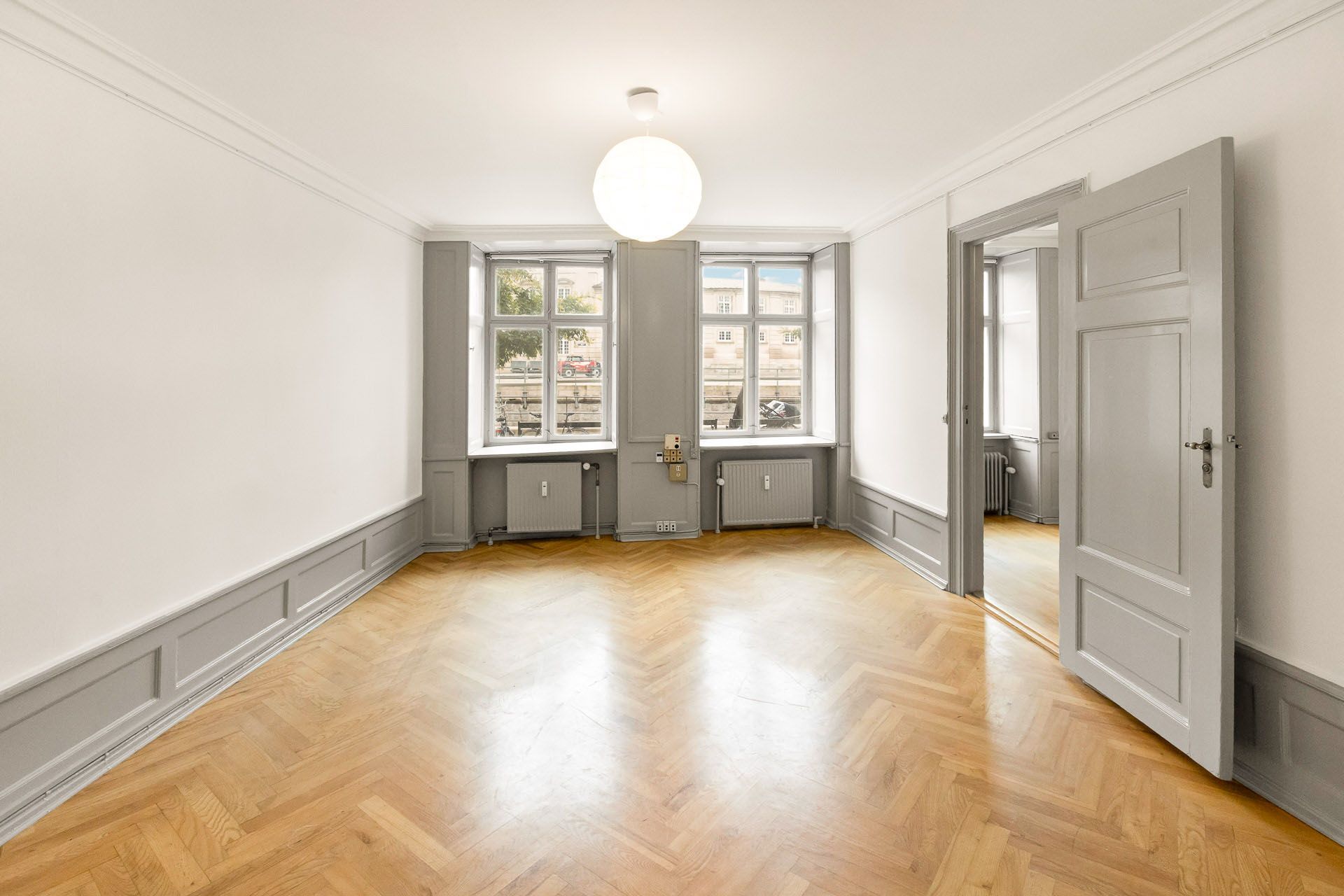 Repræsentativt indgangsparti til indbydende lejemål, som fremstår med pæne sildebensparketgulve og smukke paneler. Lejemålet er indrettet med 2 kontorer ud mod gaden og et større storrumskontor beliggende med vindue ud mod gården. Ydermere har lejemålet et mindre opbevarings-/printerlokale, samt køkken og toilet.