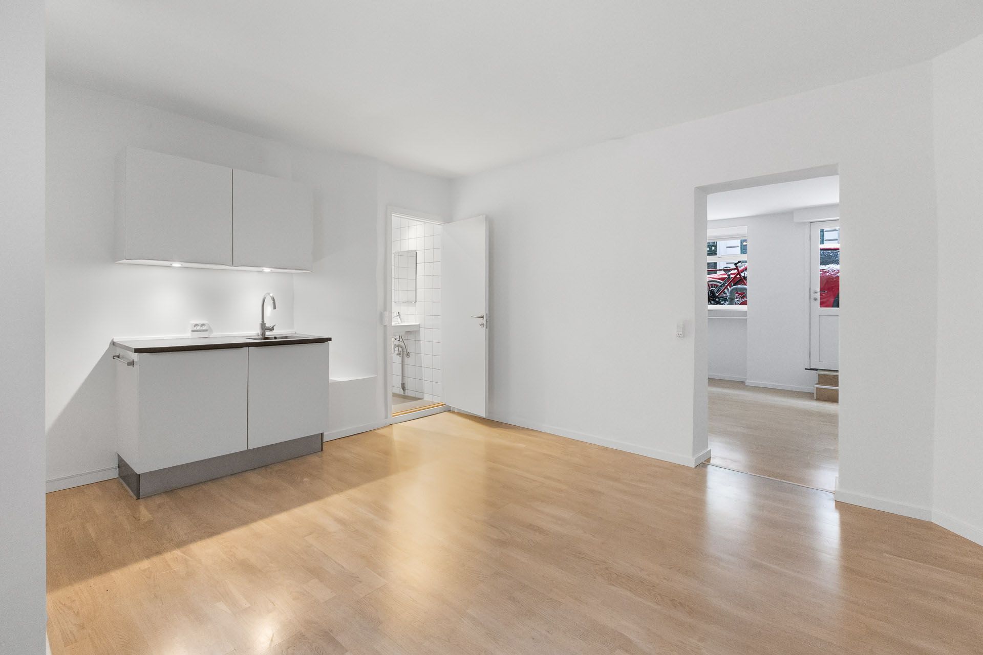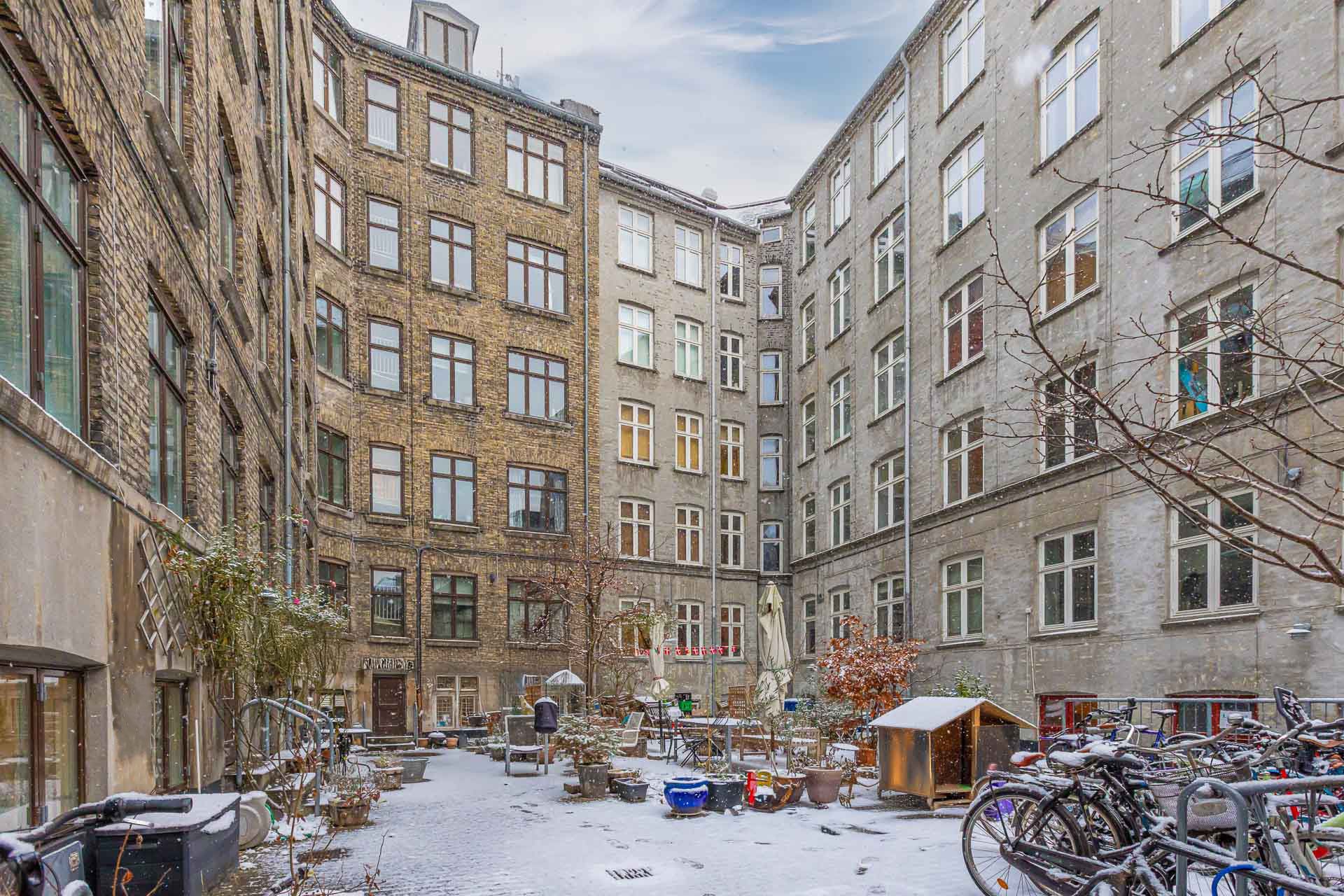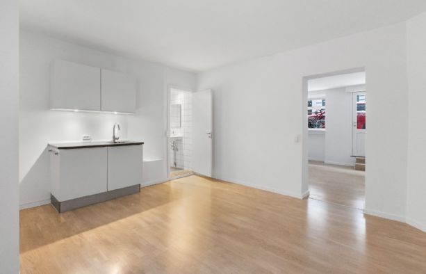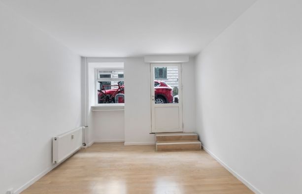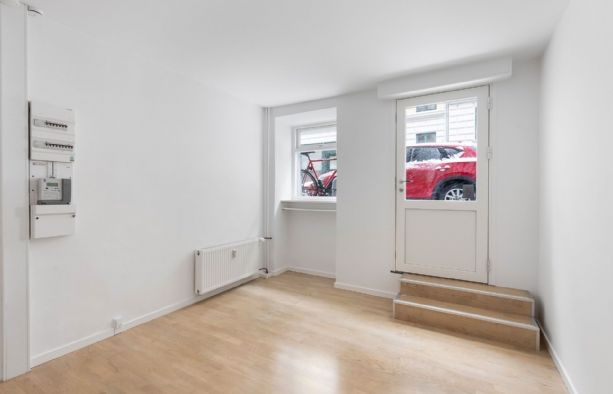 Lejemålet har direkte adgang fra gaden og består af 2 rum i åben forbindelse med hinanden, hvor det ene har udgang til gaden og det andet har køkken og udgang til den hyggelige og rolige gård, som kan benyttes på lige fod med de andre i ejendommen. Derudover indeholder lejemålet et pænt toilet.