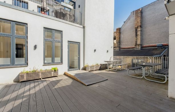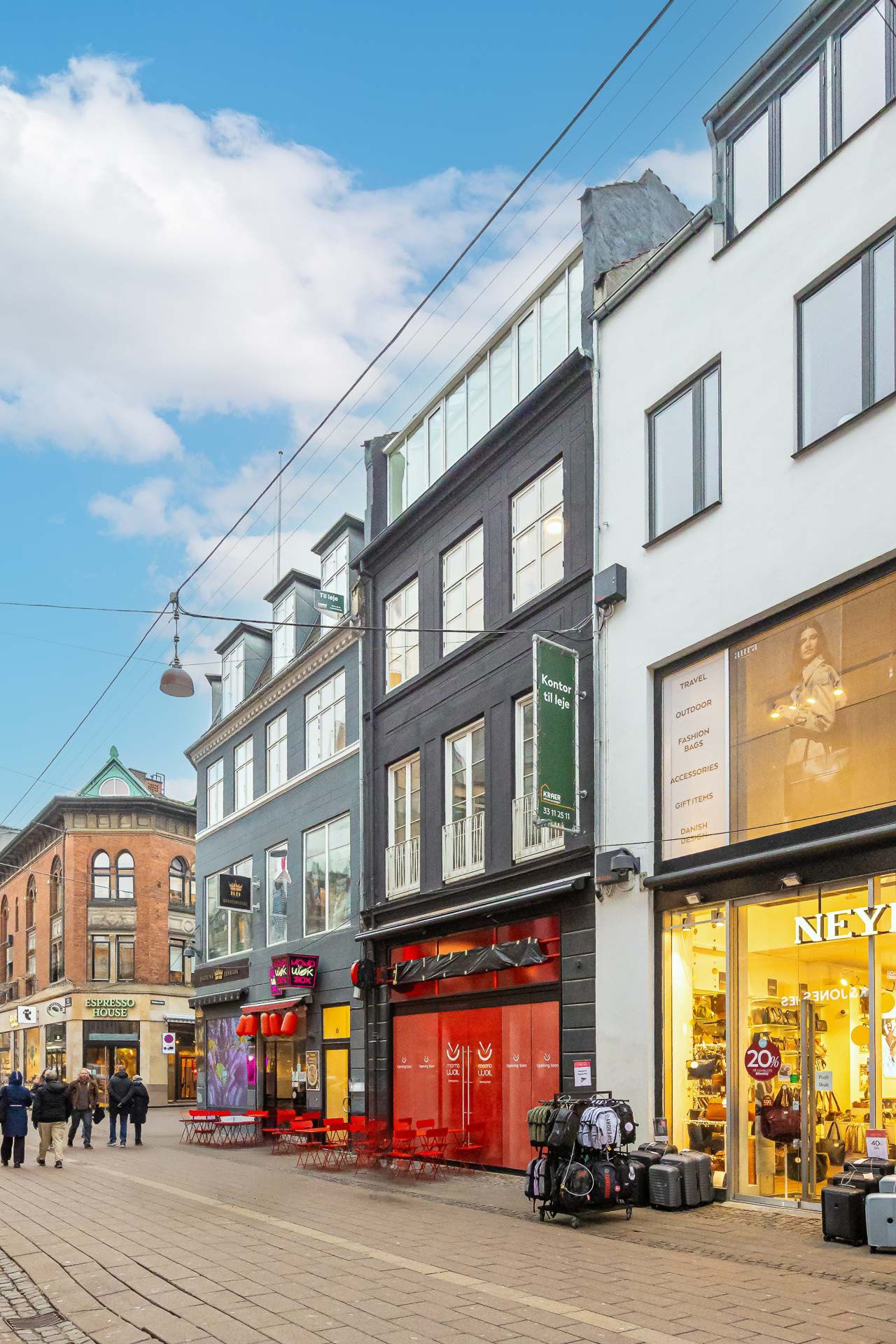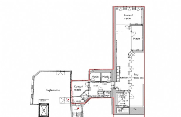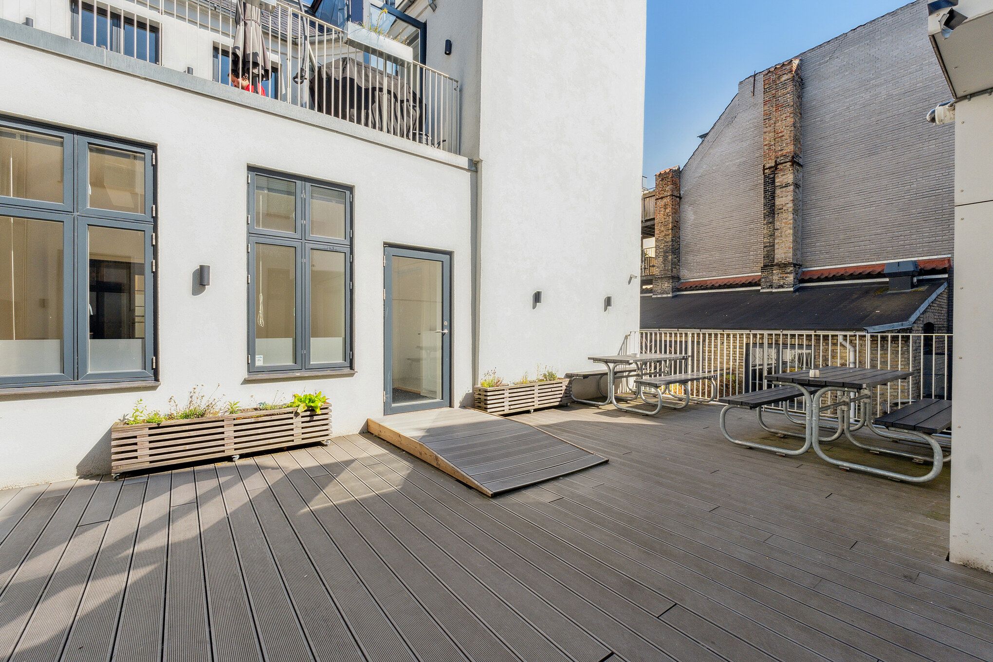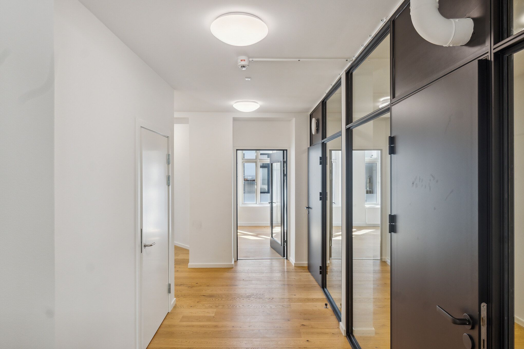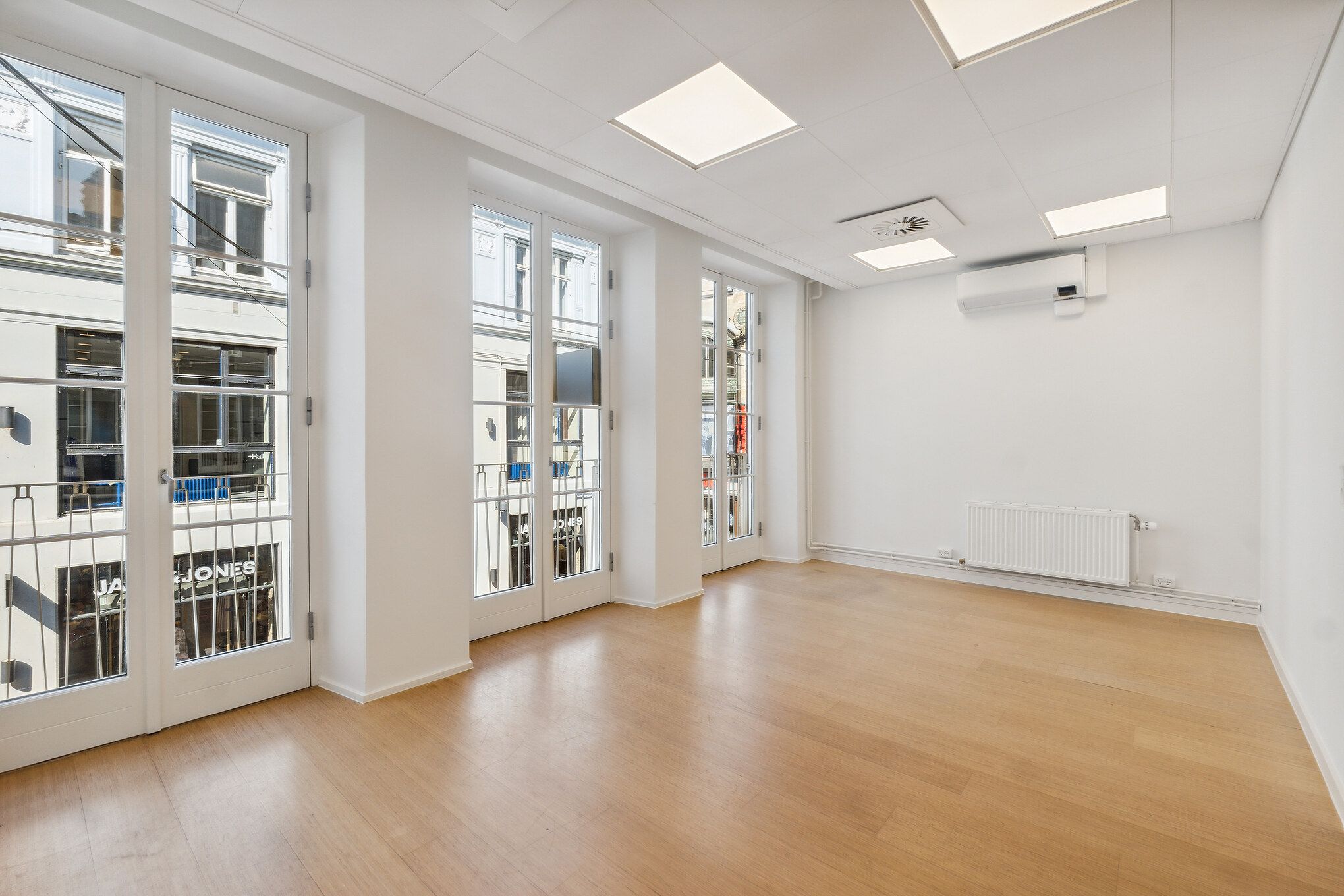 Lejemålet indeholder kontor/møderum med store vinduespartier mod Frederiksberggade, storrum i åben forbindelse med køkken med døre mod tagterrassen, 3-5 kontorer/ møderum alt efter behov samt toilet.