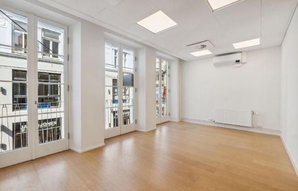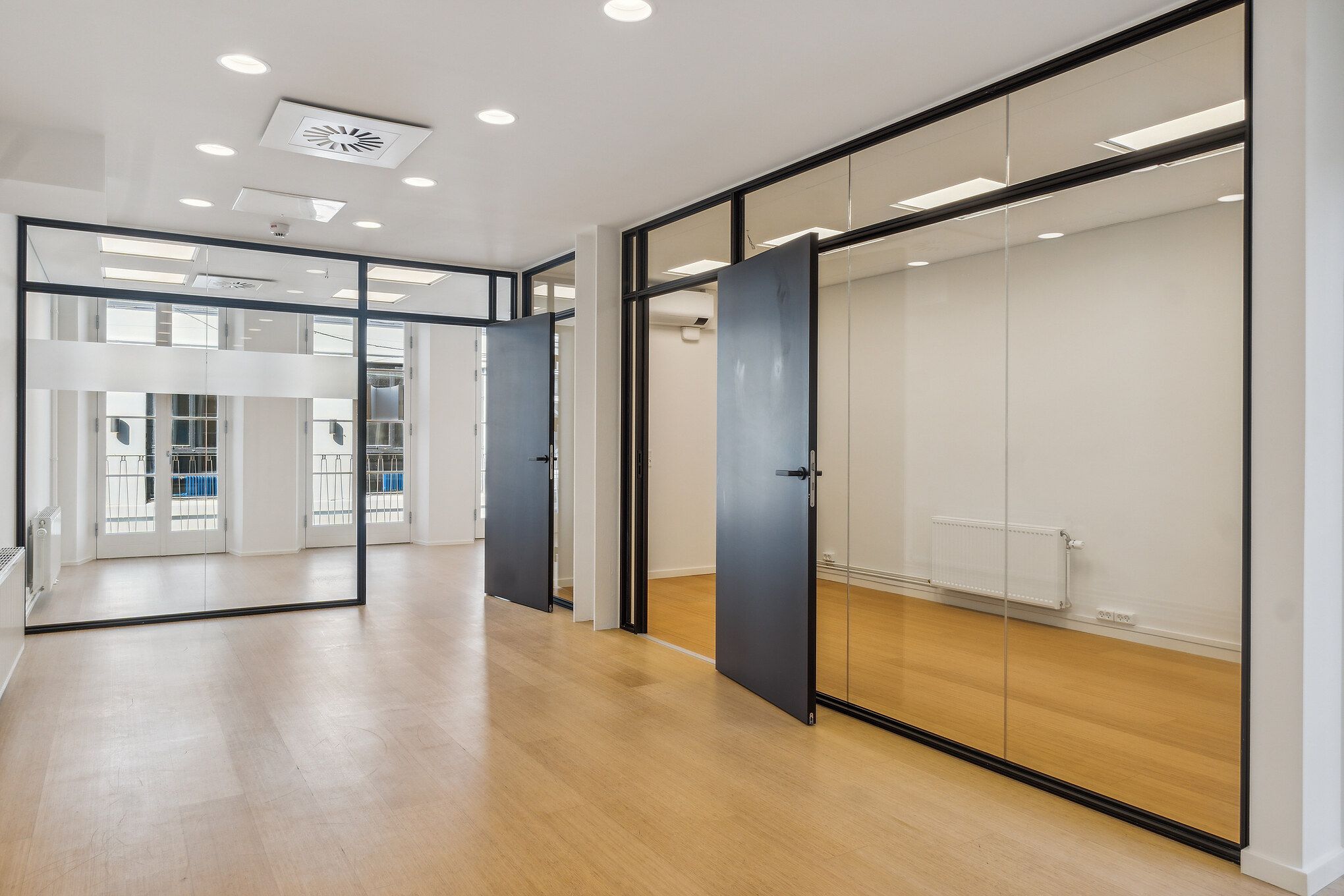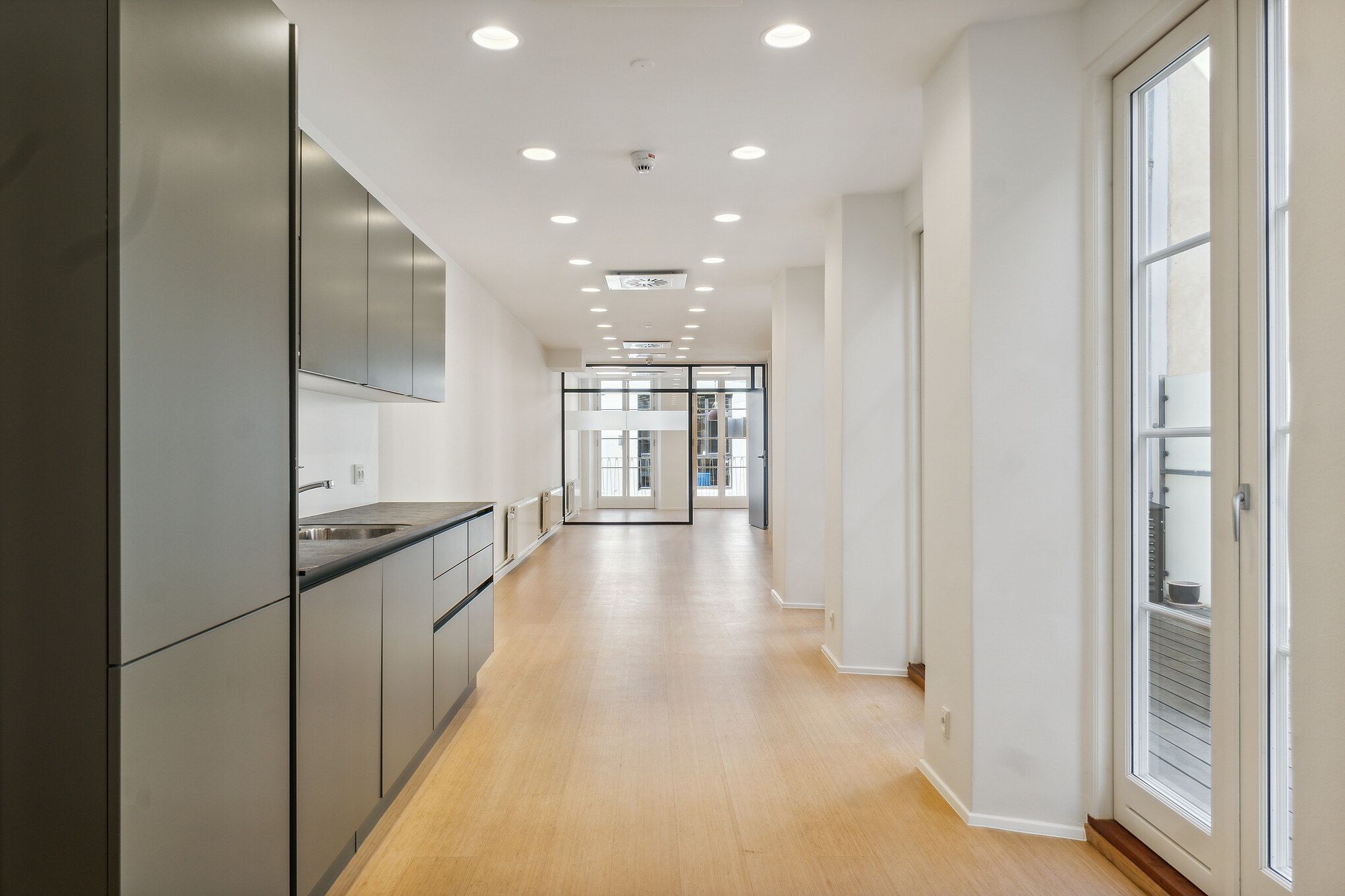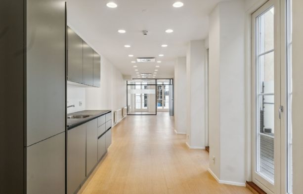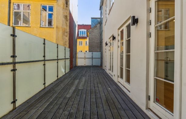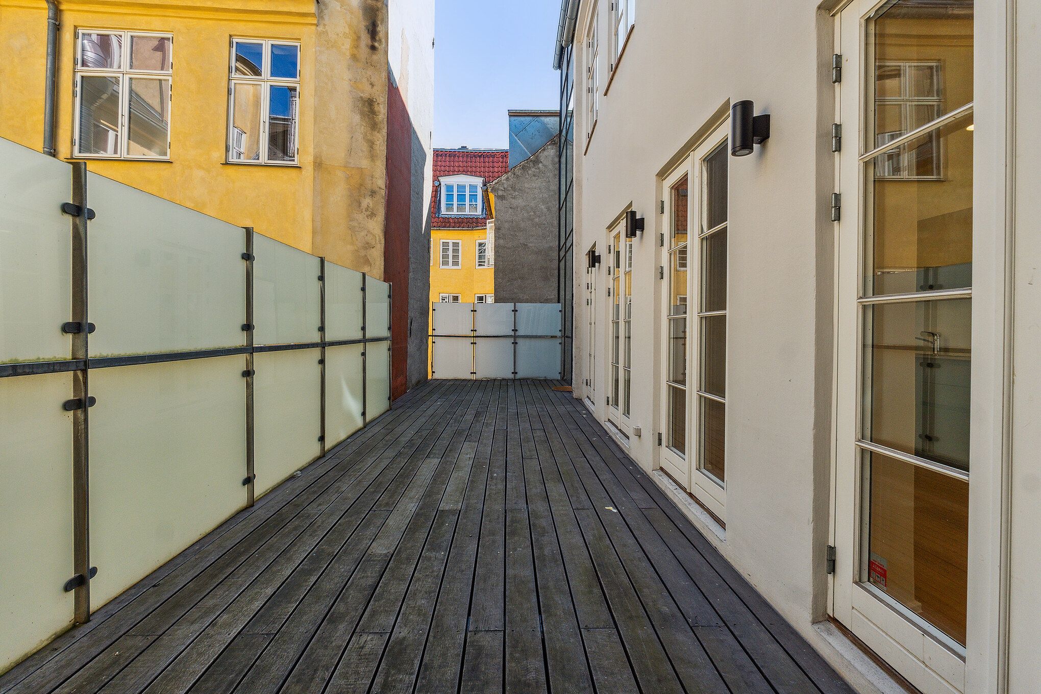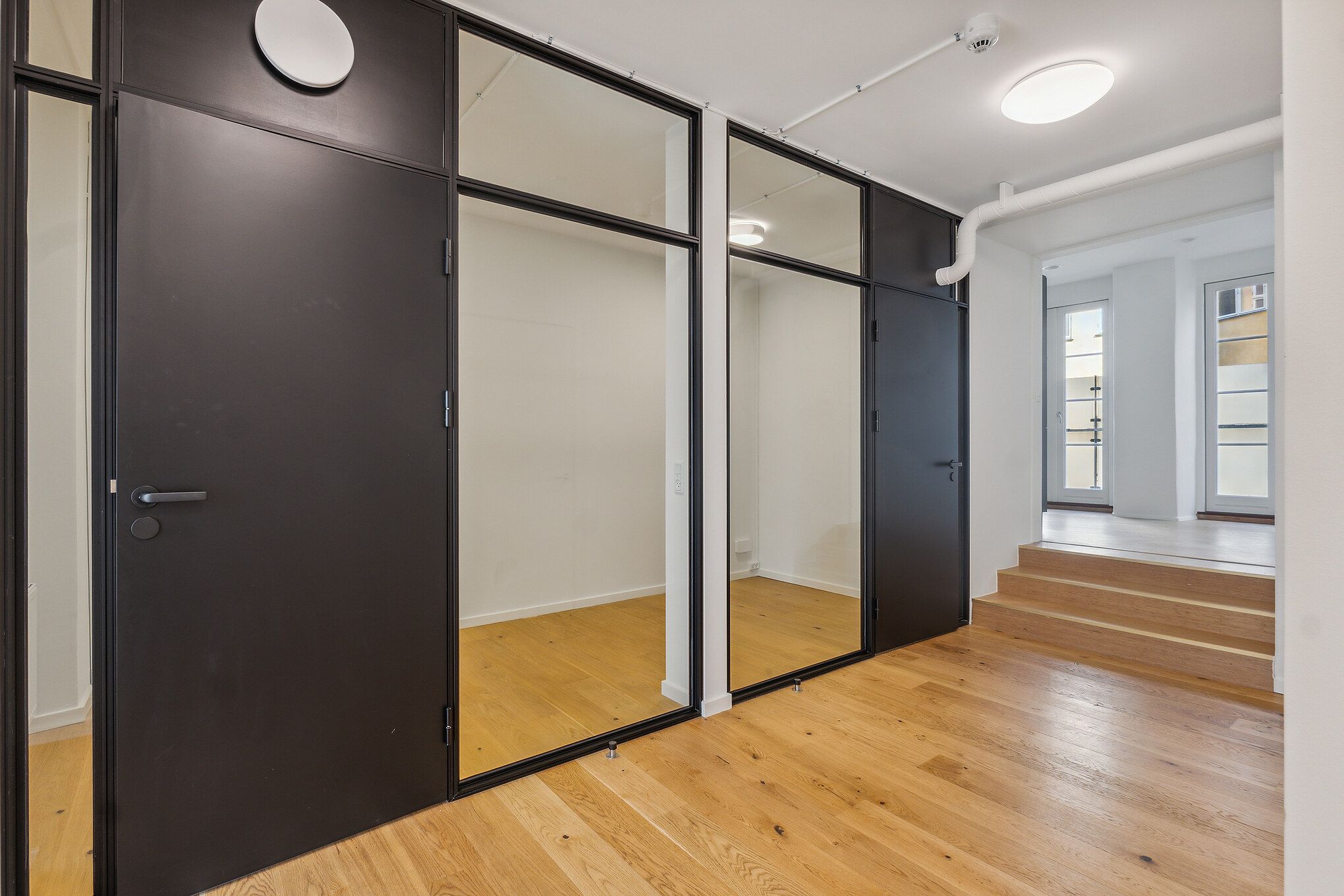 Lejemålet indeholder kontor/møderum med store vinduespartier mod Frederiksberggade, storrum i åben forbindelse med køkken med døre mod tagterrassen, 3-5 kontorer/ møderum alt efter behov samt toilet.