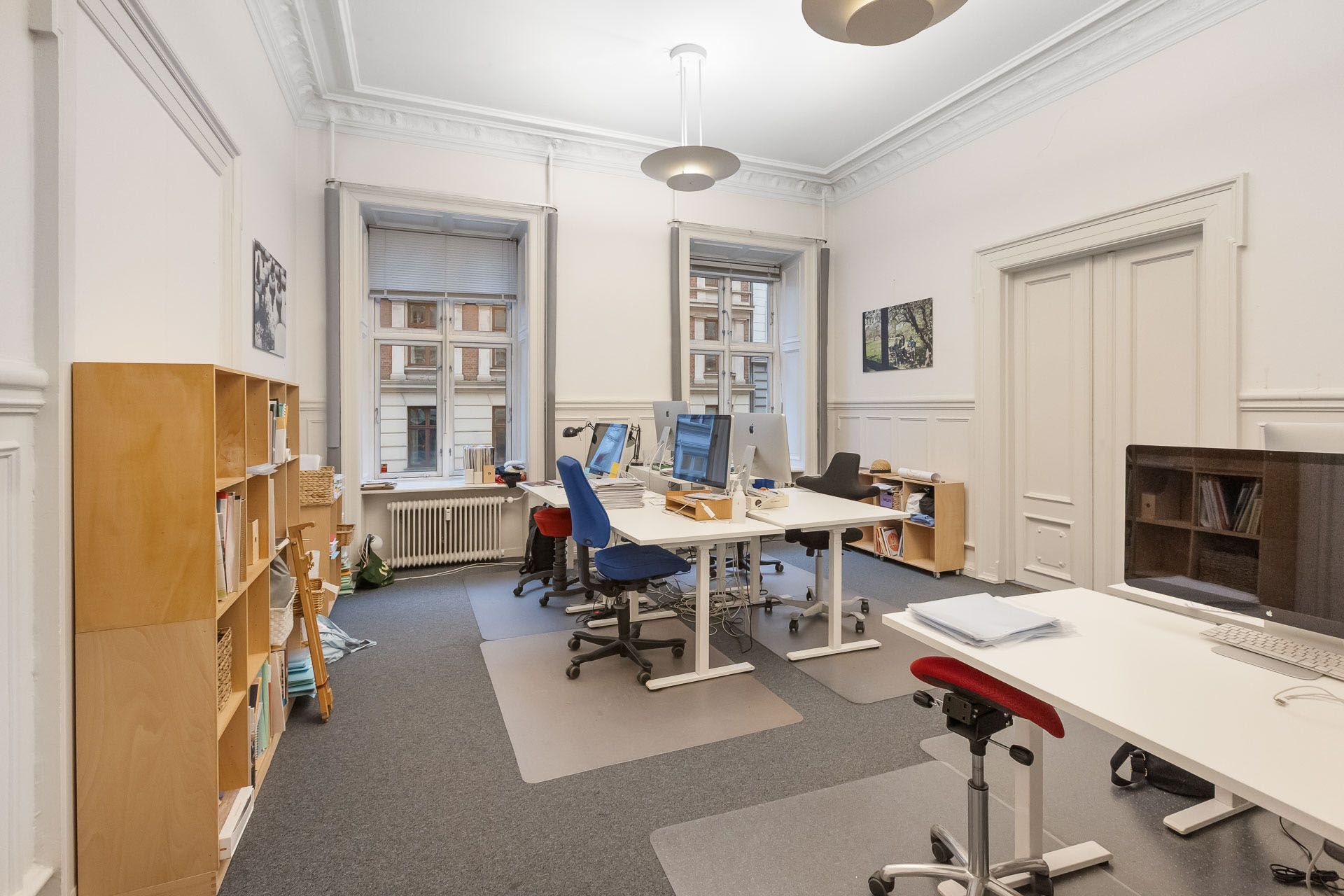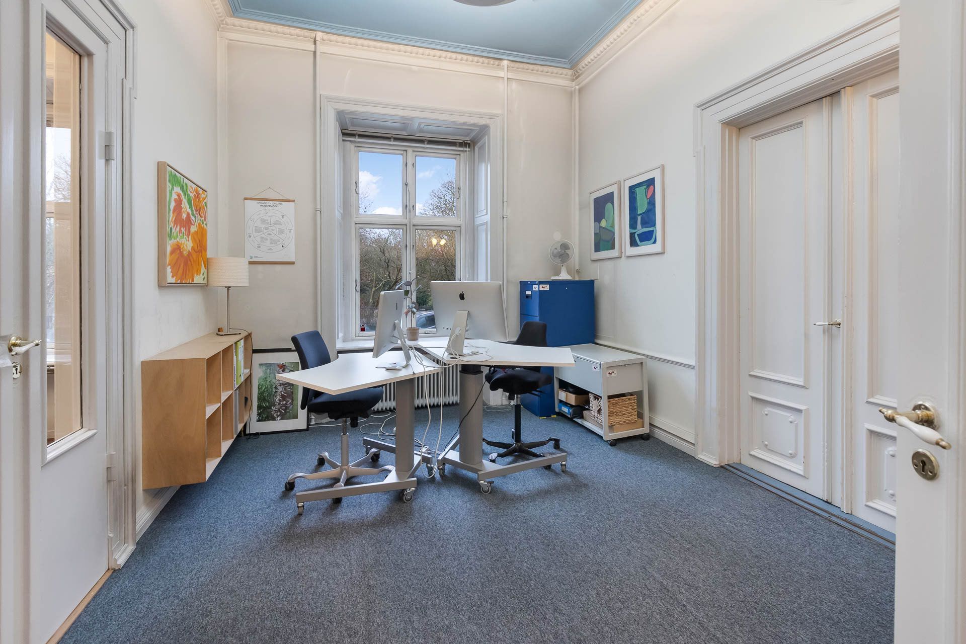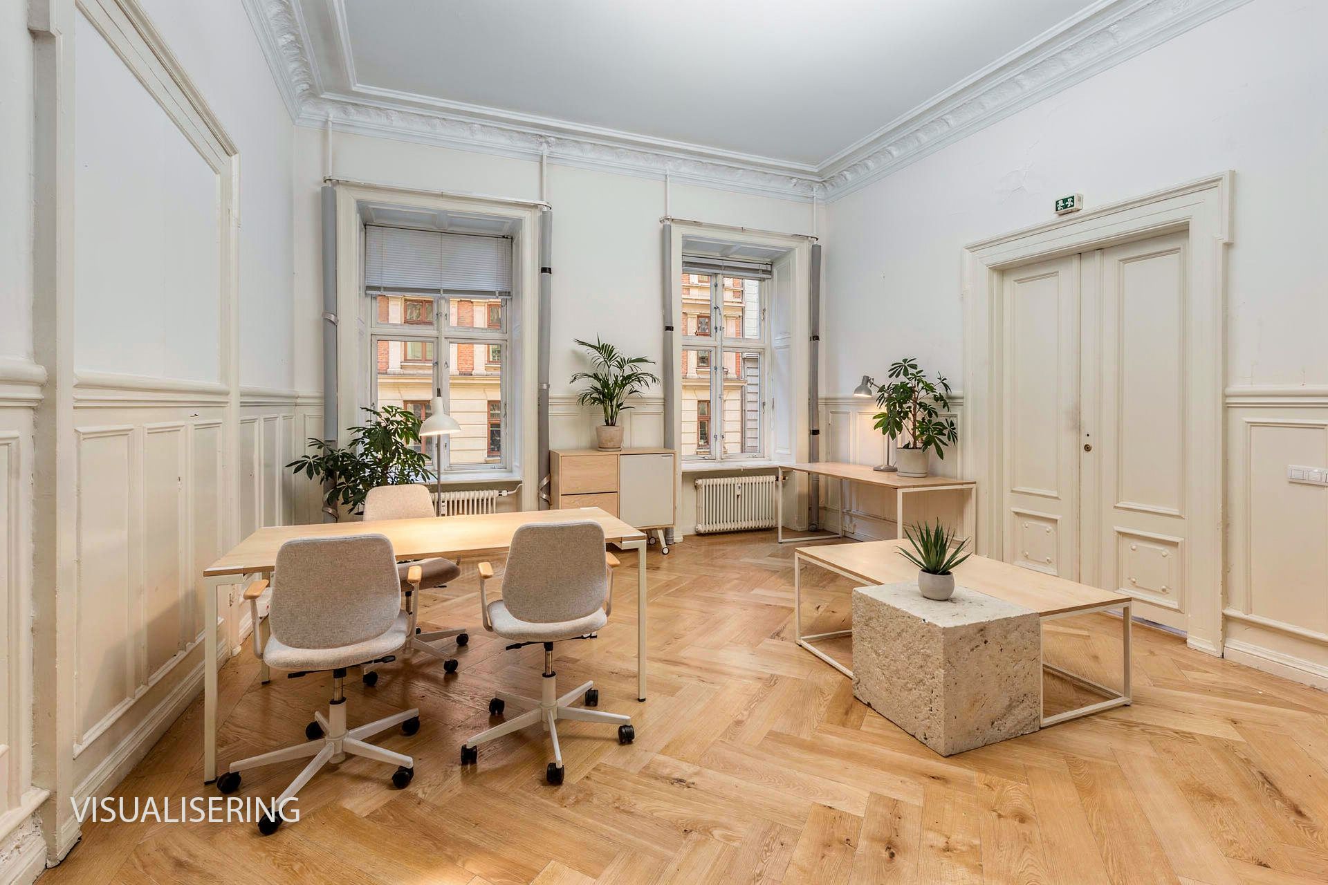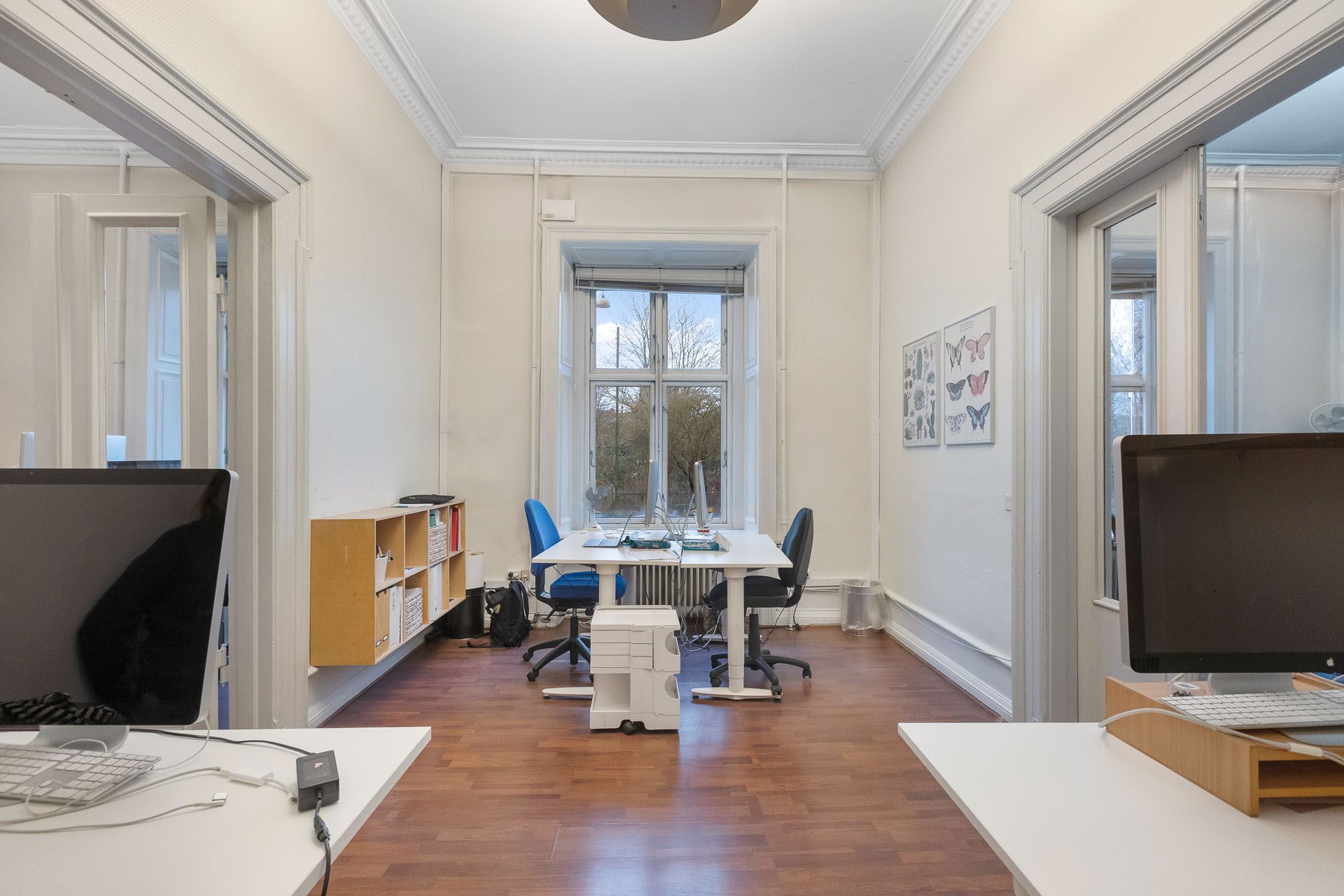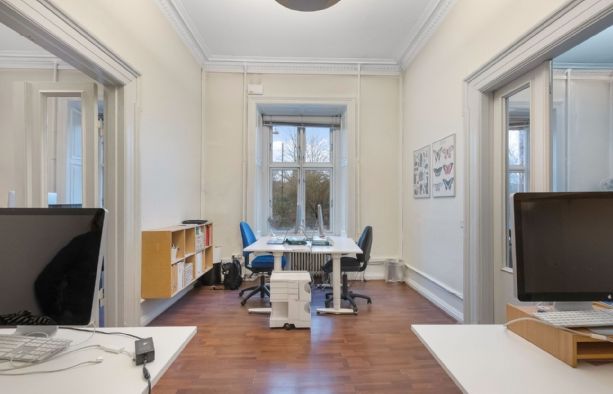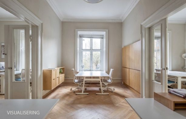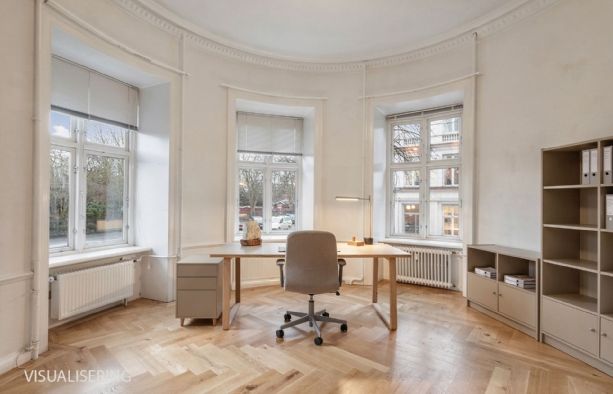 Lejemålet indeholder hele 7 stuer en suite, som alle har høje paneler, stuk og smukke massive originale døre. Det buede hjørnekontor har en skøn udsigt over Ørstedsparken og livet på gaden. De fantastik flotte udskæringer over dørene understreger lejemålets helt særlige eksklusive oprindelse og generelt er de flotte detaljer bevaret overalt.