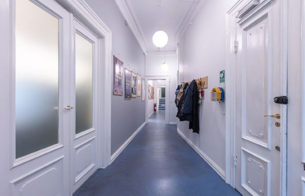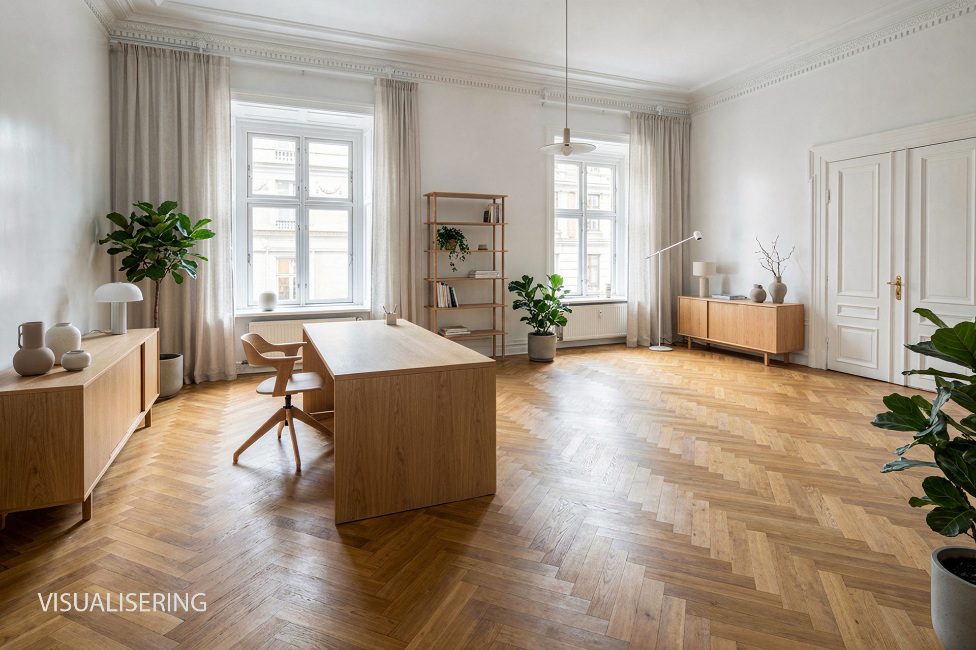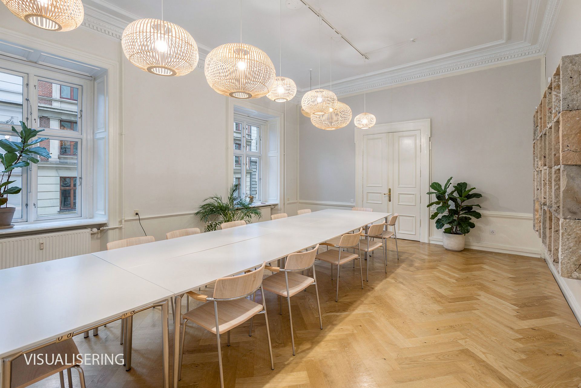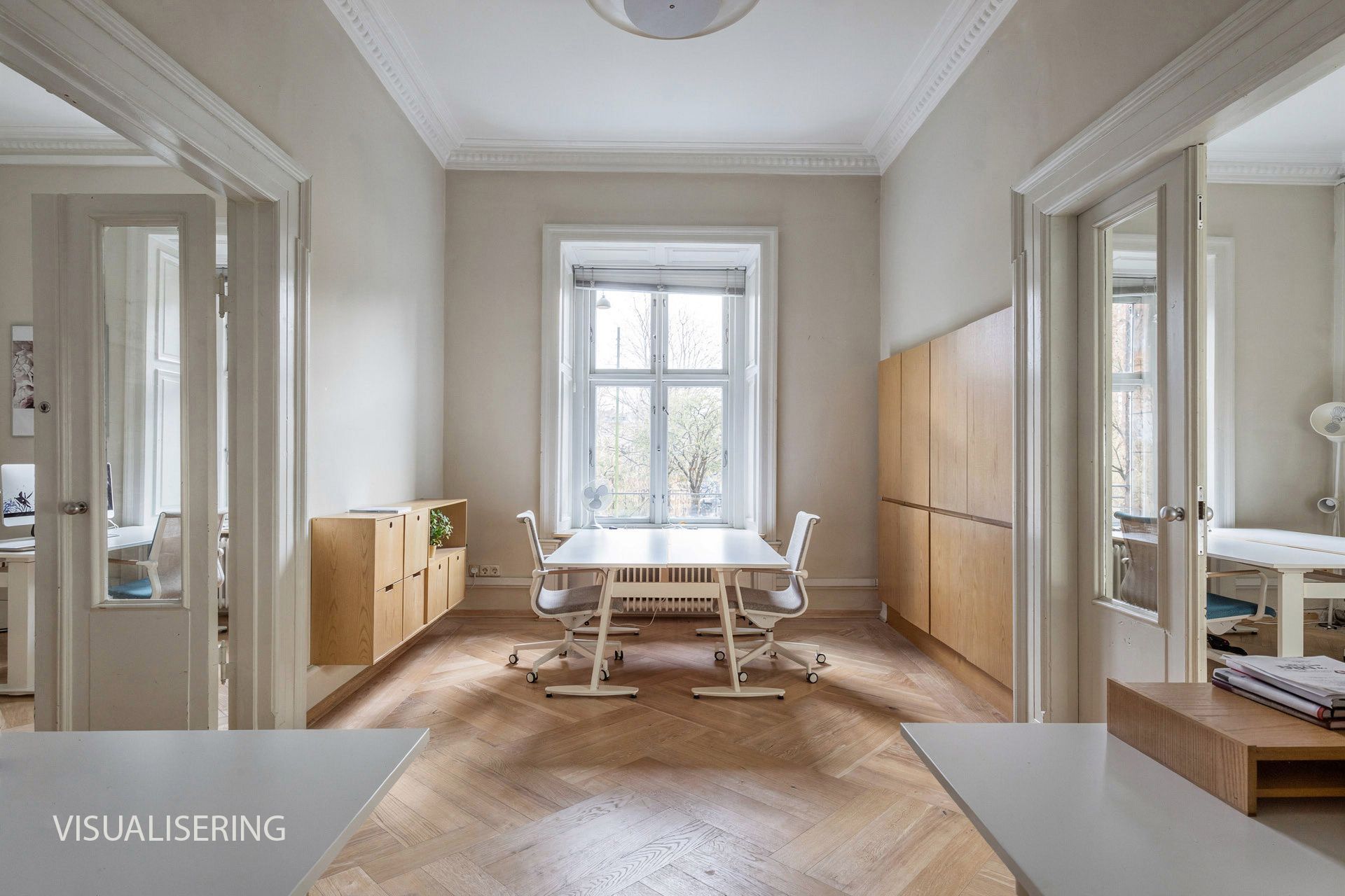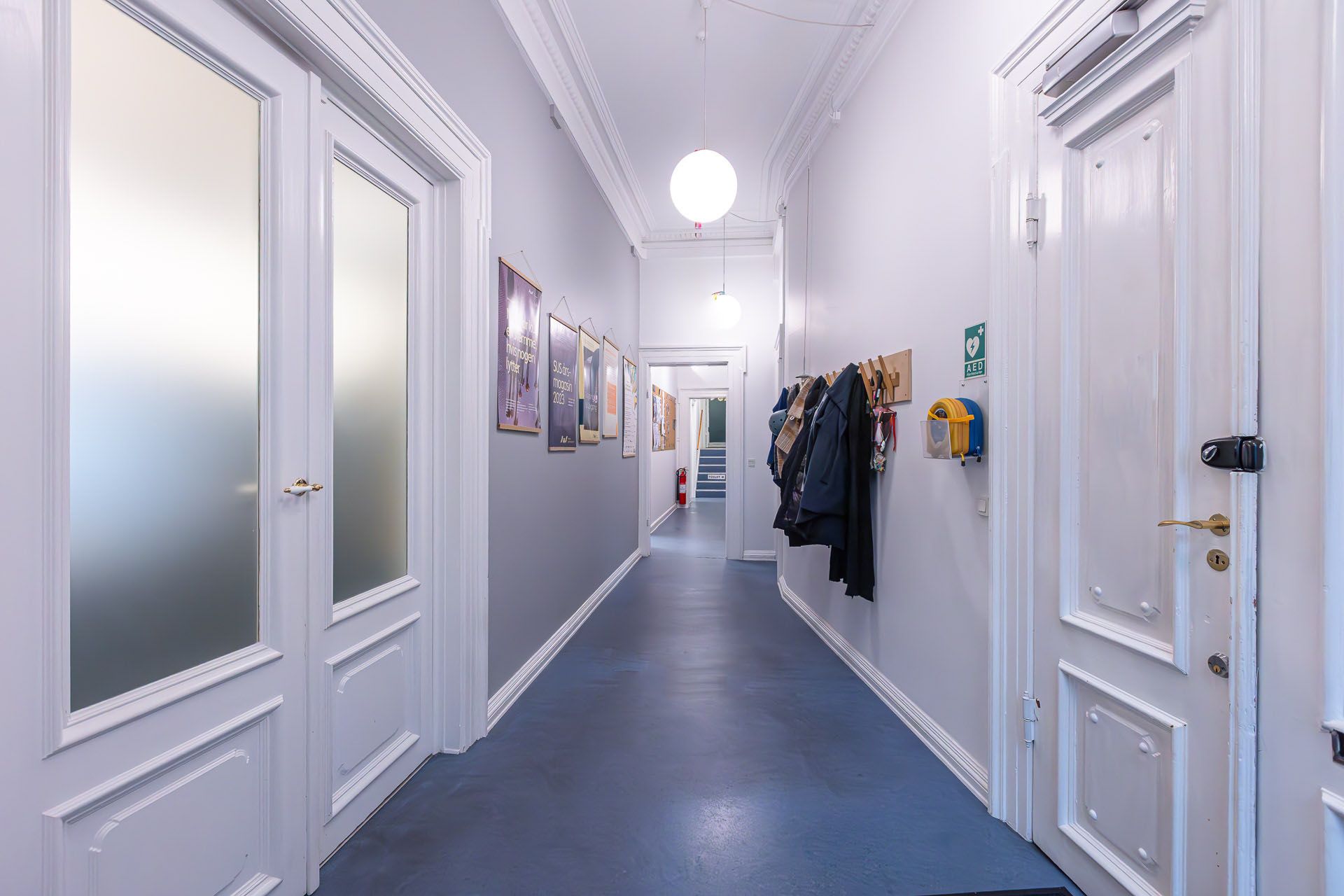 Lejemålet indeholder hele 7 stuer en suite, som alle har høje paneler, stuk og smukke massive originale døre. Det buede hjørnekontor har en skøn udsigt over Ørstedsparken og livet på gaden. De fantastik flotte udskæringer over dørene understreger lejemålets helt særlige eksklusive oprindelse og generelt er de flotte detaljer bevaret overalt.