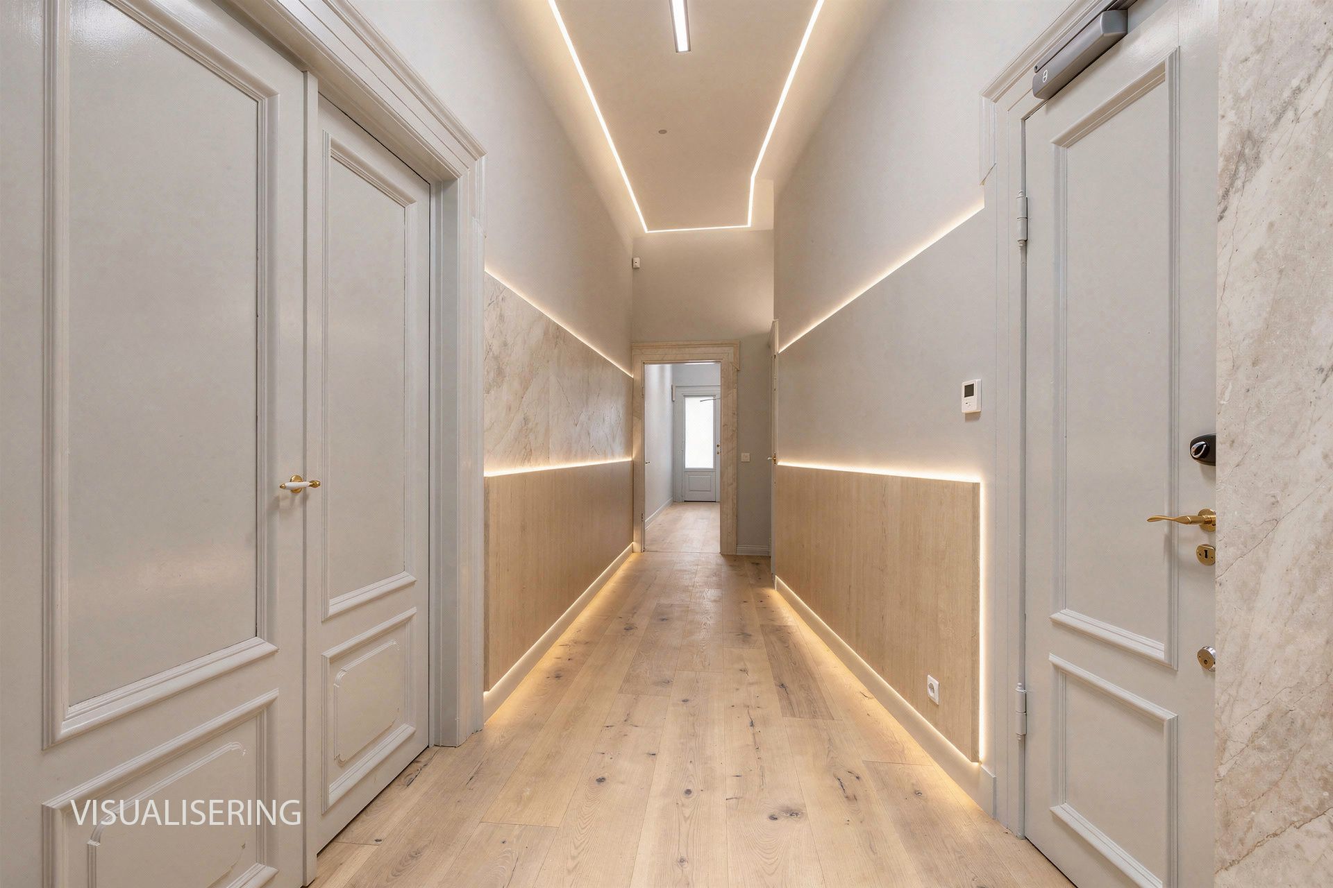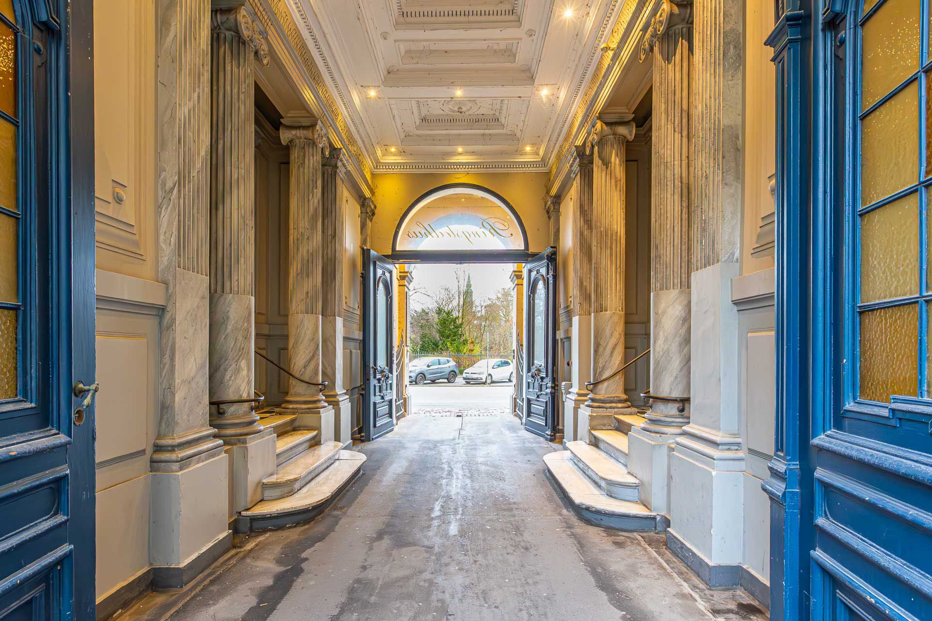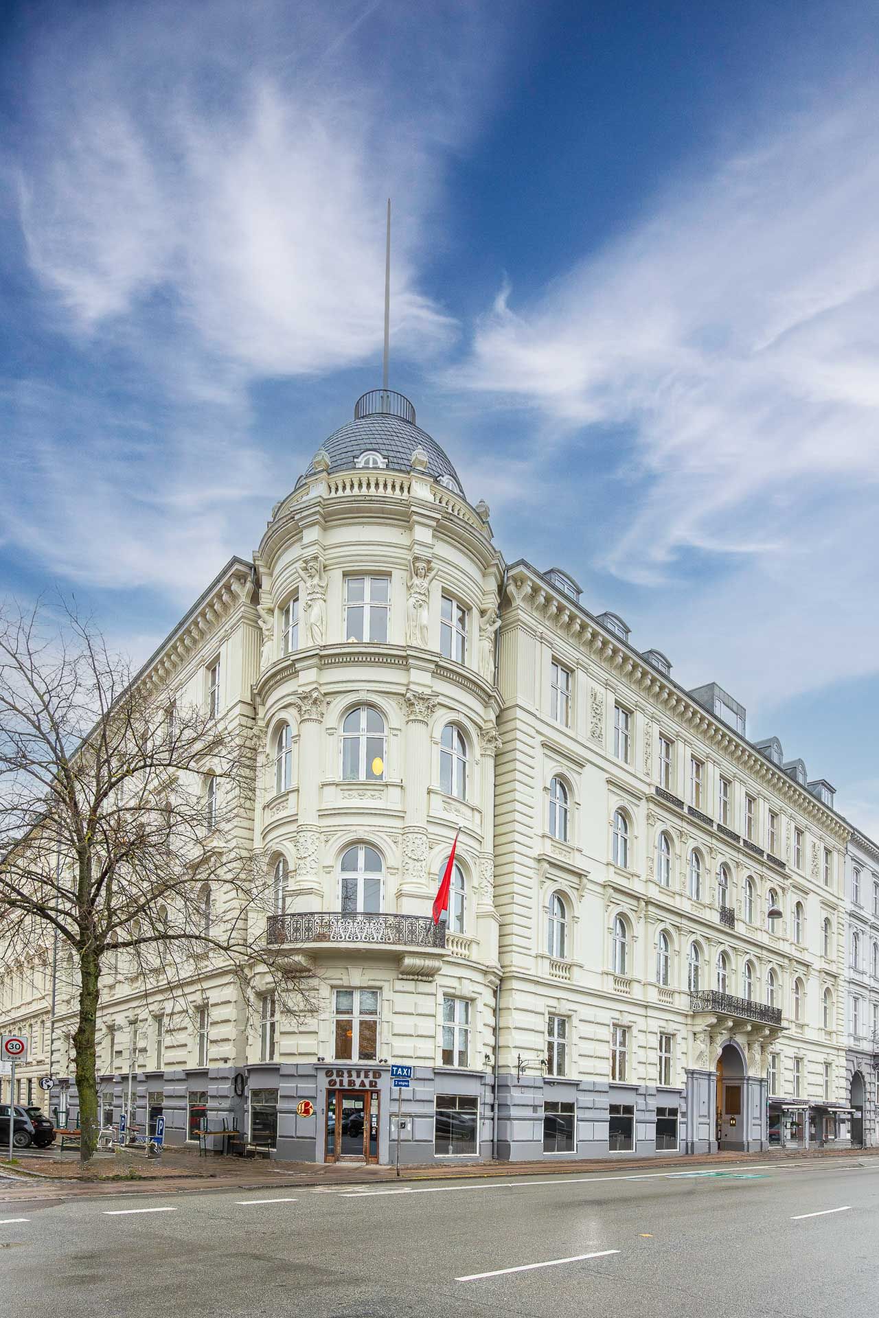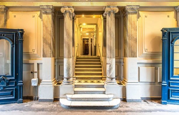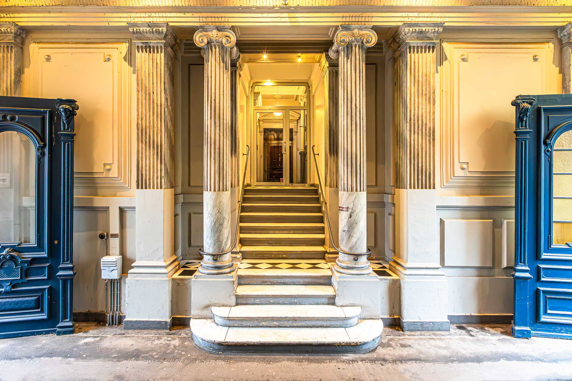 Sjældent udbudt hjørnelejemål i en fantastisk smuk og klassisk stil. Ankomst til lejemålet sker via smukt portrum med flotte marmorsøjler. Herfra adgang til flot bred opgang med massive døre med smukke udskæringer samt elevator.