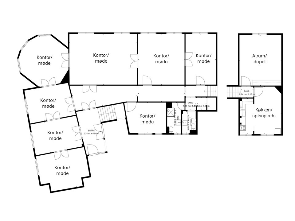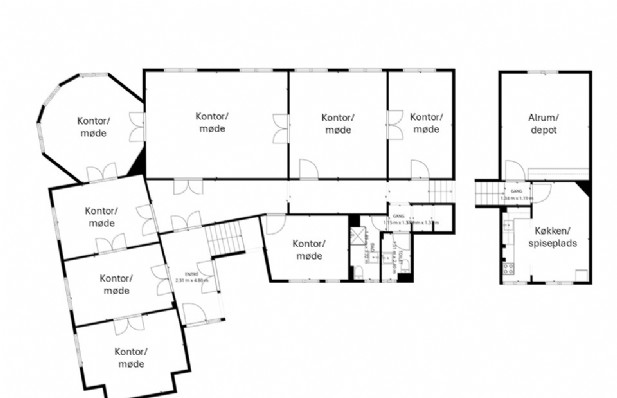 Udover de 7 stuer en suite indeholder lejemålet kontor mod gården, rummeligt køkken med spiseplads, depotrum over porten samt 2 toiletter, hvoraf det ene ligeledes har brus.