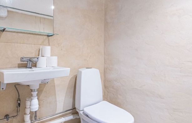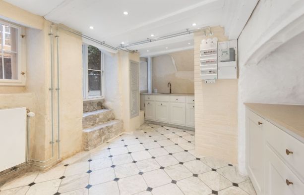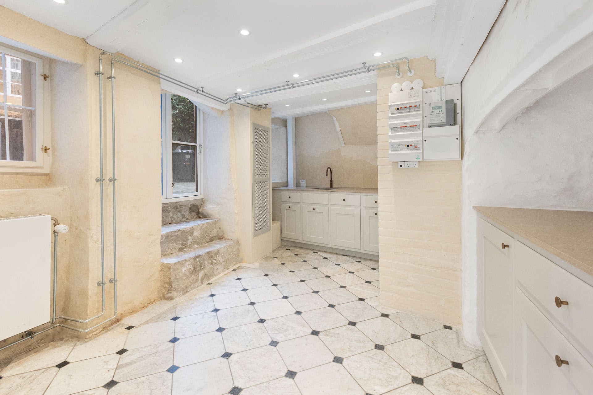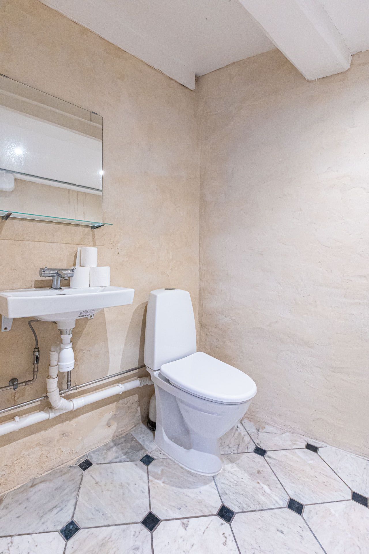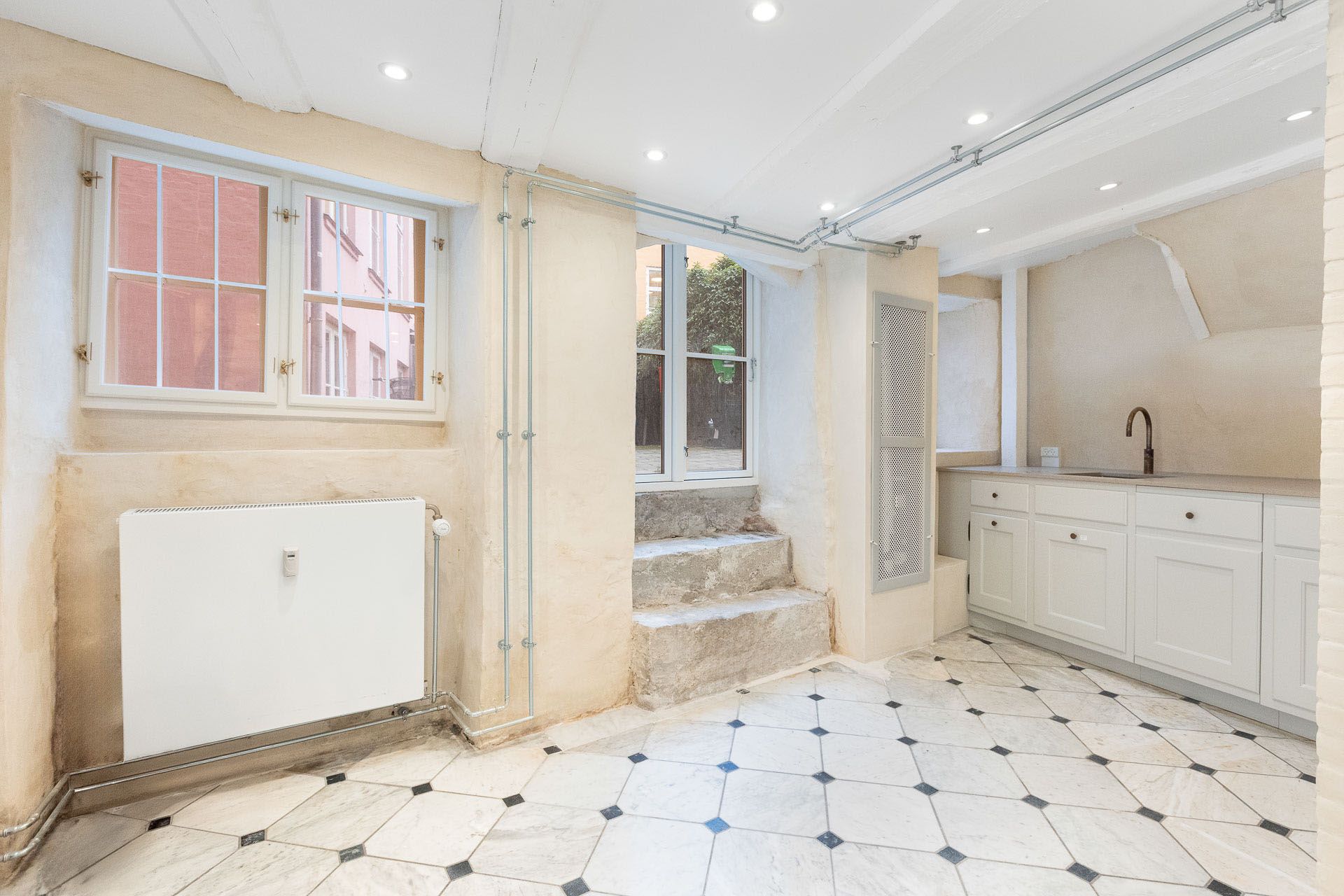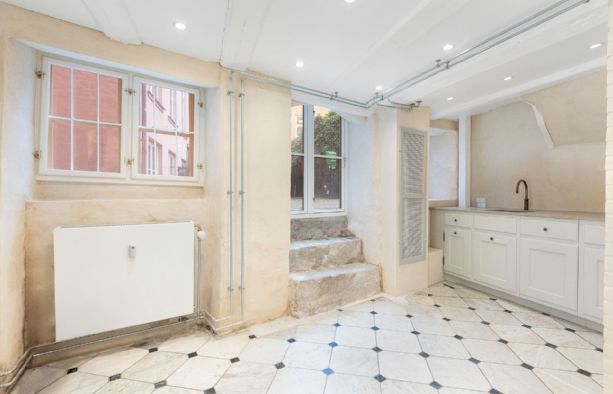 Lejemålets gulve er belagt med hvide/ lyse marmorfliser. Bemærk at den nederste del af ejendommens facade bliver pudset op og malet til foråret.
