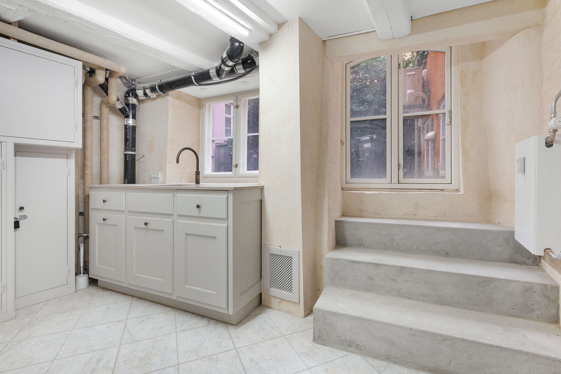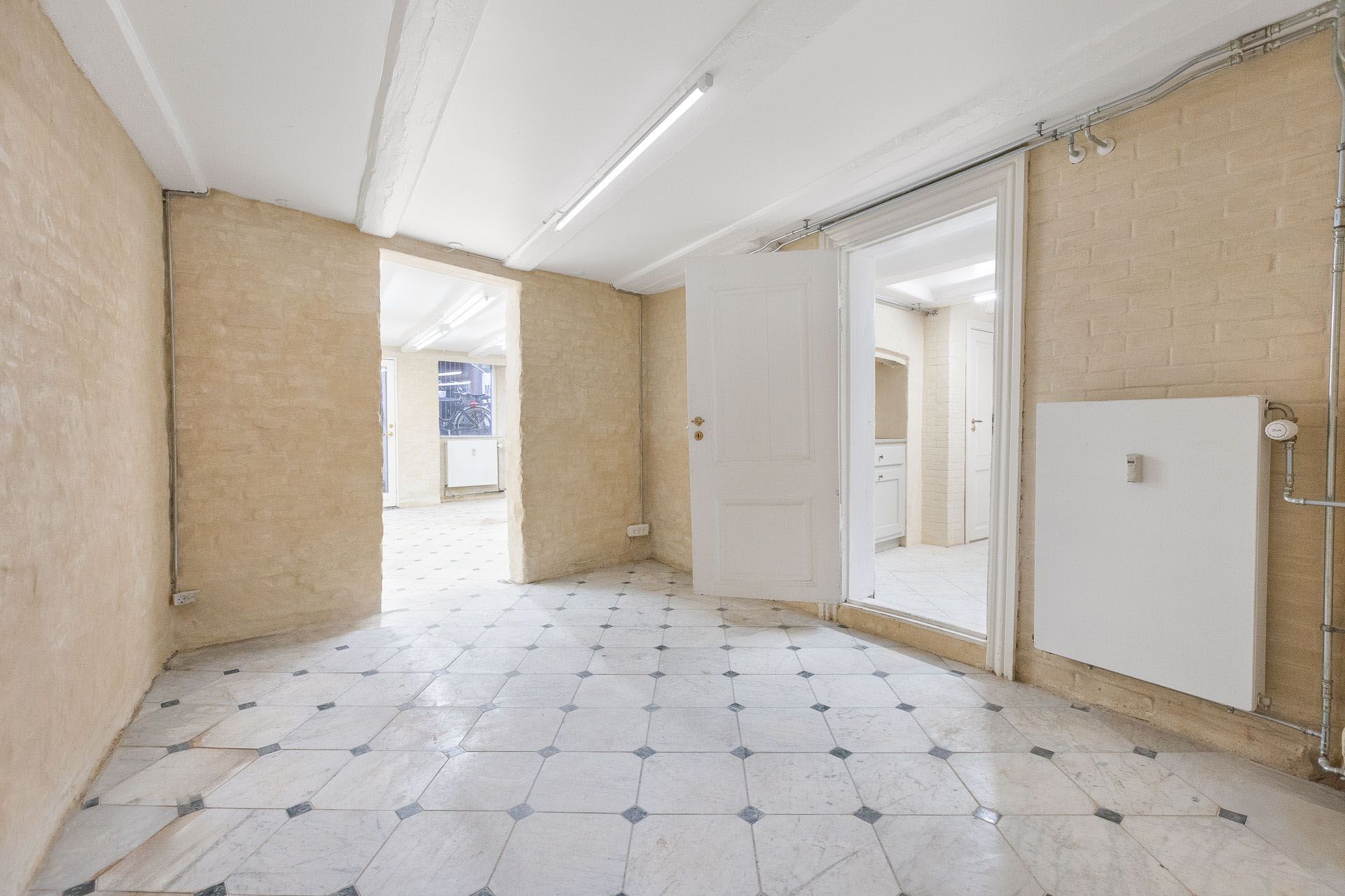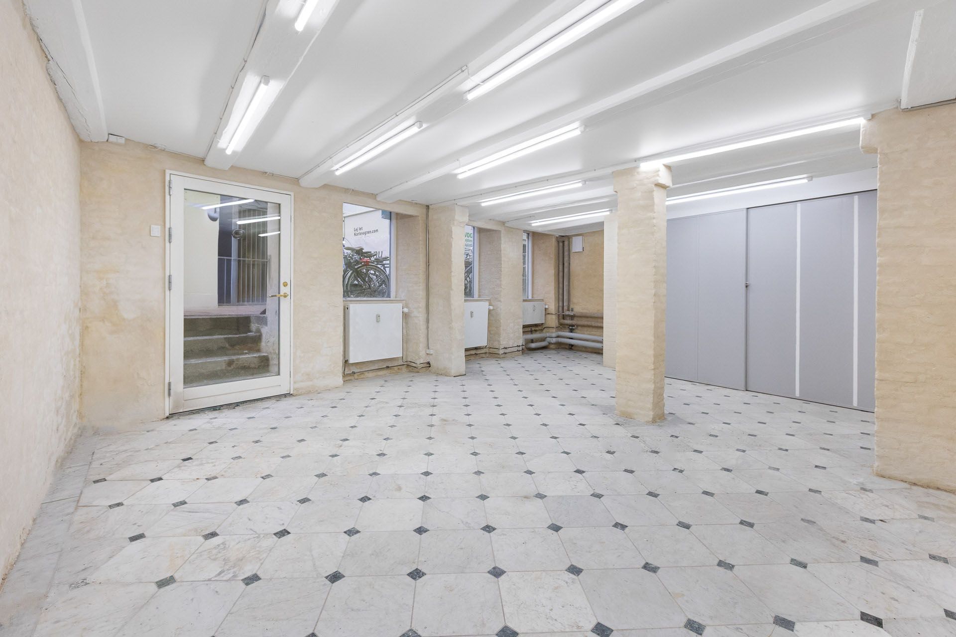 Lejemålets gulve er belagt med flotte lyse marmorfliser og alt fremtræder i en flot og indbydende stand med. bl.a. nypudsede vægge. Bemærk at den nederste del af ejendommens facade bliver pudset op og malet til foråret.