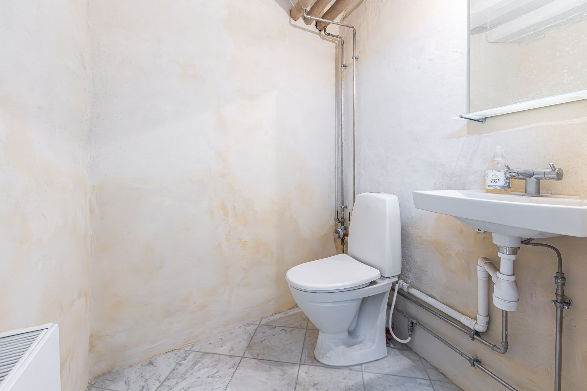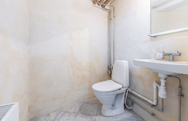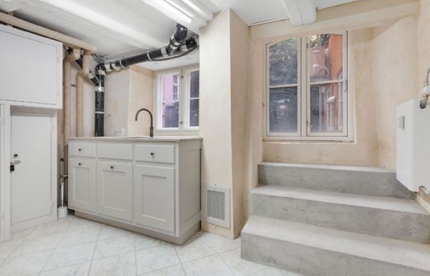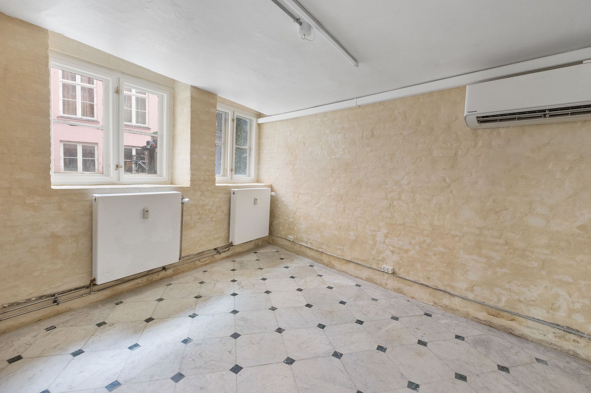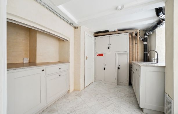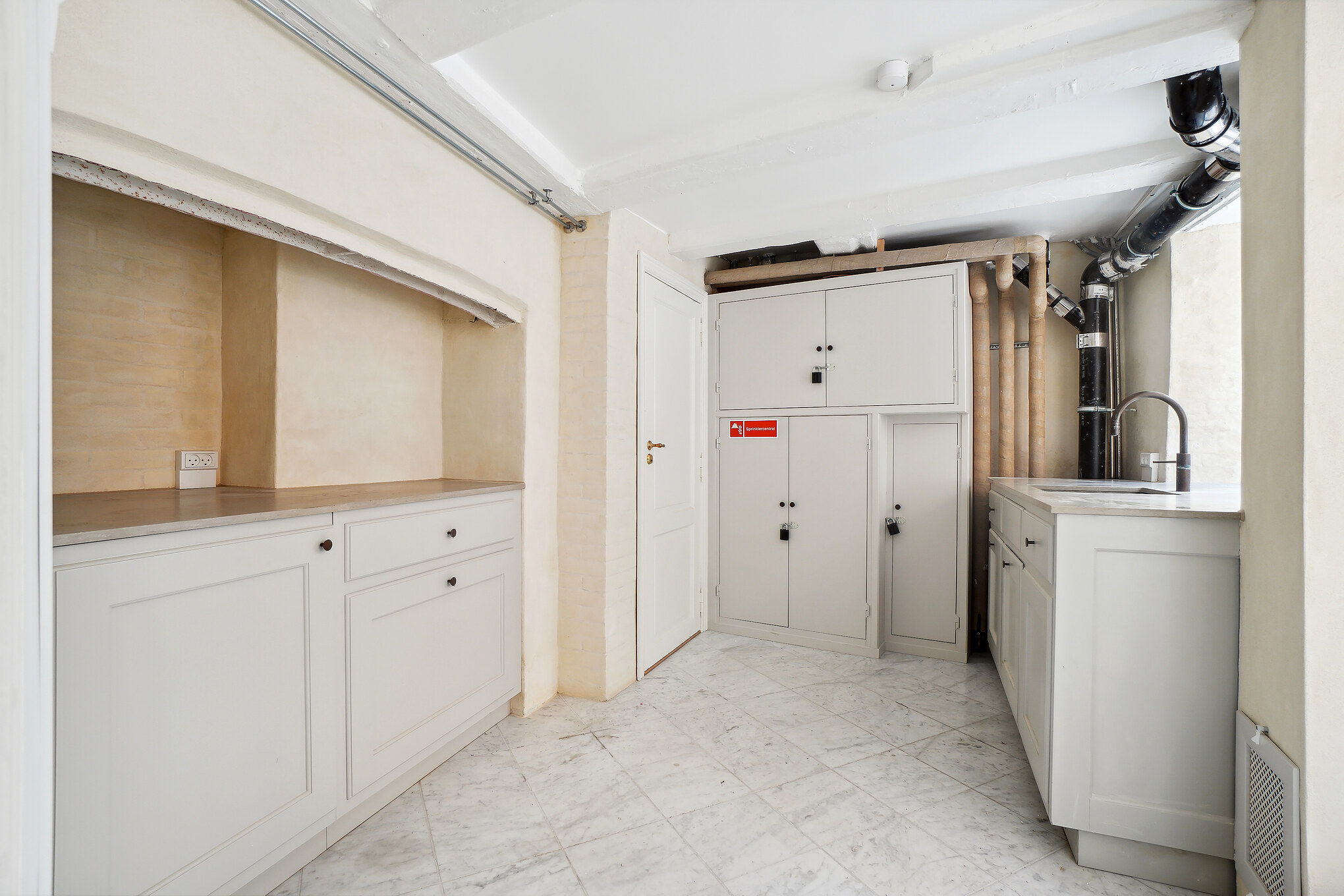 Lejemålets gulve er belagt med flotte lyse marmorfliser og alt fremtræder i en flot og indbydende stand med. bl.a. nypudsede vægge. Bemærk at den nederste del af ejendommens facade bliver pudset op og malet til foråret.