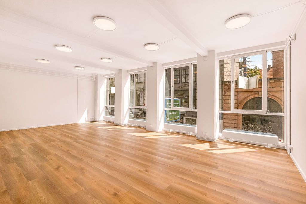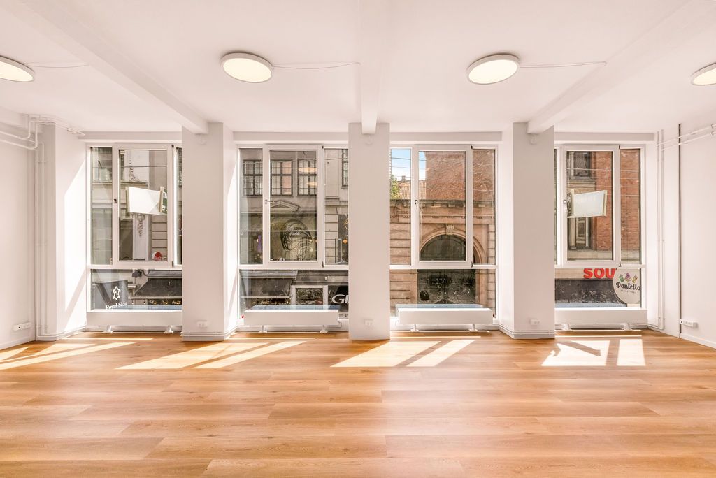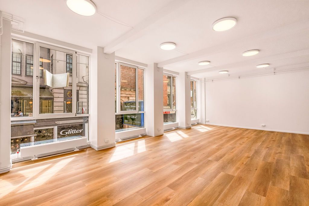 Lyst, indbydende og total nyistandsat showroom på 114 m² indeholdende stort showroom mod Strøget, separat kontor/ mødelokale mod gården, flot nyt køkken samt pænt nyt toilet. Derudover mindre depotrum på trappen.