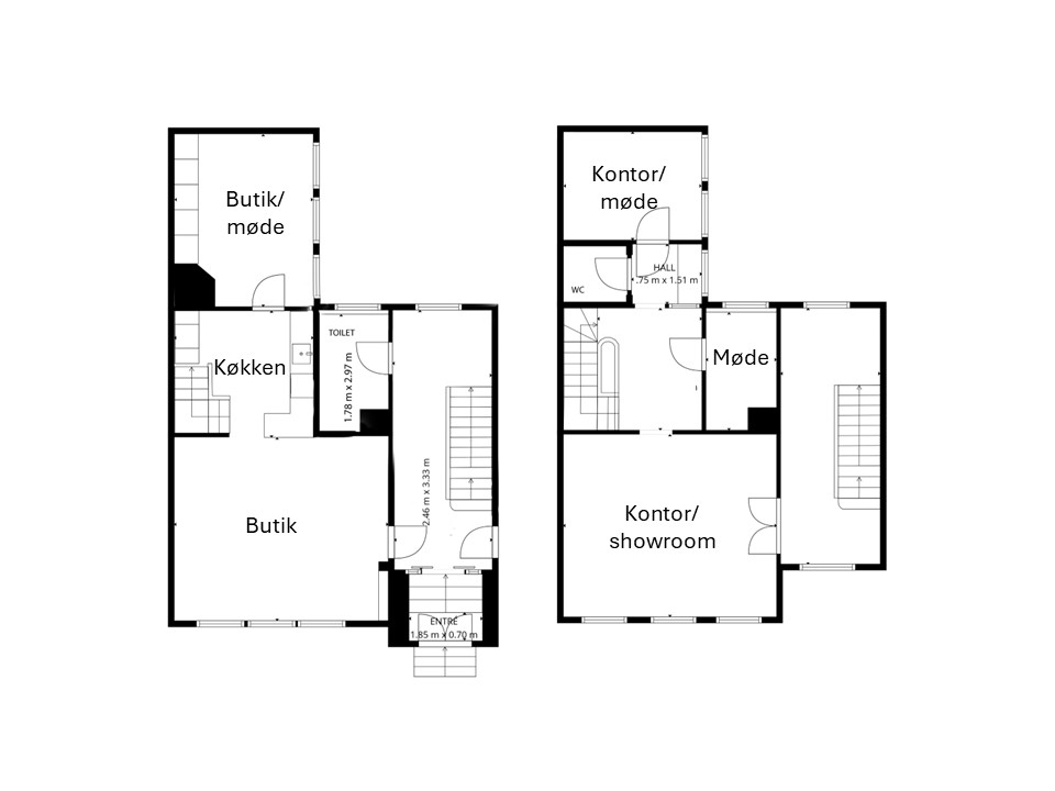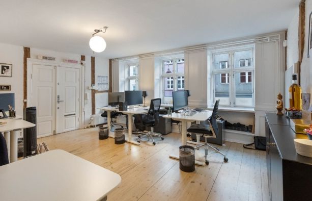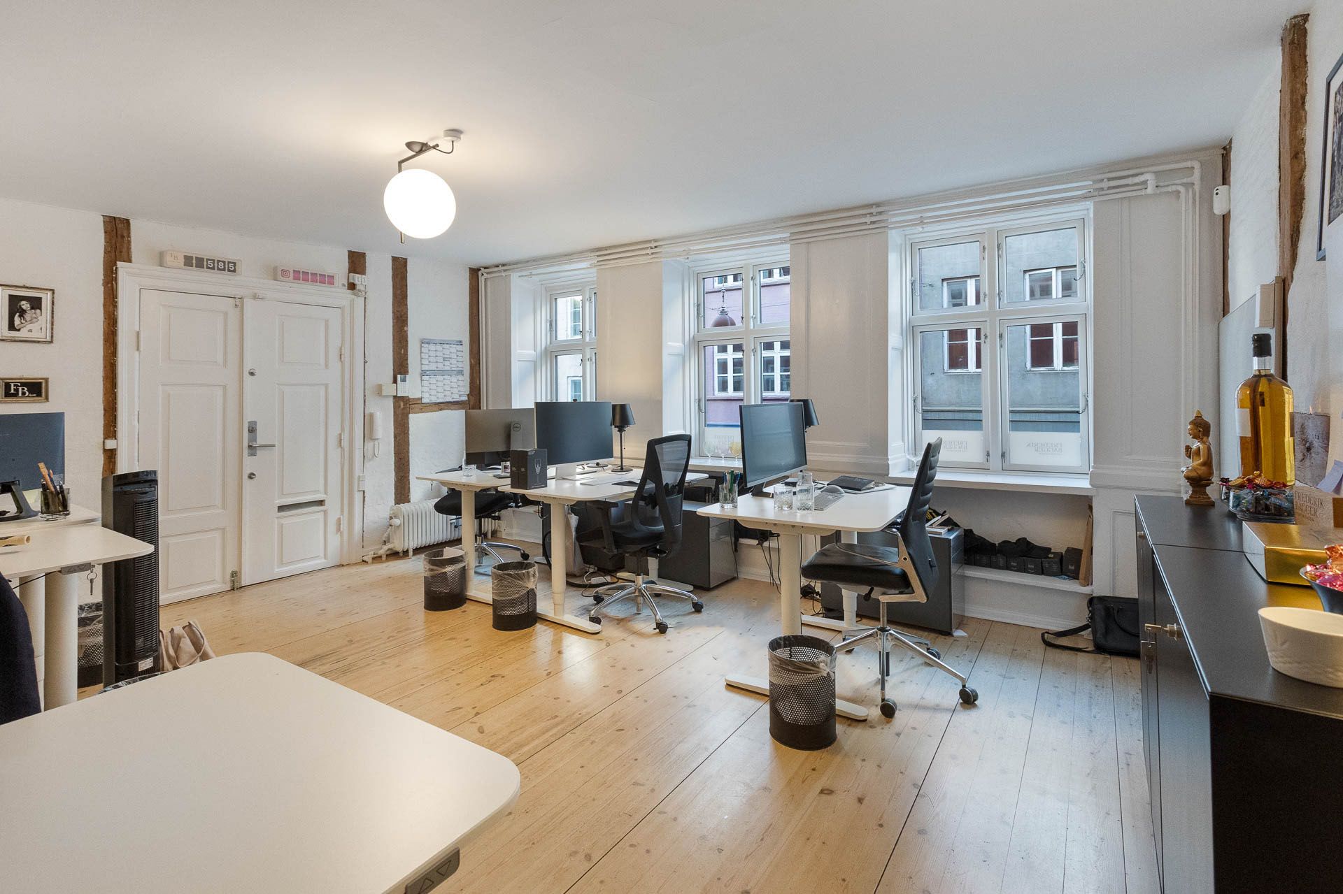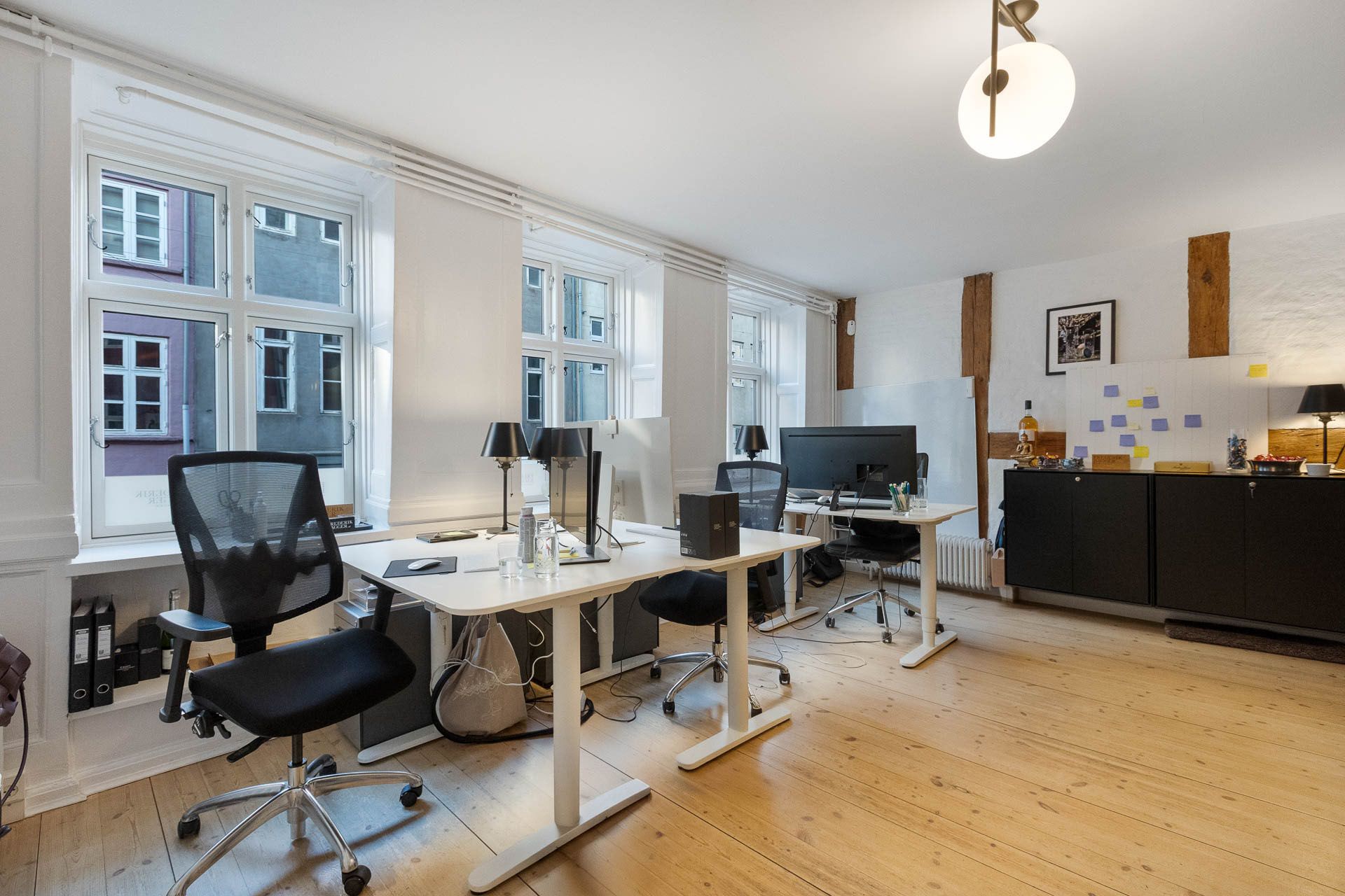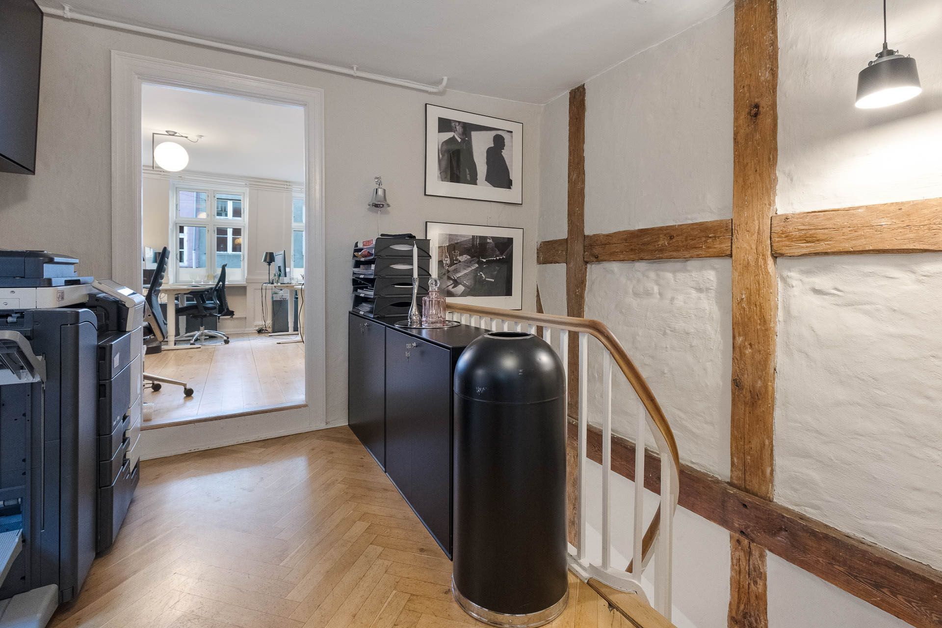 1. salen er ligeledes registreret som butik, men benytter pt. som kontor for den nuværende lejer. Denne etage indeholder 2 møderum, toilet samt stort åbent kontorrum mod gaden.