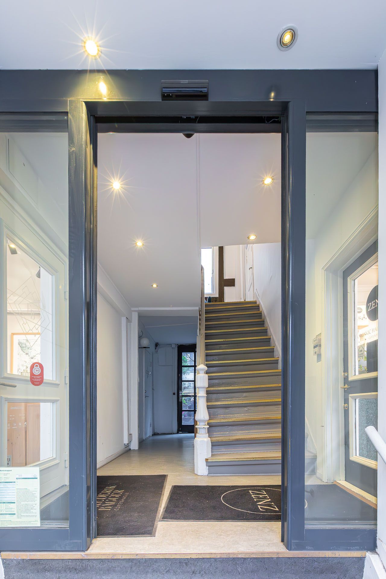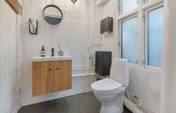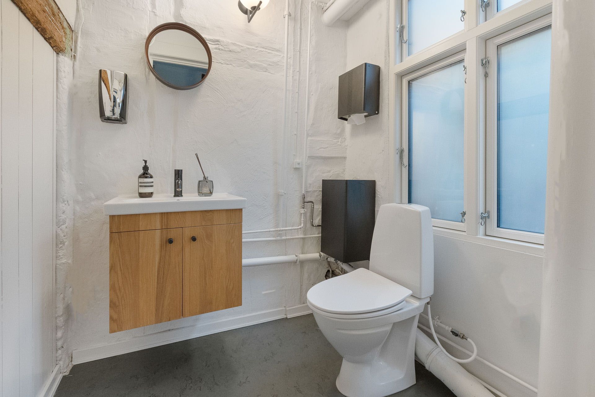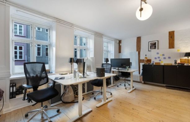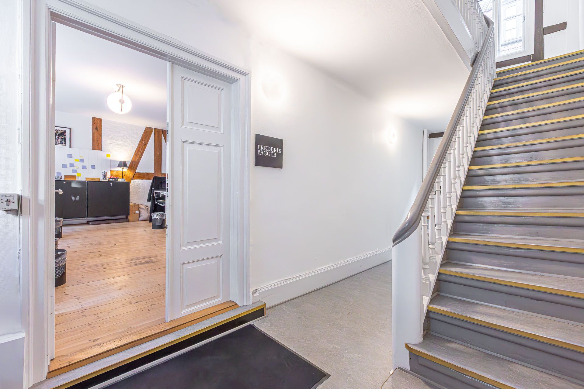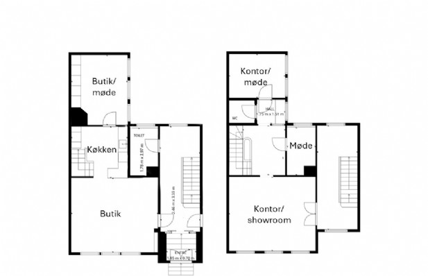 1. salen er ligeledes registreret som butik, men benytter pt. som kontor for den nuværende lejer. Denne etage indeholder 2 møderum, toilet samt stort åbent kontorrum mod gaden.