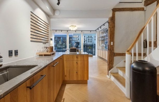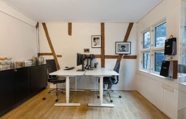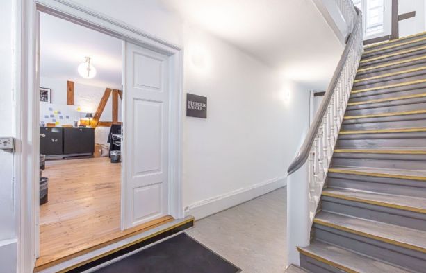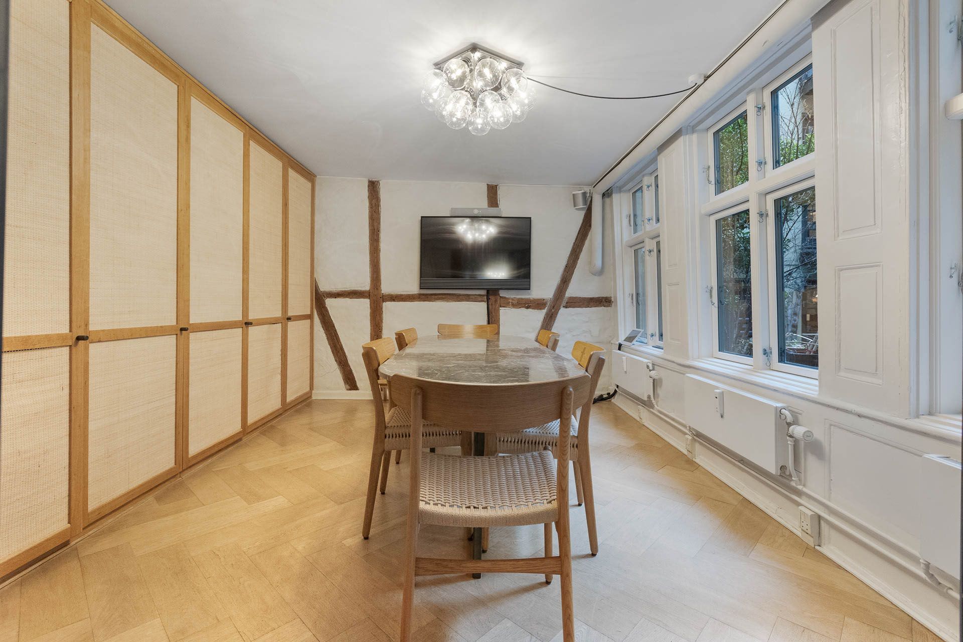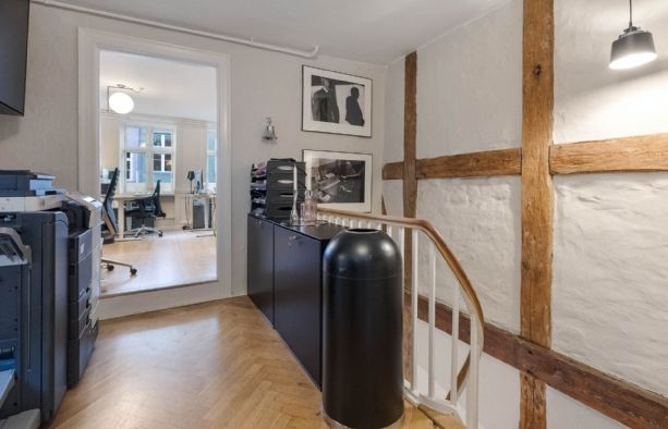 Charmerende detaljer med bl.a. sildebensparket og blotlagte bjælker - lejemålet fordeler sig over 2 plan