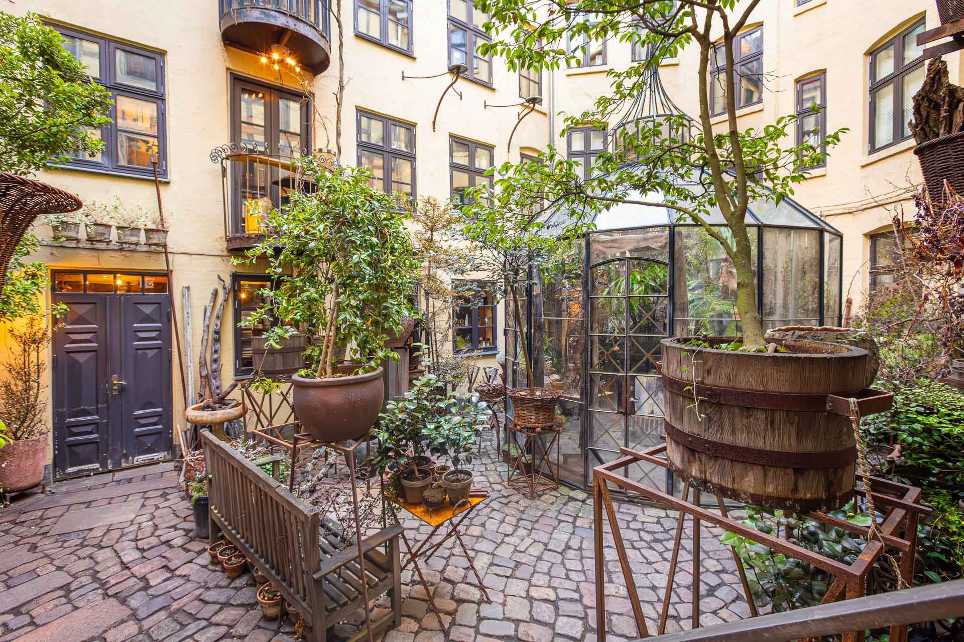 Gården fremstår meget idyllisk og her kan man nyde de mange smukke planter og det store voliere, hvor fuglenes kvidren er med til at skabe en helt særlig stemning. Det er en af ejendommens andre lejere - Tage Andersen - som har indrettet store dele af gården og som lejer har man adgang til delene udenfor volieret.