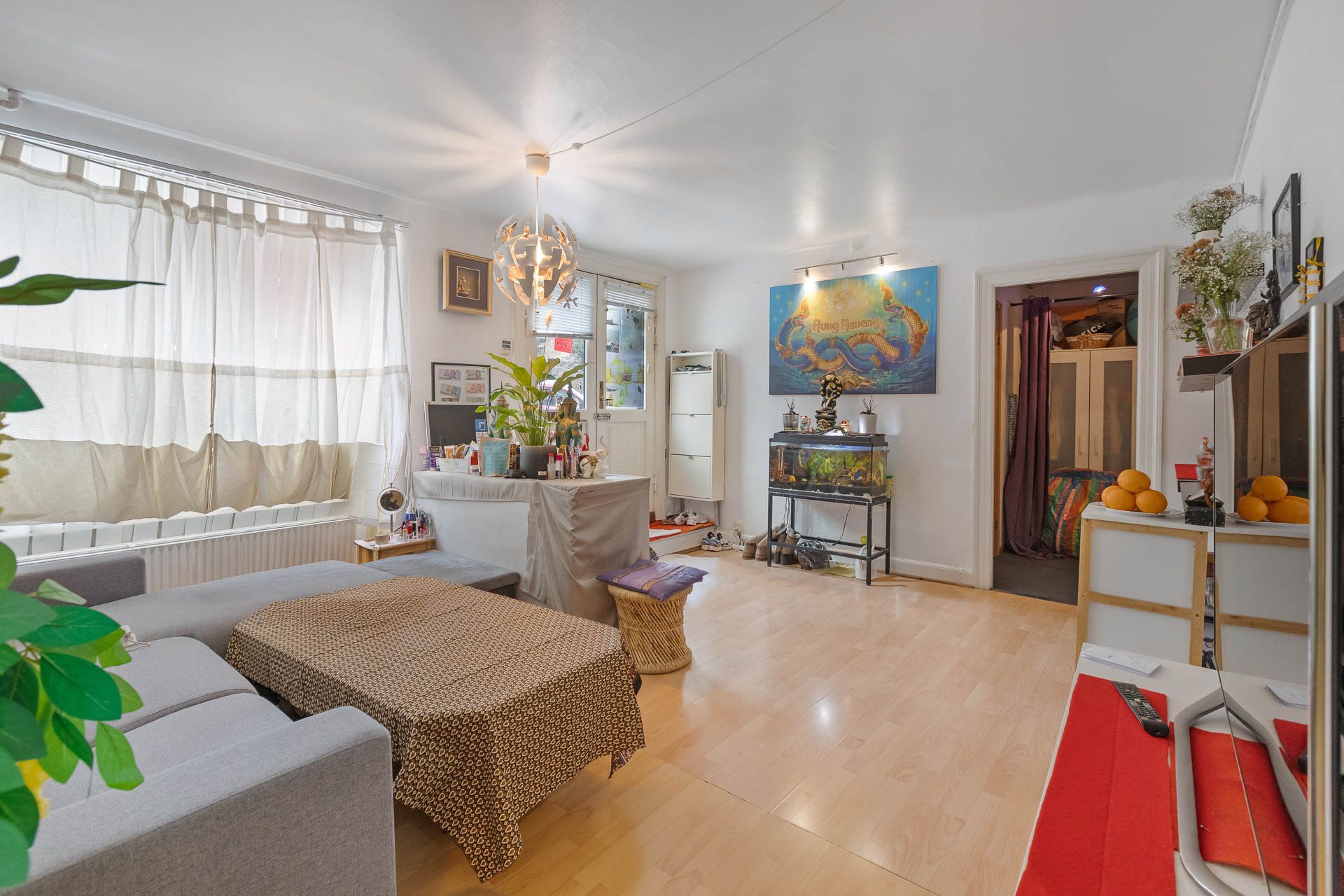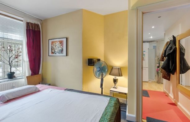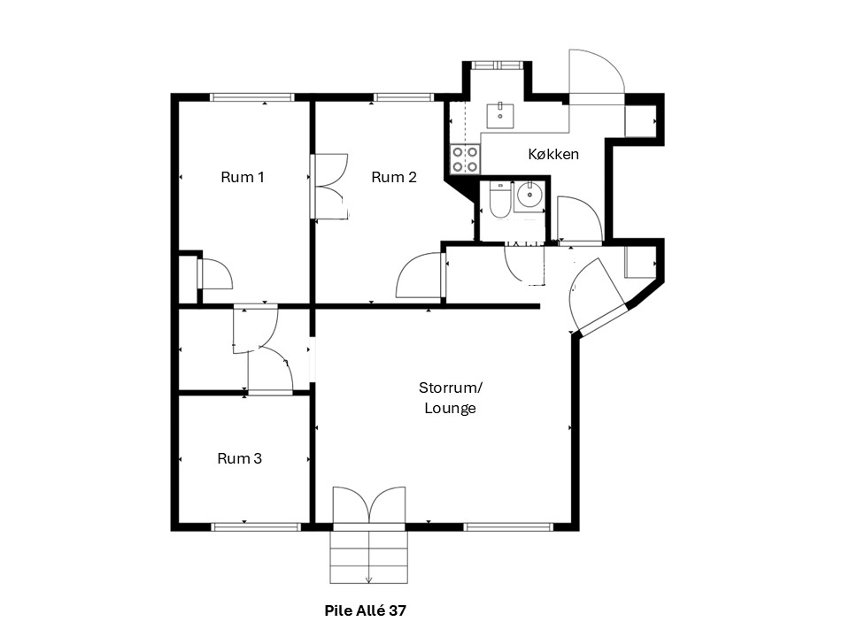 Fra gaden er der kun 2 trin ned til ejerlejlighedens egen indgang med dobbelte døre. Herfra træder man ind i et stort, lyst og og indbydende lokale med stort vinduesparti mod Pile Allé. Derudover indeholder ejerlejligheden 3 regulære separate rum, toilet og køkken. Fra køkkenet er der adgang til ejendommens bagtrappe, hvorfra man kan komme ud i ejendommens hyggelige gård.
