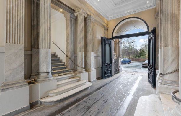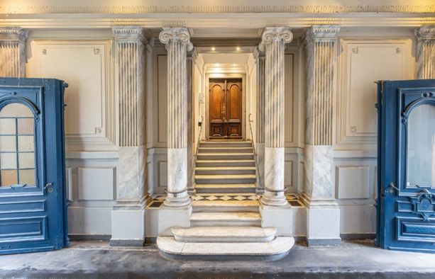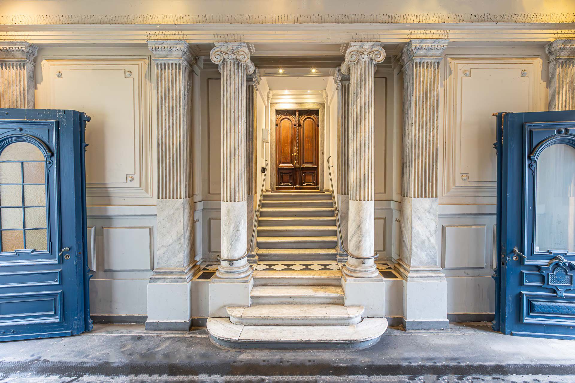 Ankomst til lejemålet sker via smukt portrum med flotte marmorsøjler. Herfra har lejemålet egen privat indgang via bred trappe og en flot massiv hoveddør med smukke udskæringer.