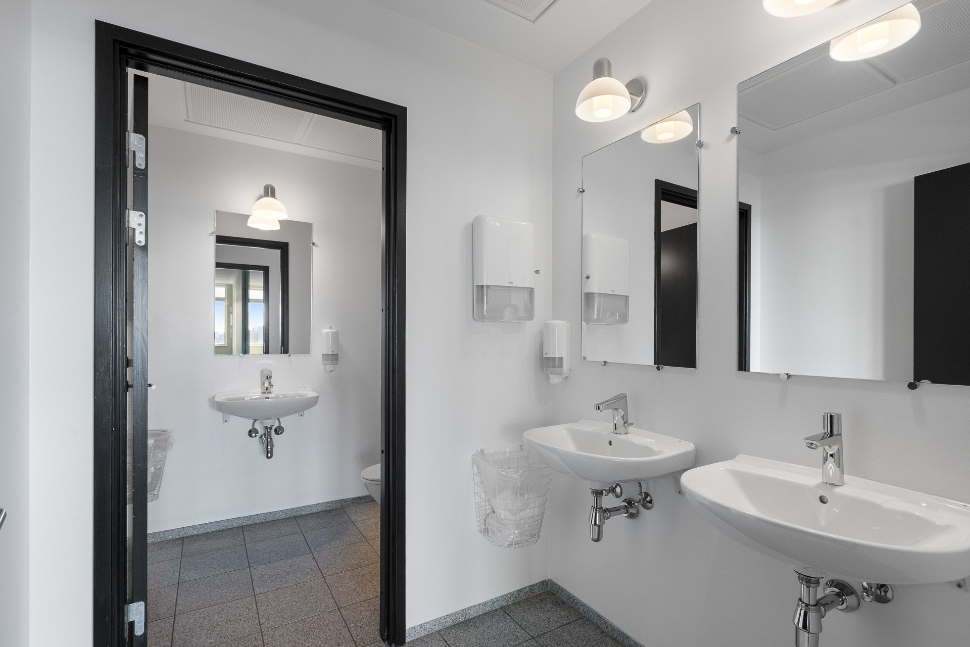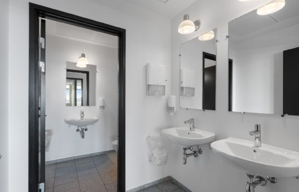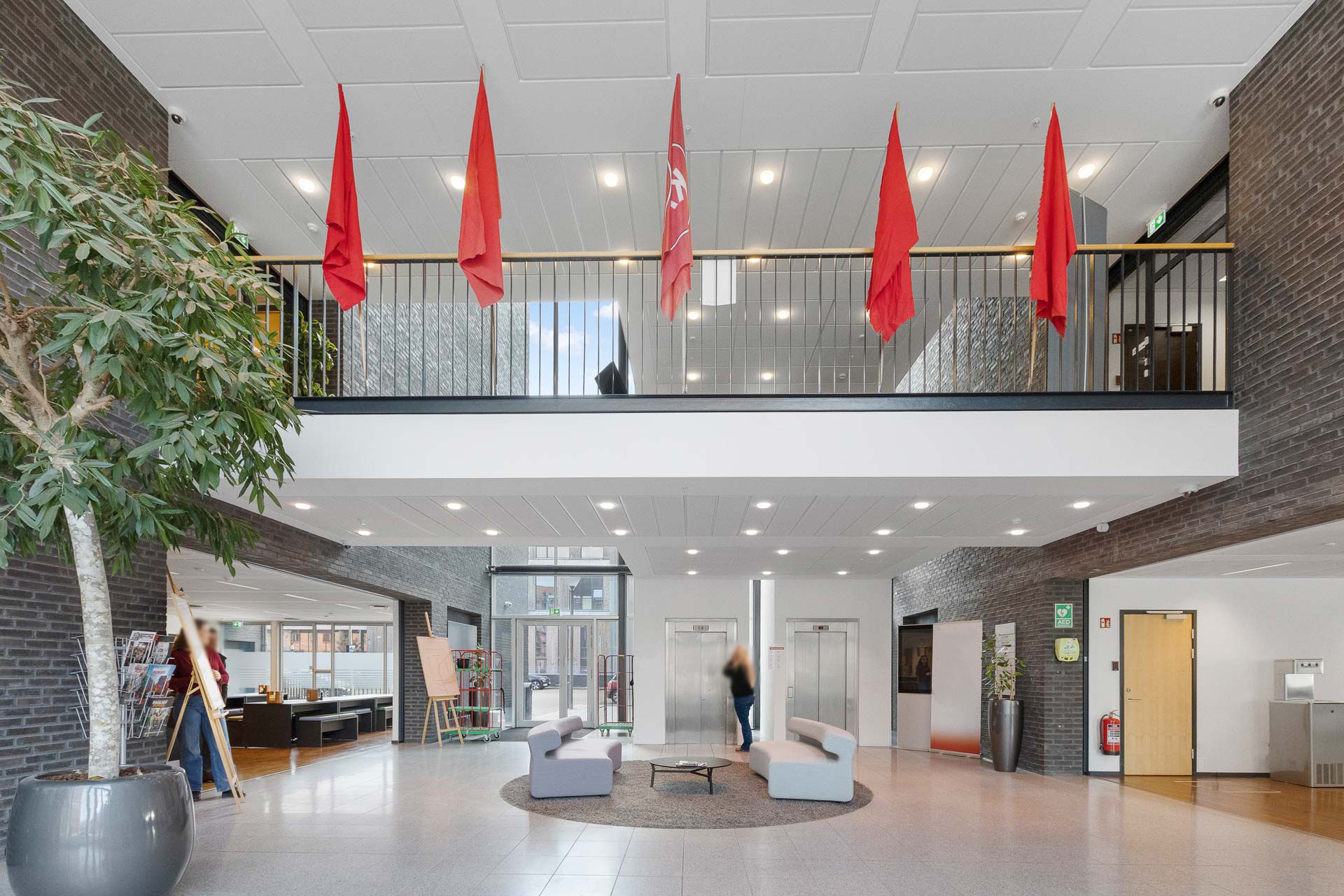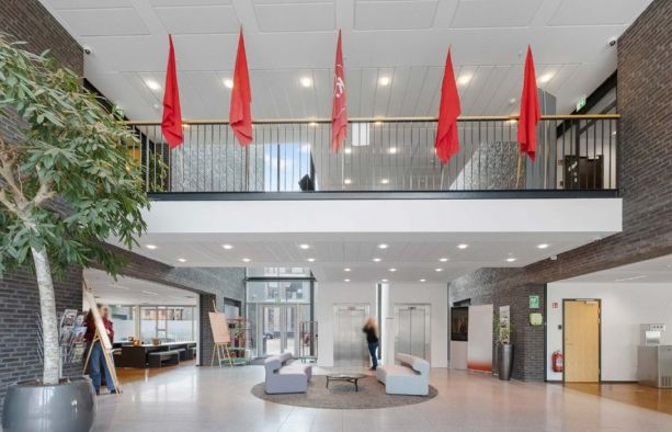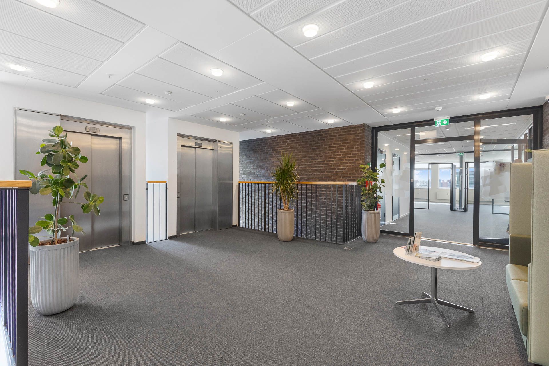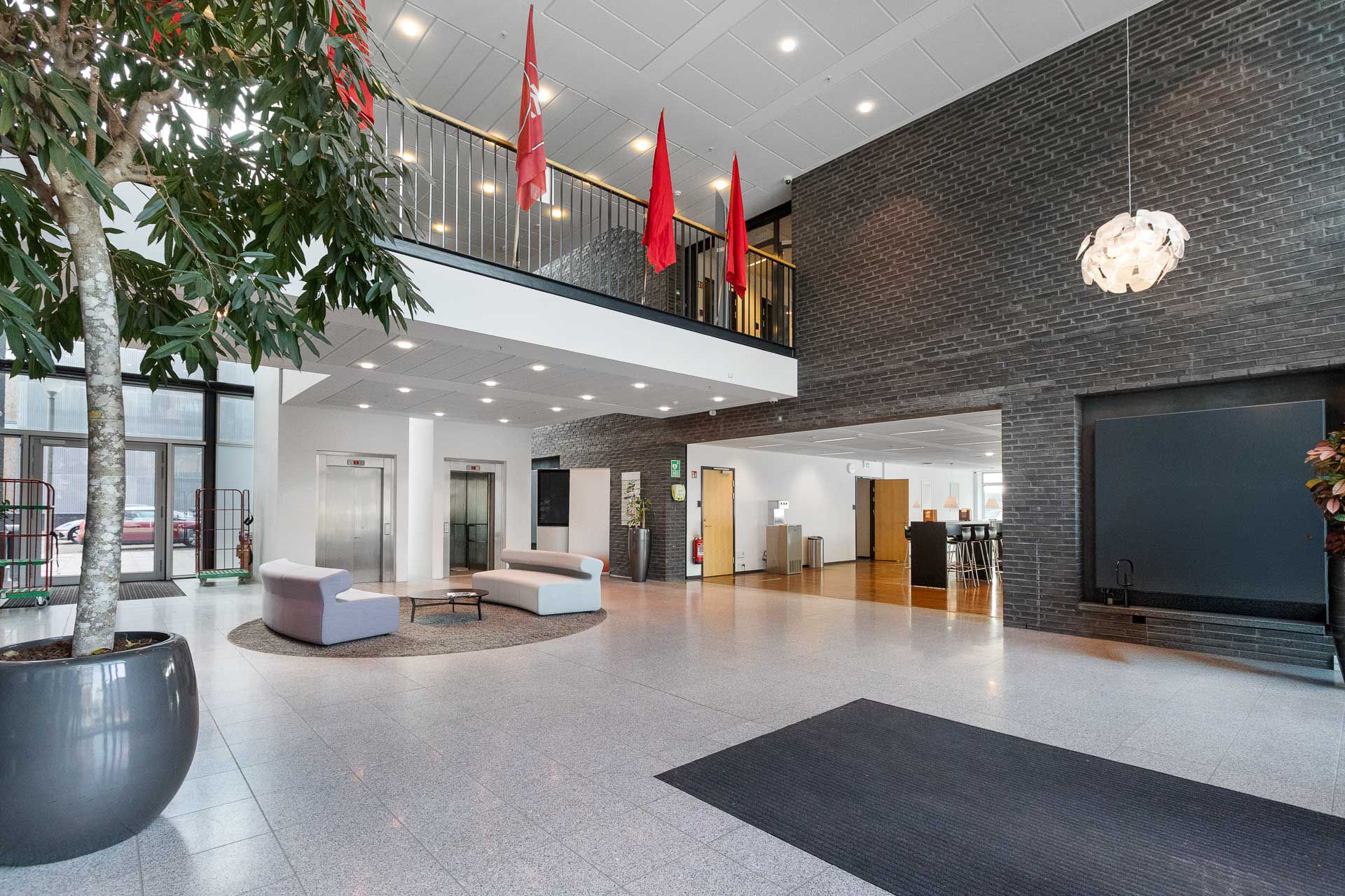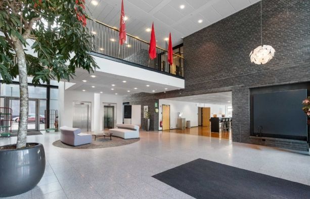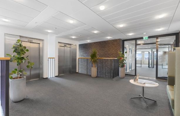 Ejendommen byder på et repræsentativt ankomstparti med elevator, der leder op til et flot møbleret loungeområde, som skaber en imødekommende ramme for både medarbejdere og gæster.