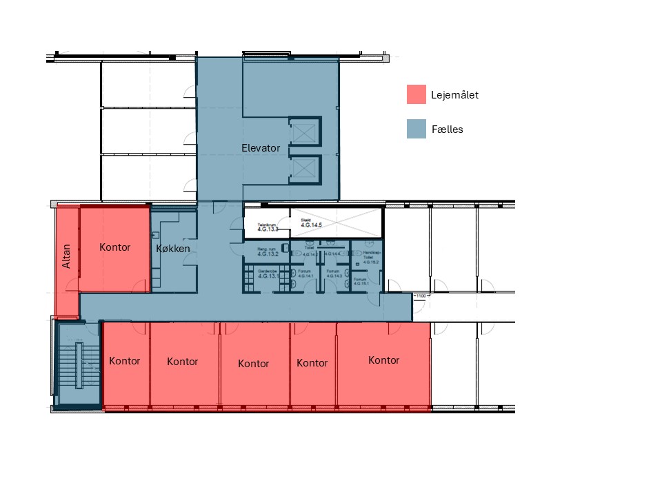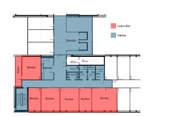 Lejemålet udlejes af FOA, som ligeledes har kontor på denne etage. Indretningen er funktionel og fleksibel med i alt 6 aflukkede kontorer i forskellige størrelser, samt plads til ca. 20 arbejdspladser. På etagen deler man fælles faciliteter med FOA, herunder bl.a. køkken, toiletter, bad og kopirum. Som lejer får man desuden adgang til et stort professionelt mødecenter på 3. sal med mødelokaler i størrelser fra 2 til 40 personer samt adgang til en lys og attraktiv kantine.