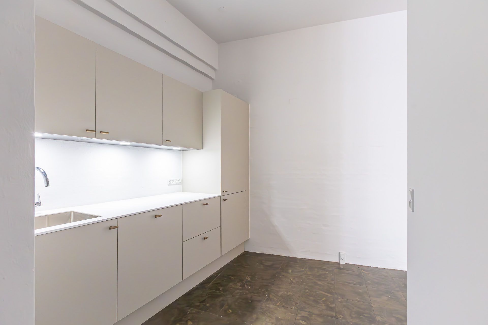 Lejemålet fremstår meget indbydende og komplet istandsat med smukt flisegulv med Ølandsfliser, pæne lofter med store indbyggede spot, samt helt nyt lækkert køkken med integrerede hårde hvidevarer samt pænt nyt toilet.