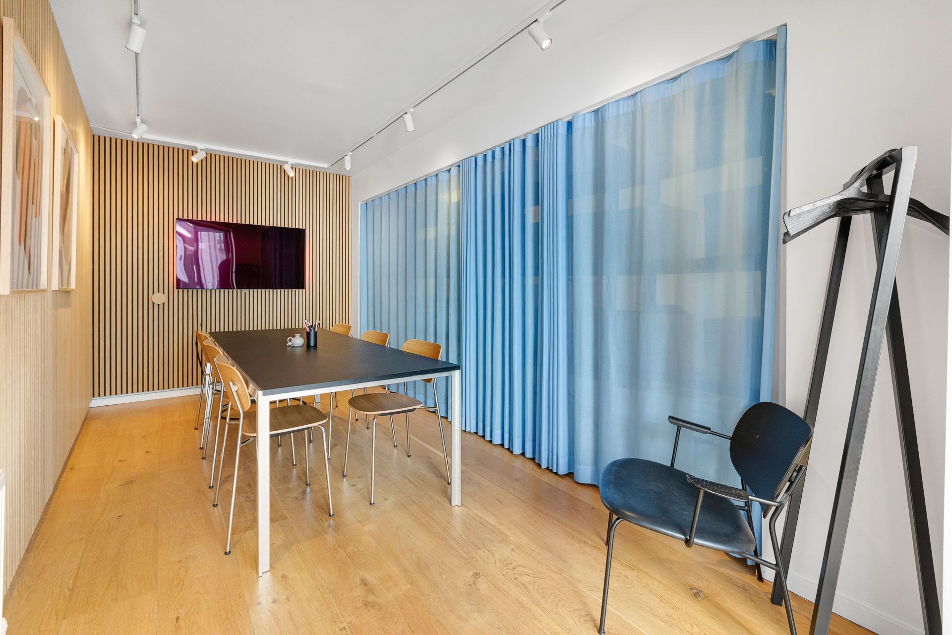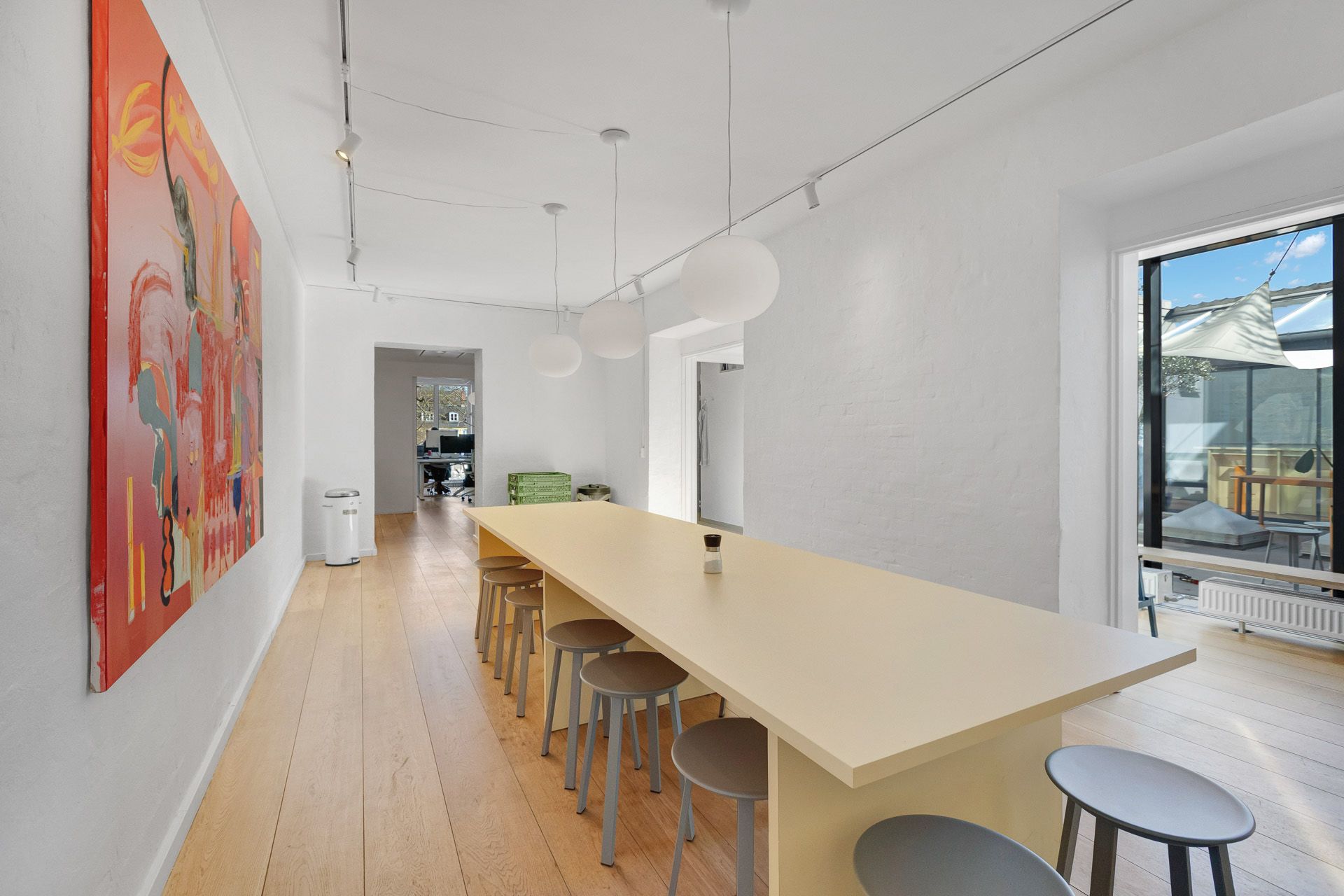 I forlængelse af det præsentable køkken er der et større åbent rum til kontor eller kantine. Derefter et større lokale til f.eks. møder eller studie til lyd eller foto, der er adskilt med én stor glasvæg ind til et separat mødelokale. I det bagerste hjørne er der endnu et stort kontor med separat depotrum og vinduer mod gårdhaven. Desuden indeholder lejemålet hele 3 nyere badeværelser, alle med brus.