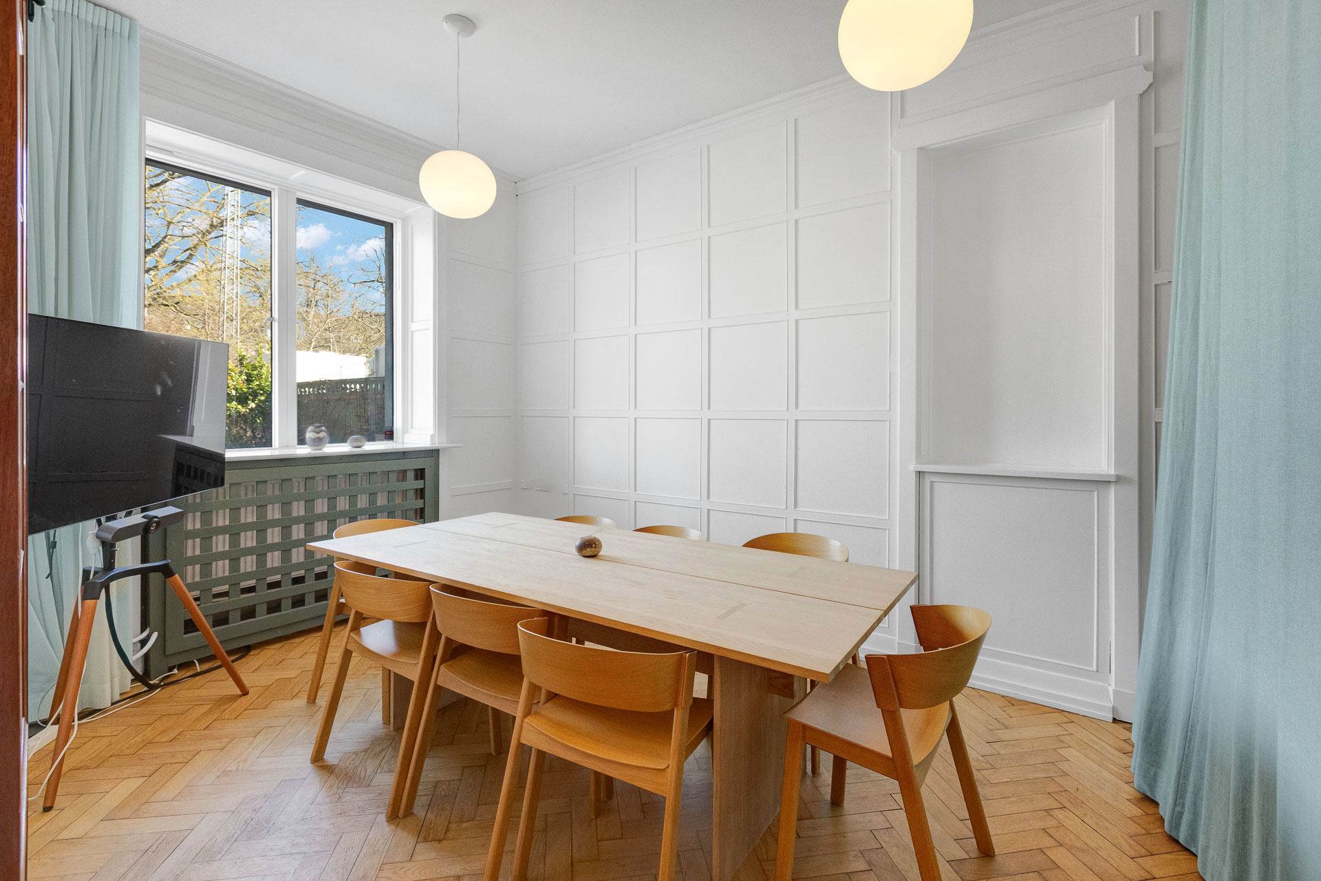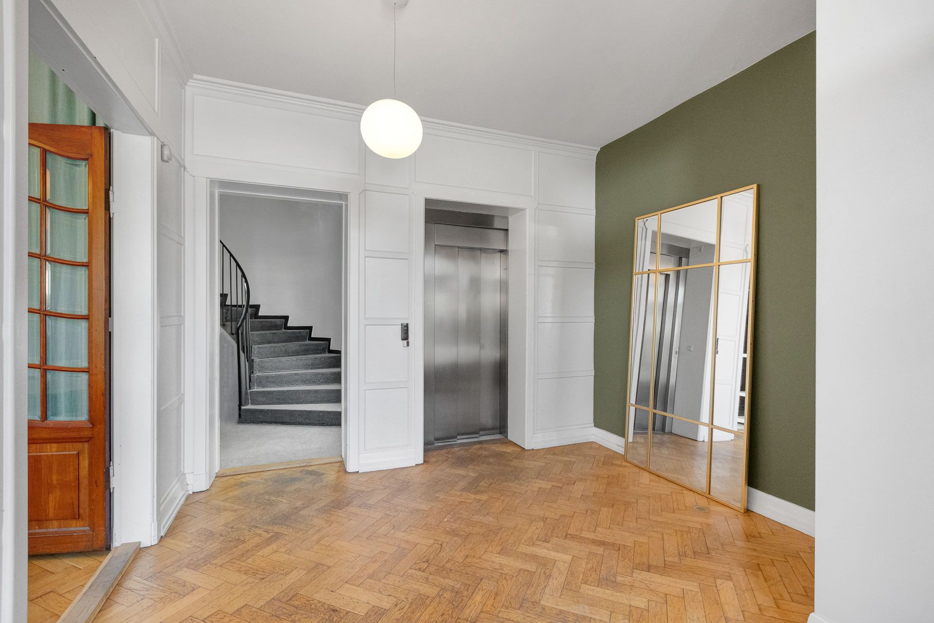 Hoveddøren fra den runde hovedtrappe fører direkte ind til forkontoret mod Allégade der har store vinduespartier med meget lysindfald og egen altan mod det foranliggende grønne område.