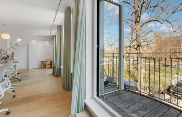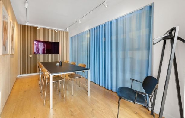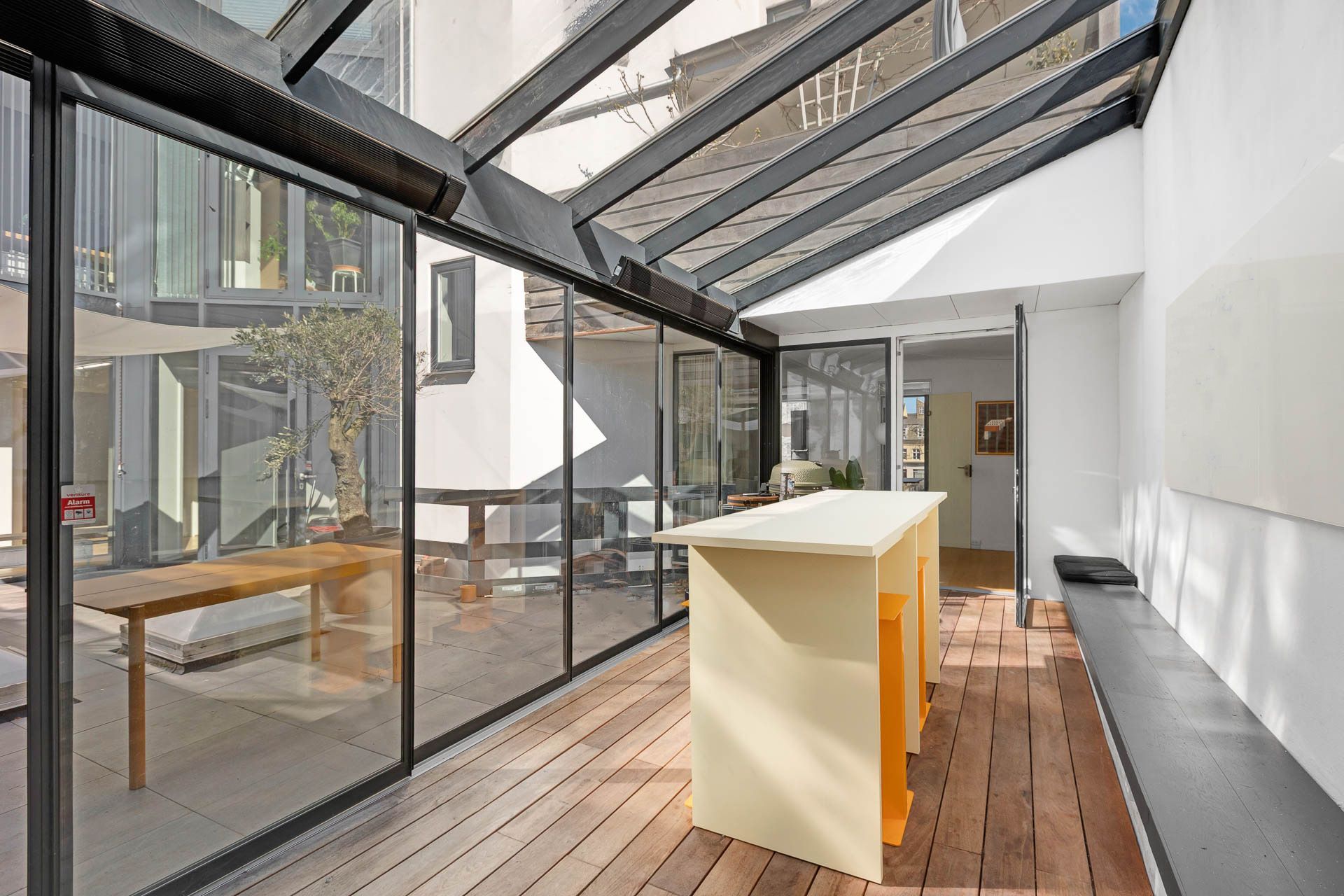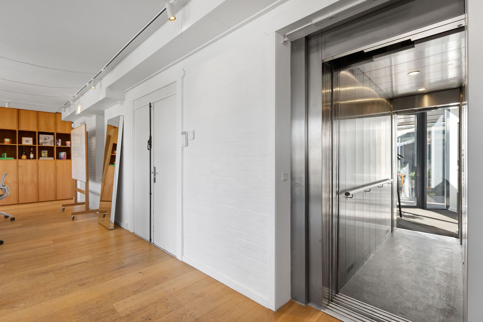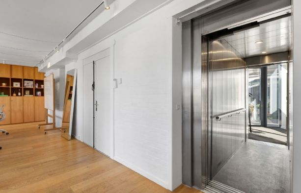 En delvist opvarmet udestue med skydedøre og glasloft forbinder det bagerste kontor med endnu et mødelokale der har glasdør til forkontoret. Dermed kan man komme hele vejen rundt i lejemålet og nyde udsigten til gårdhaven. Intern elevator giver direkte adgang til to sider og lejemålet kan derfor fint deles af to afdelinger, forbundne firmaer, flere behandlere eller andre.