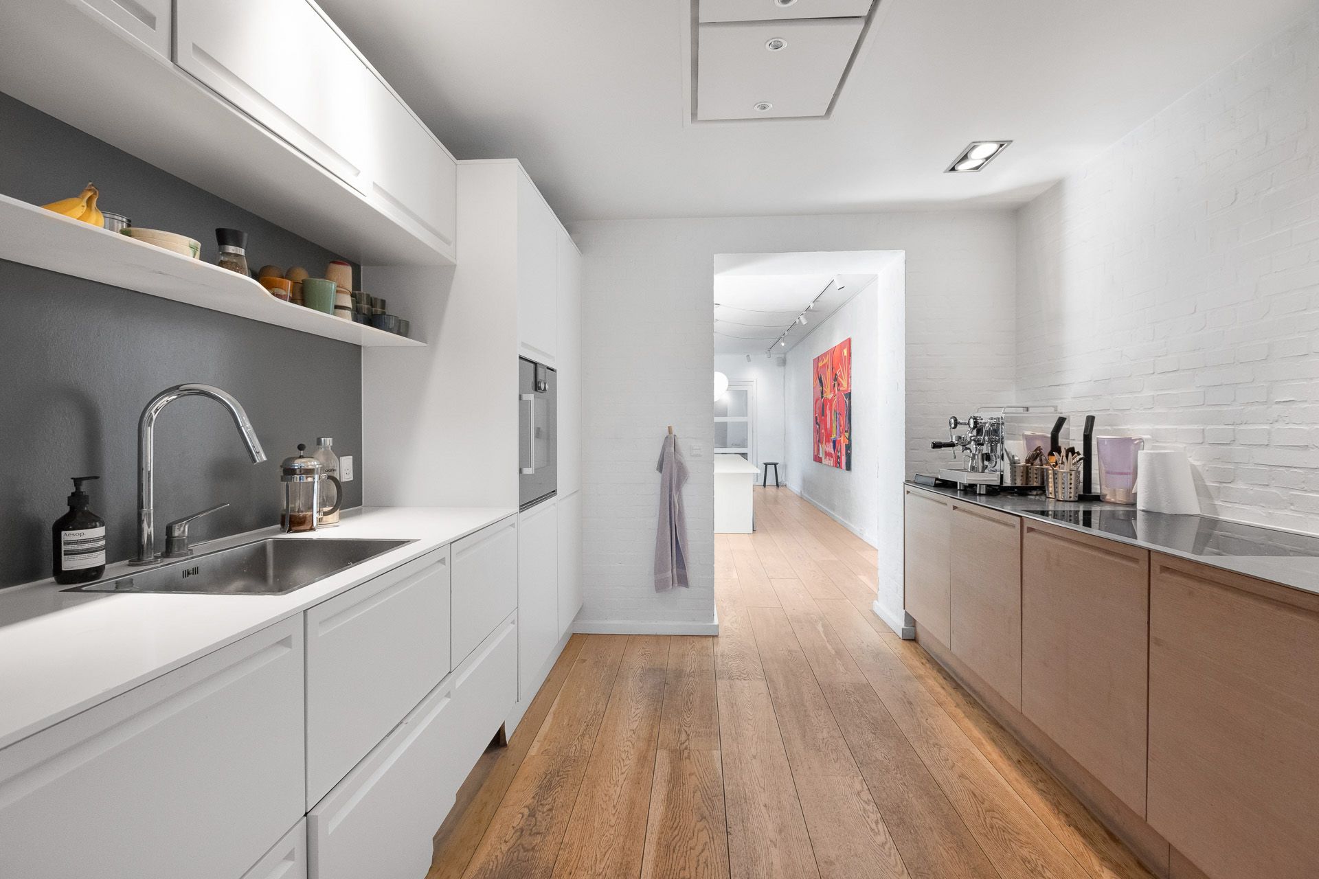Lejemålet indeholder et stort og flot forrum med parketgulv og højt til loftet. I forlængelse heraf er endnu et lokale til supplerende aktiviteter og bagerst et åbent køkken og lager, bl.a. til personalebrug. Der er desuden adgang til toilet i opgangen.