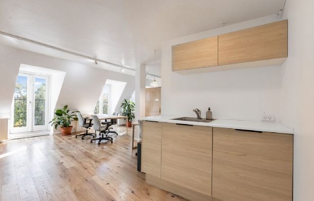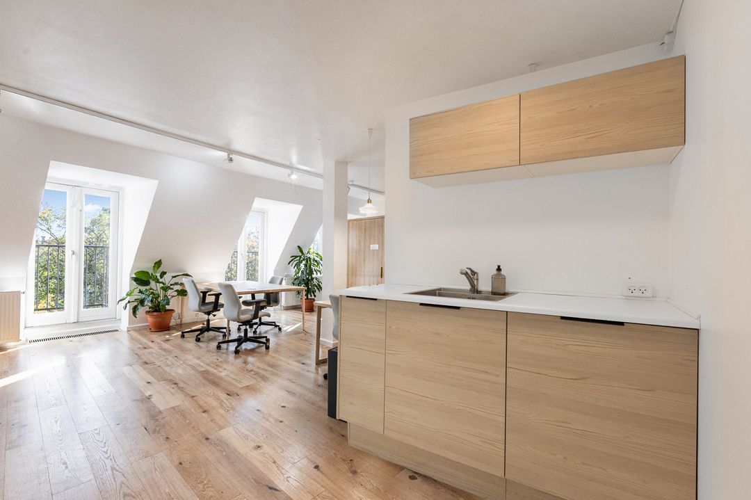 Herfra har man en skøn udsigt over Frederiksberg Have, samt tårnene i Carlsberg Byen. Derudover indeholder lejemålet et flot toilet med brus, nyere tekøkken, samt et aflukket kontor/mødelokale.