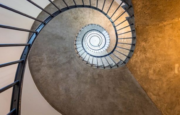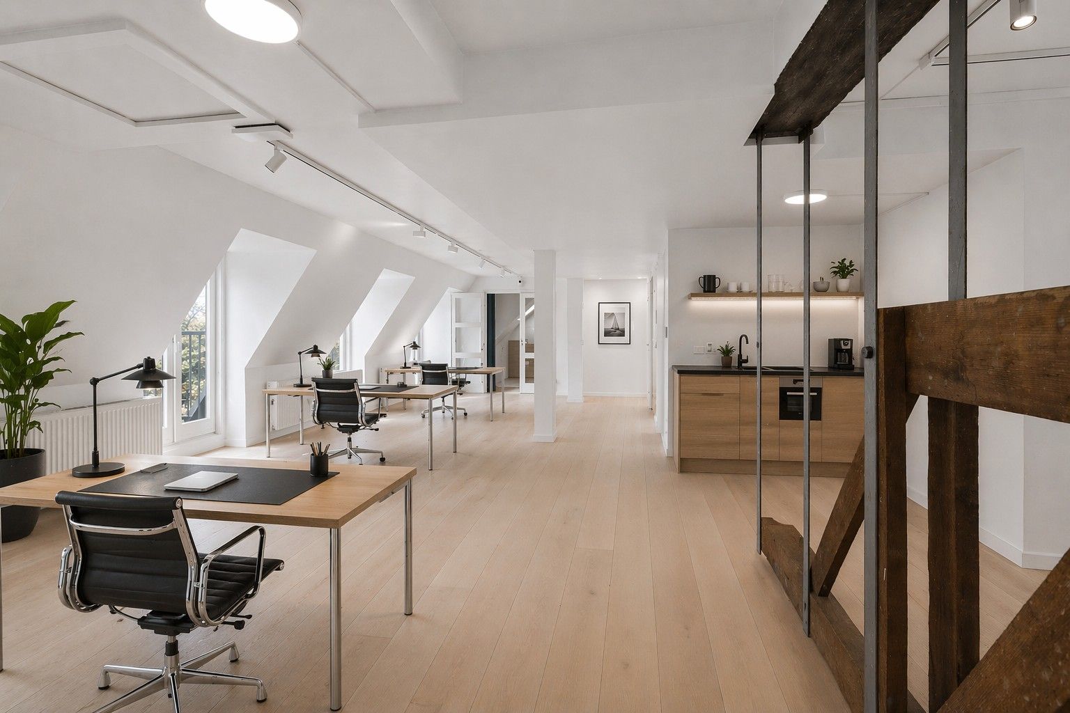 Et meget modernistisk lejemål med lysegråt epoxy-gulv, hvide vægge og en synlig bærende og rustik konstruktion, der visuelt opdeler det meget åbne kontor. Lejemålet er ledigt og klar til overtagelse.