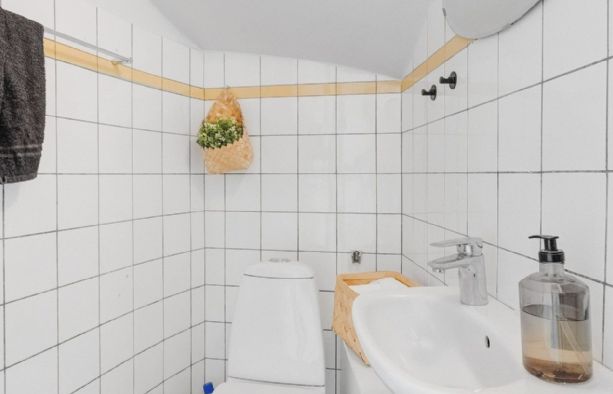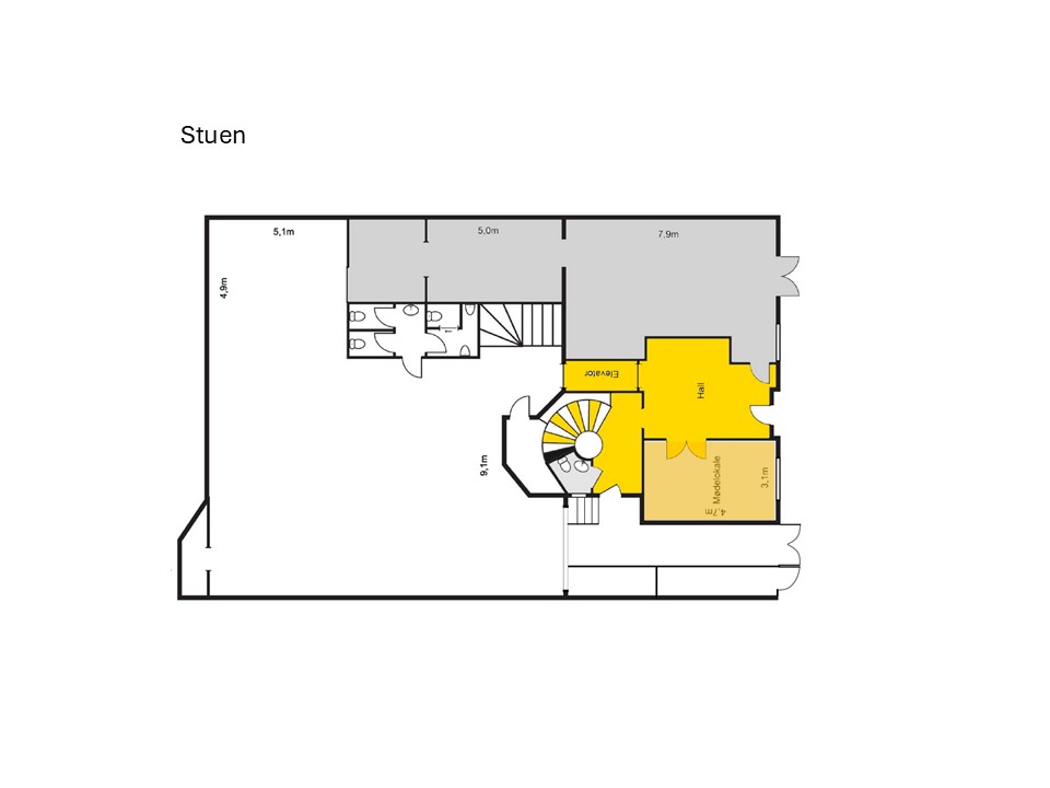 I stueplan til højre for hovedindgangen er indrettet 100 m2 showroom/butik, der kan overtages fra nuværende lejer. Her er adgang direkte fra gaden og via opgangen.
